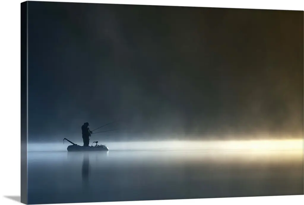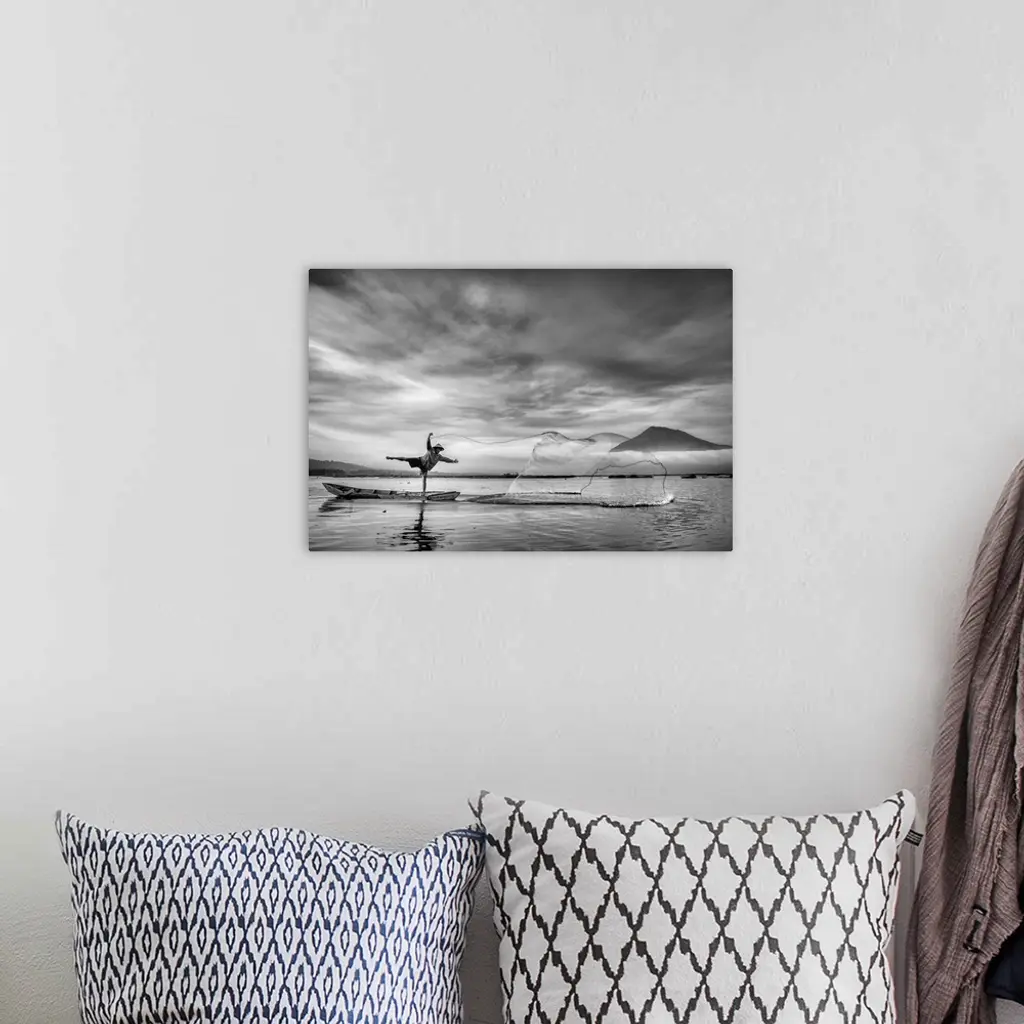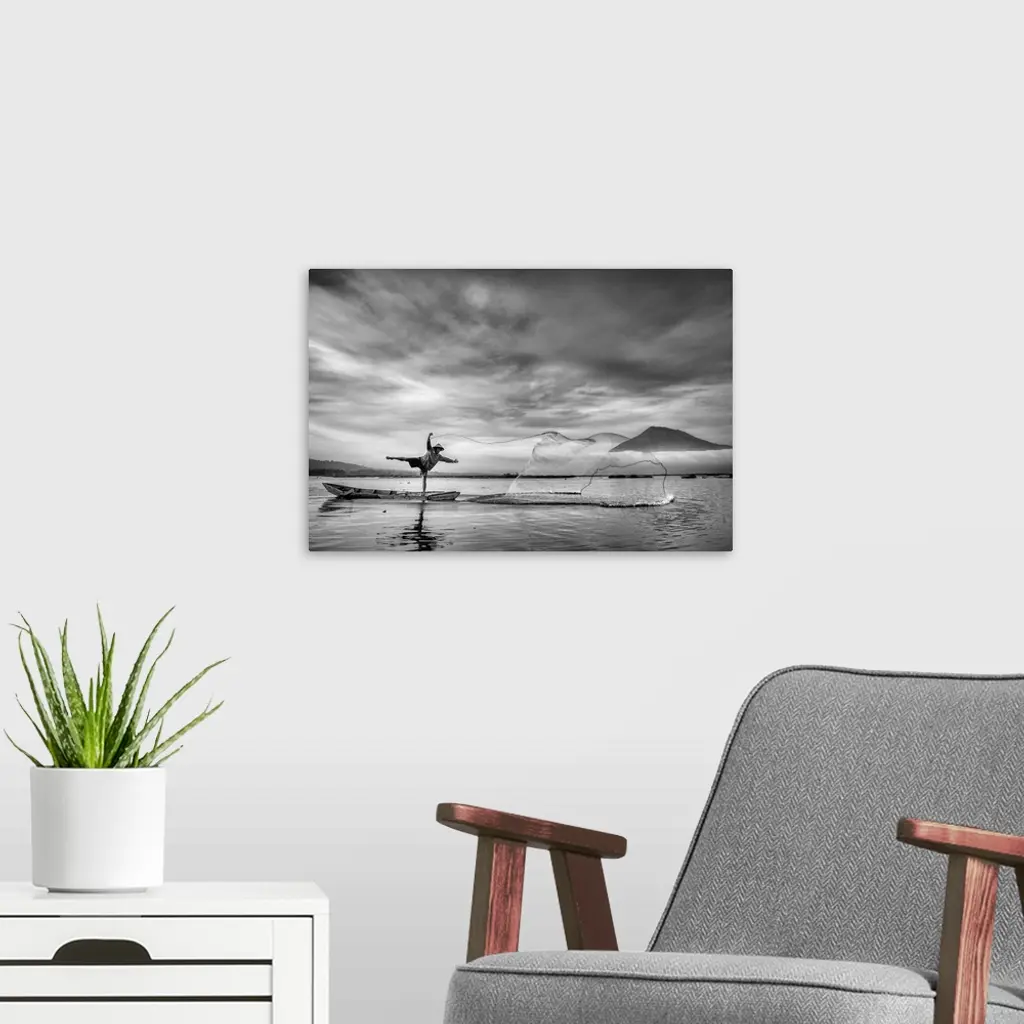 A man on a canoe strikes a pose as he skillfully throws a net into the water.