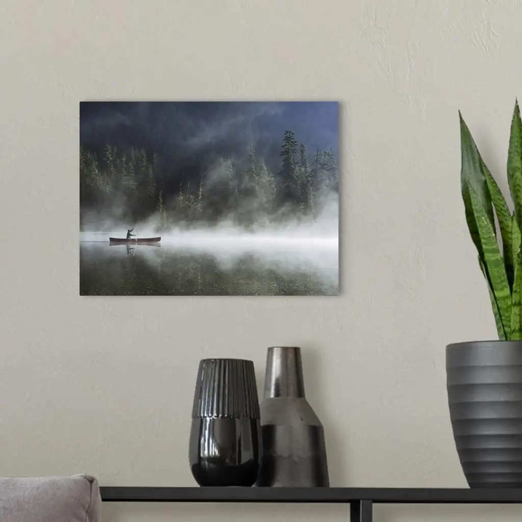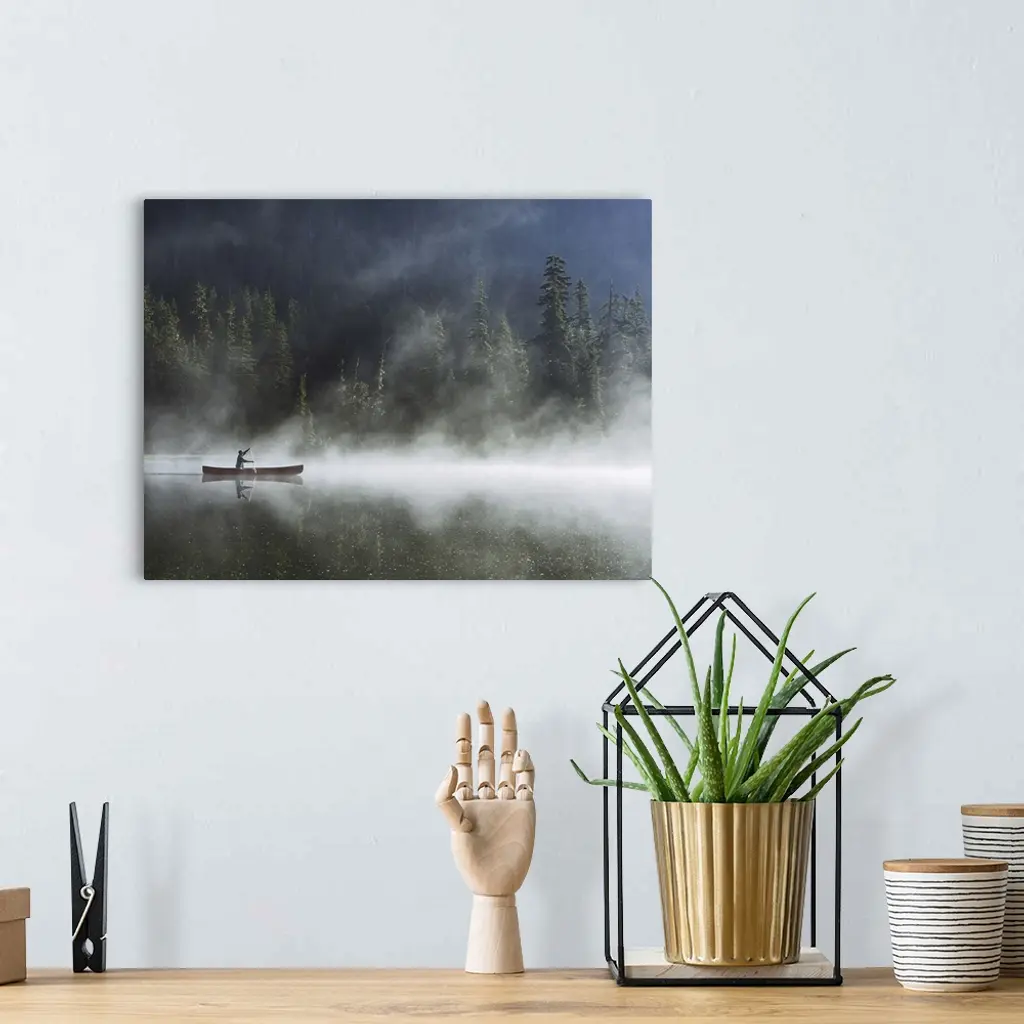 Man Canoeing On Lake Cover With Fog, Side View
