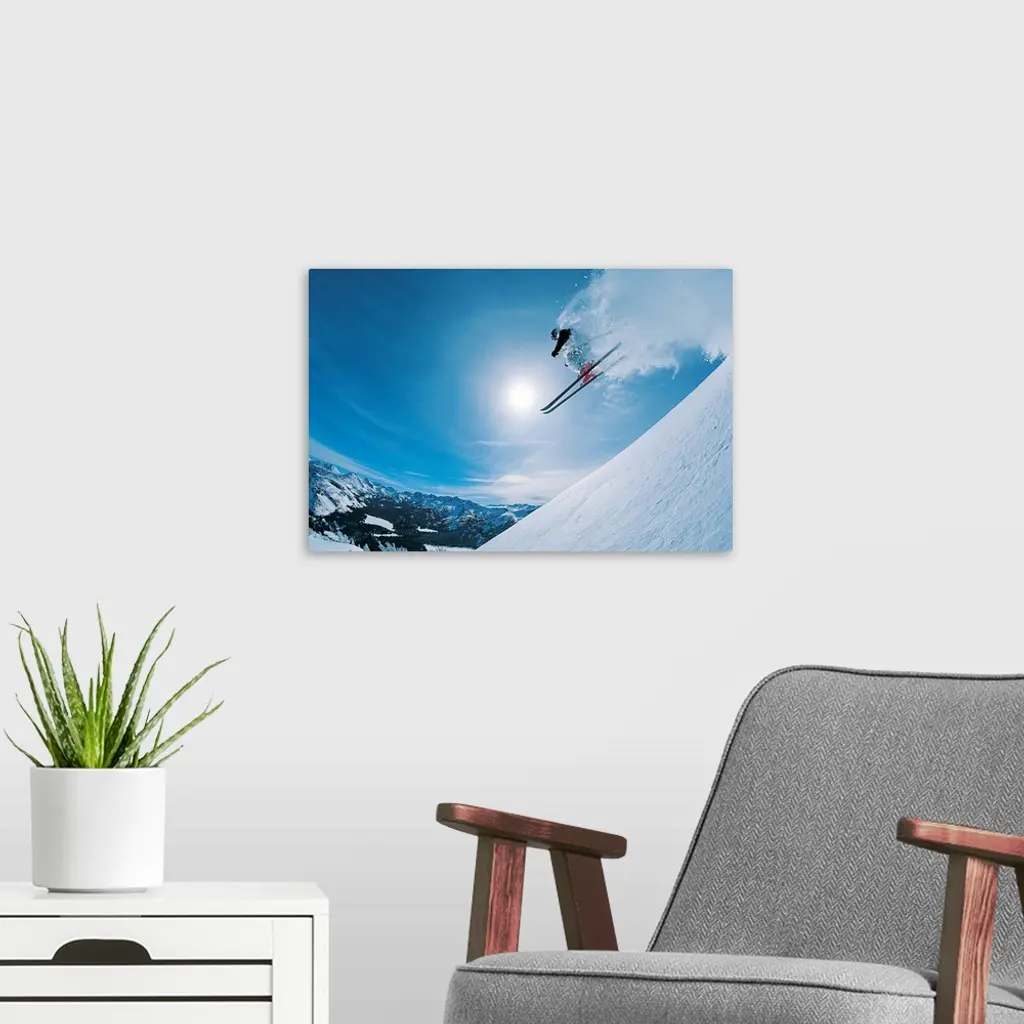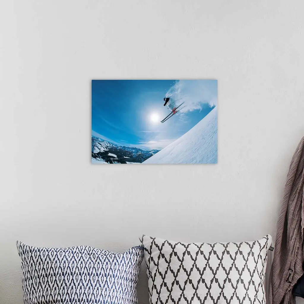 Horizontal, photograph on large canvas of a skier making a jump down an angled slope, in mid-air, heading directly into a hazy sun. Mountain ranges in the distance.