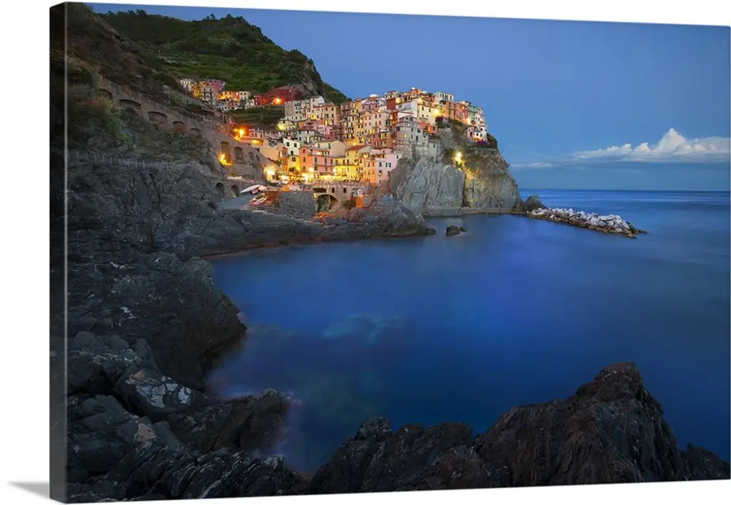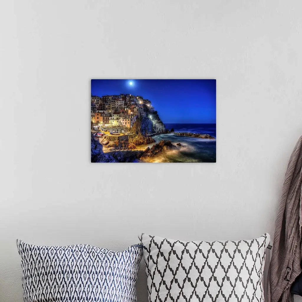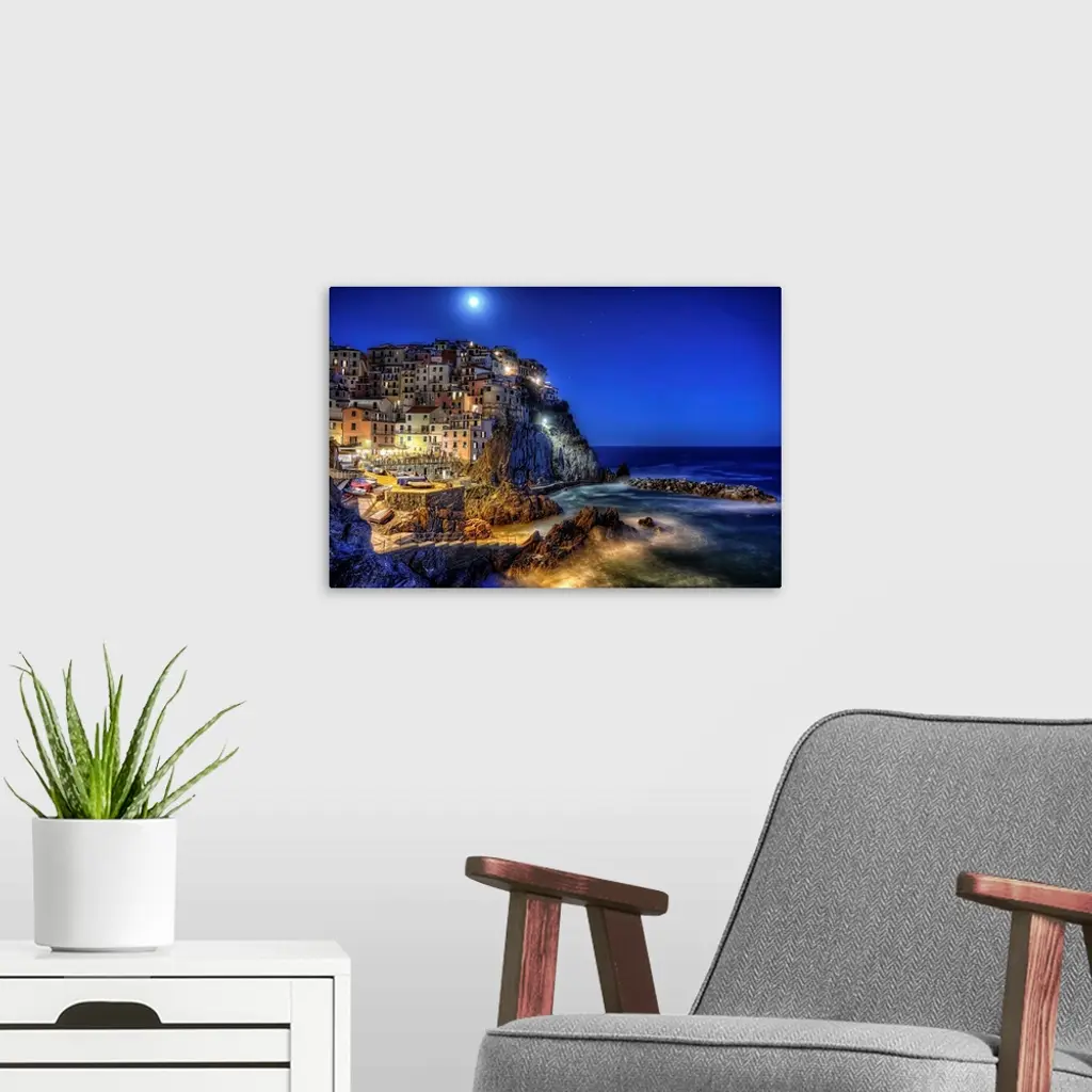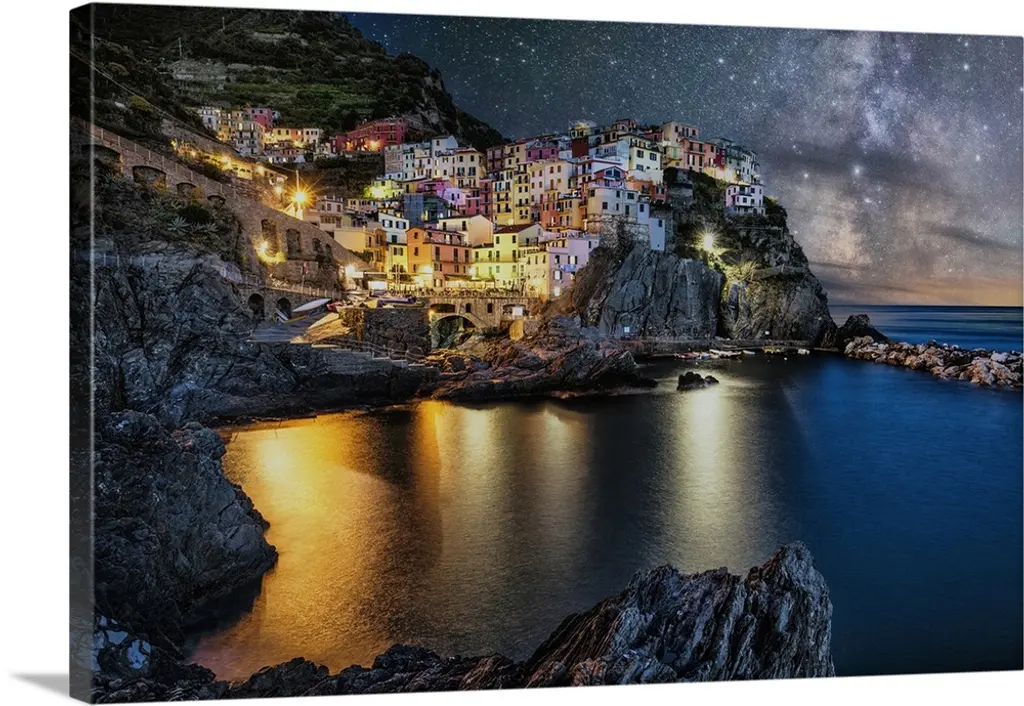 Buildings at the edge of the sea, Cinque Terre, Italy, at night.
