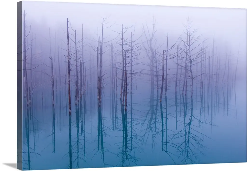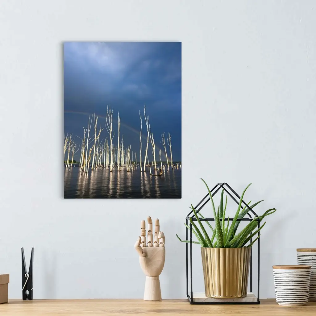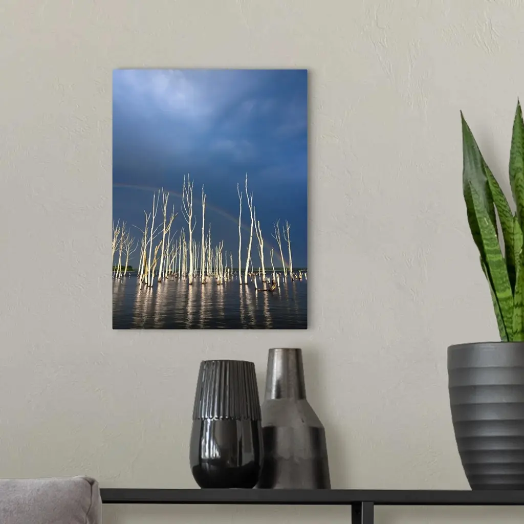 A surreal image of beautifully lit skeletal trees reflected in lake waters under a dramatic sky and reaching up to a rainbow above.