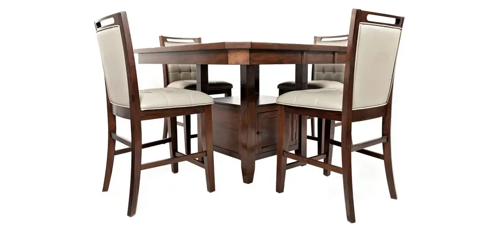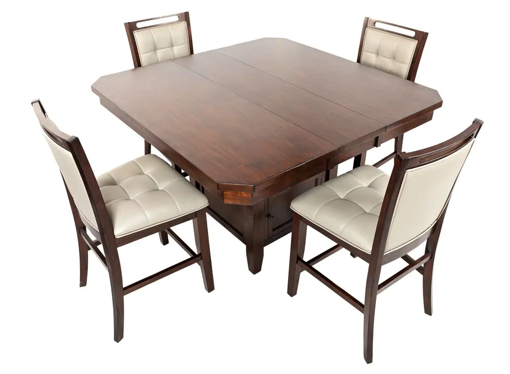 Featuring a beautifully smooth and warm wood finish, contoured corners, and an easy access storage base, the Manchester 5-piece counter-height dining set is extremely versatile. With its convenient height and simple looks, this set will create a complete, polished look in your dining room.