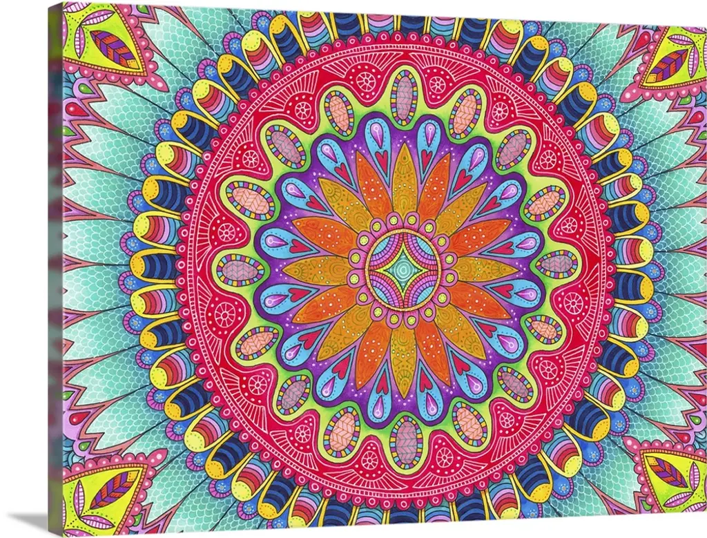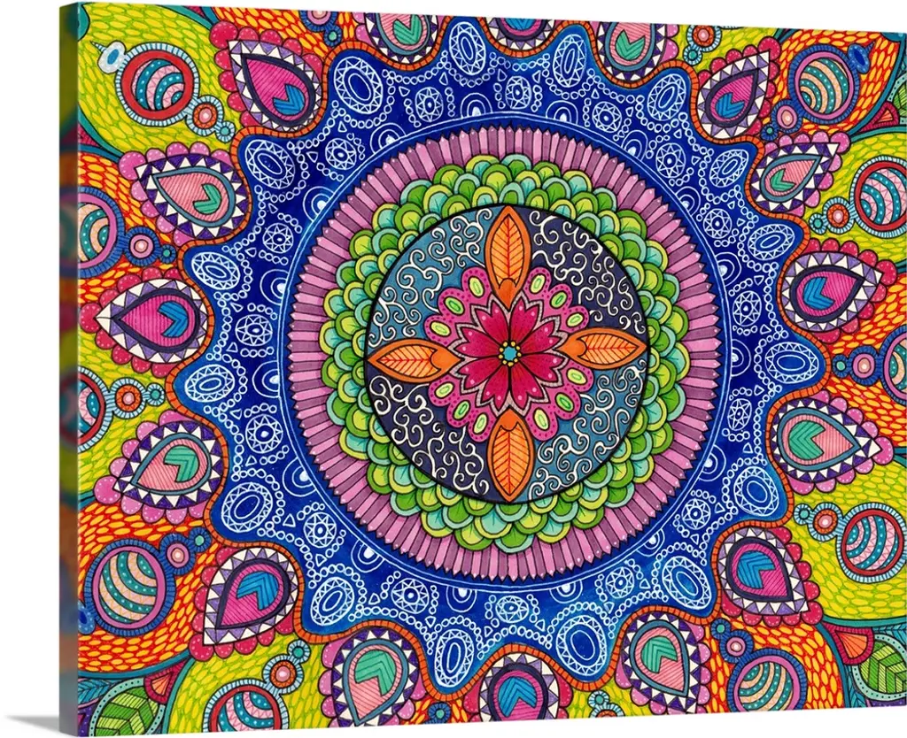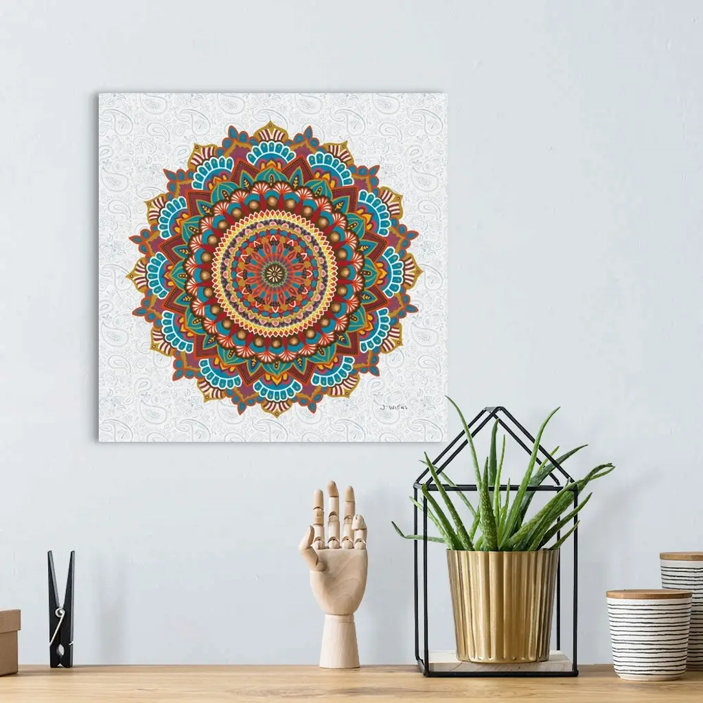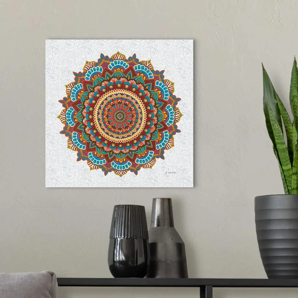 A beautifully colored mandala design in warm tones on a paisley patterned background.