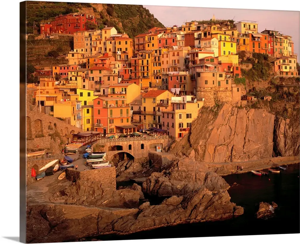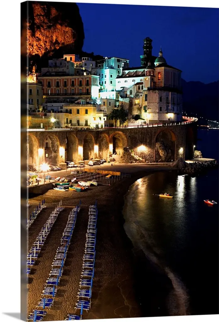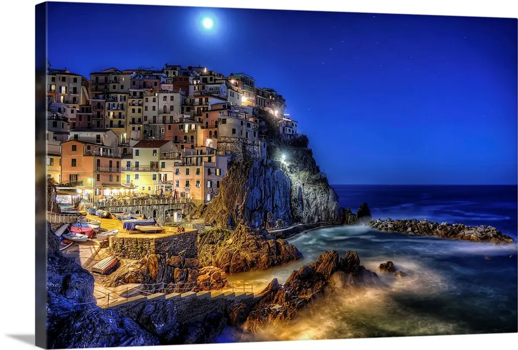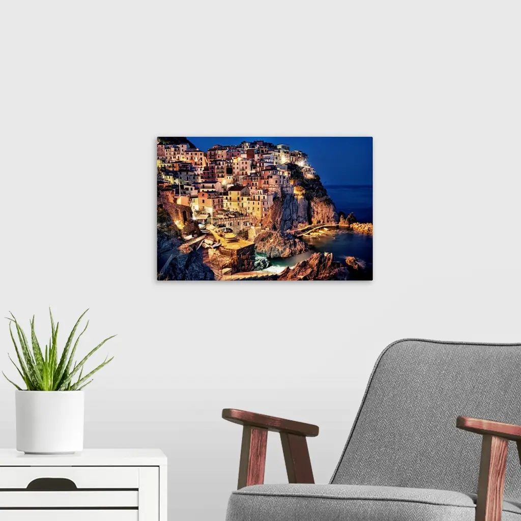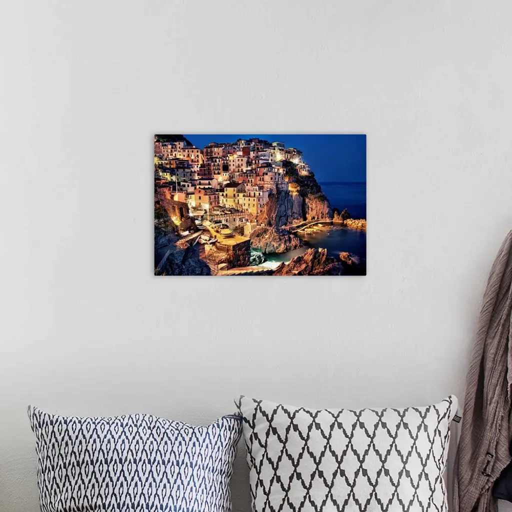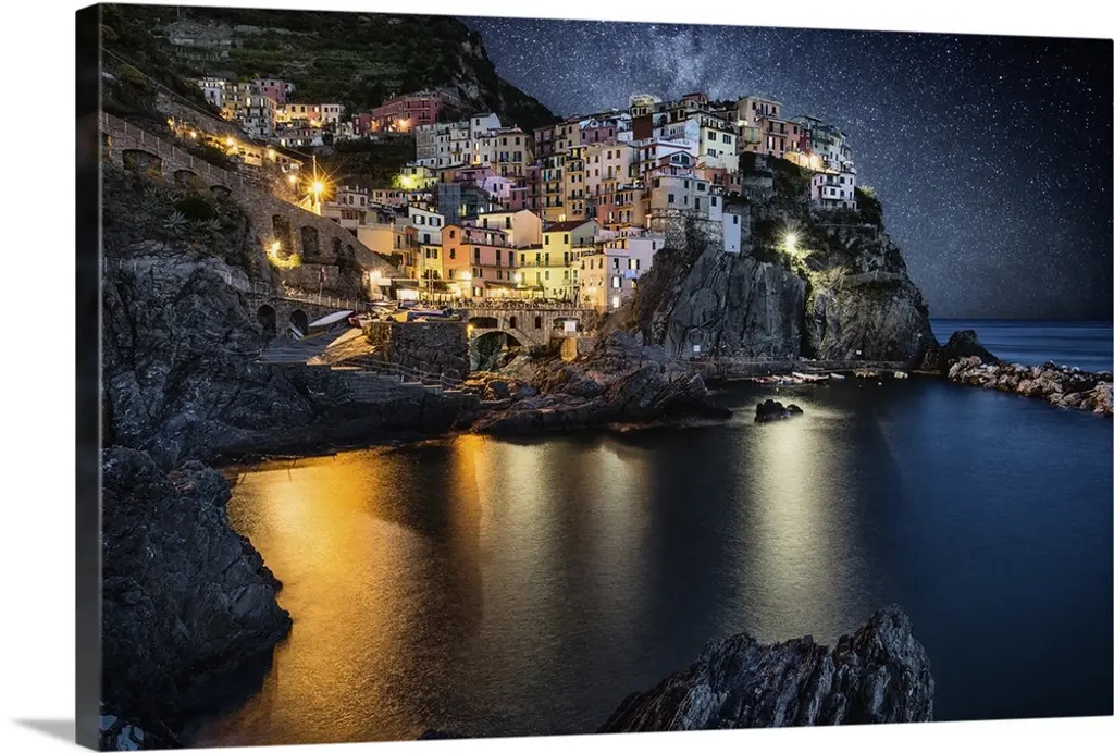 Large photograph taken of homes and buildings sitting within the rocky cliffs of a city in Europe at night. The bright lights of the structures illuminate the surrounding landscape and water below.