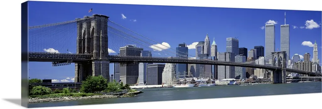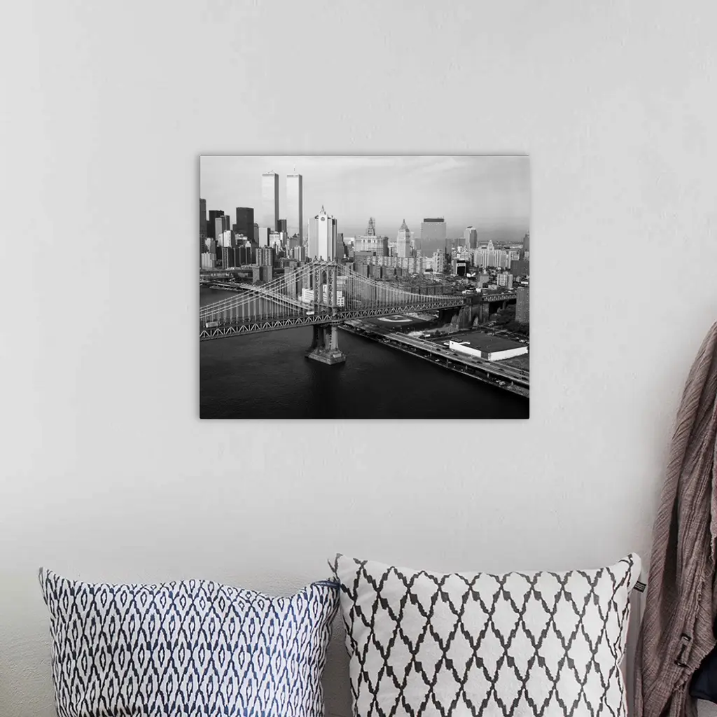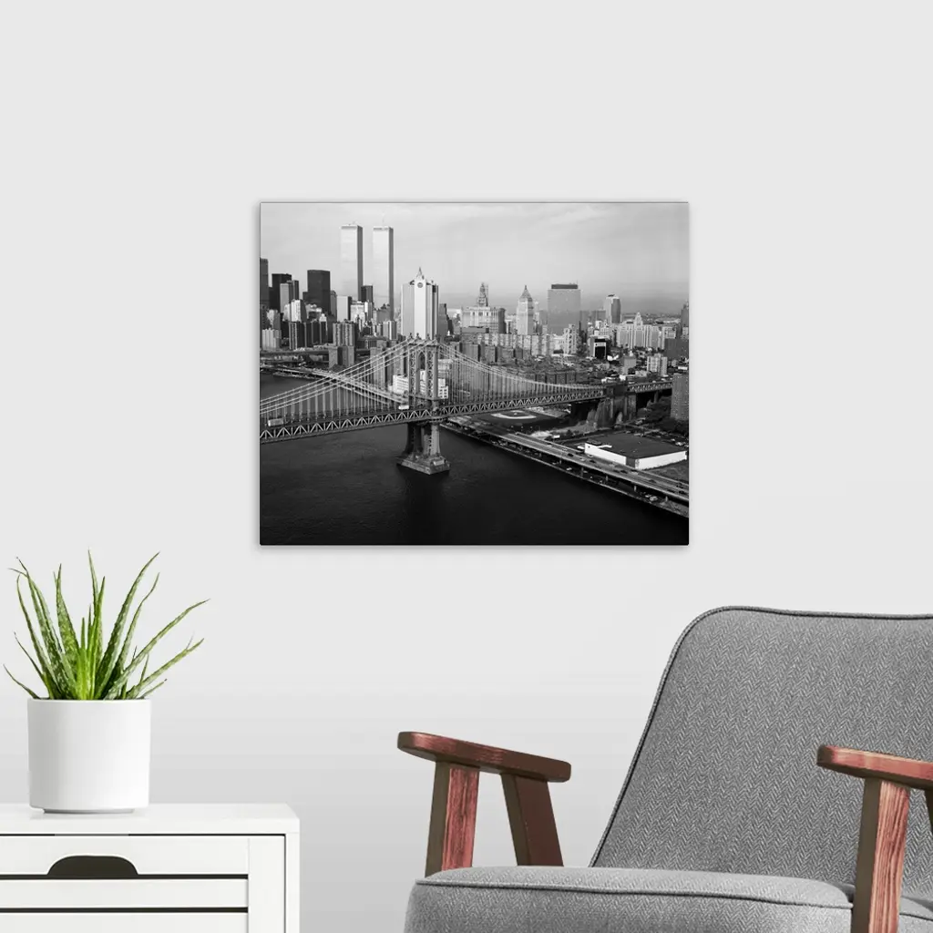 Manhattan Bridge with Twin Towers behind wall art for home and office decor. Discover canvas art prints, photos, mural, big canvas art and framed wall art in GreatBigCanvas.com's varied collections.