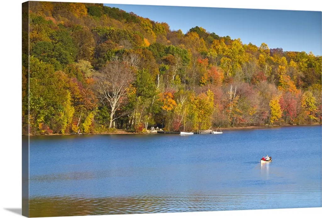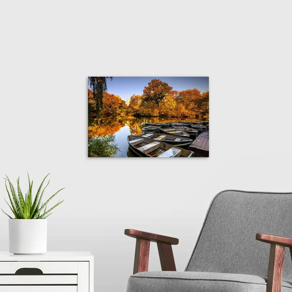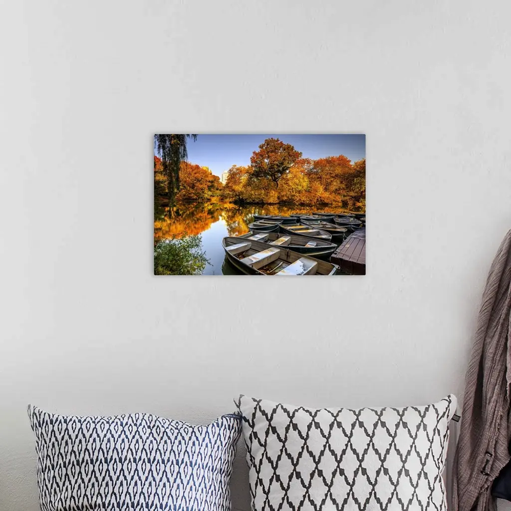 USA, New York City, Manhattan, Central Park, Lake with boats and foliage