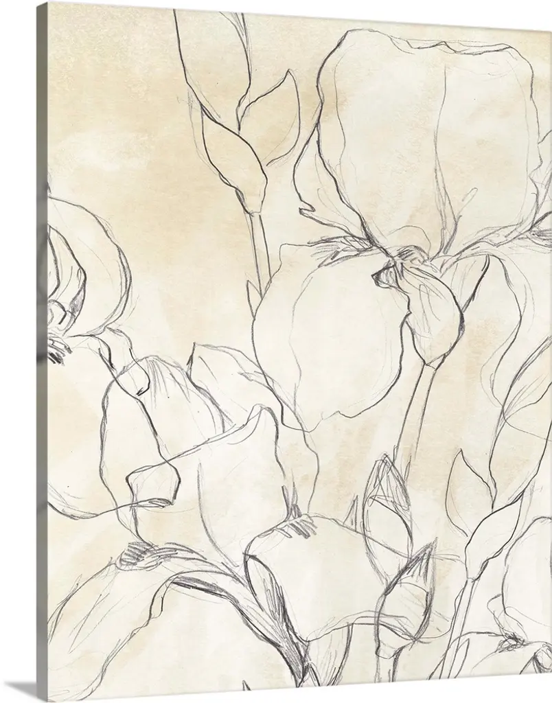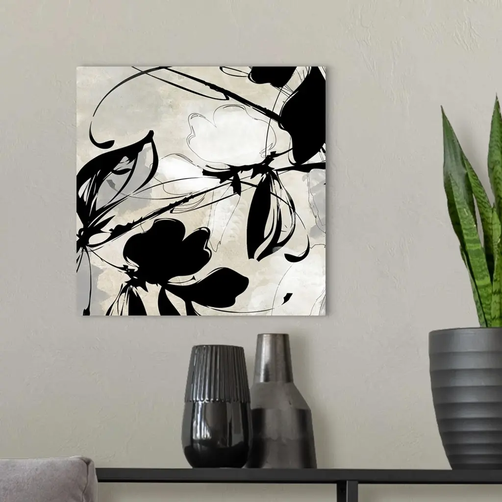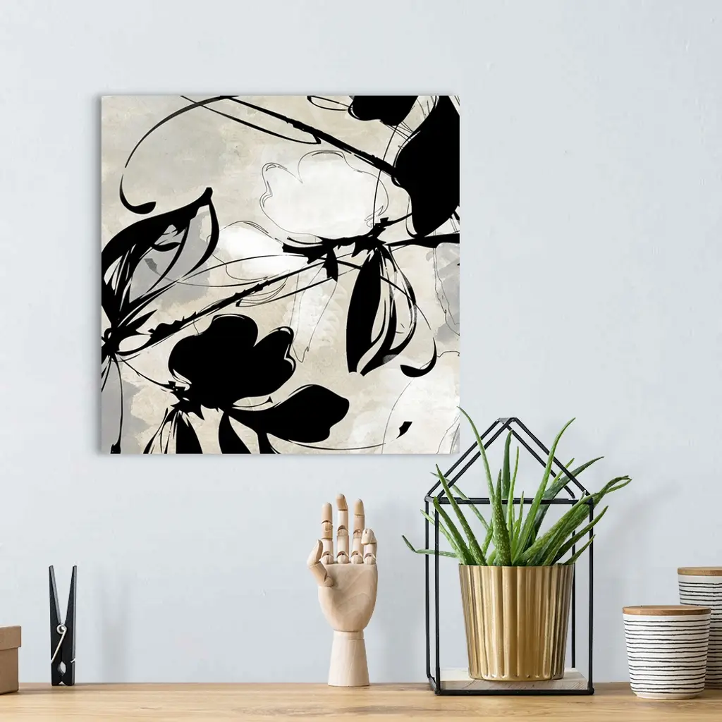 Oversized, square wall art in black and white of a flower and ink design on a light background.