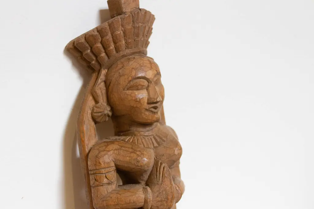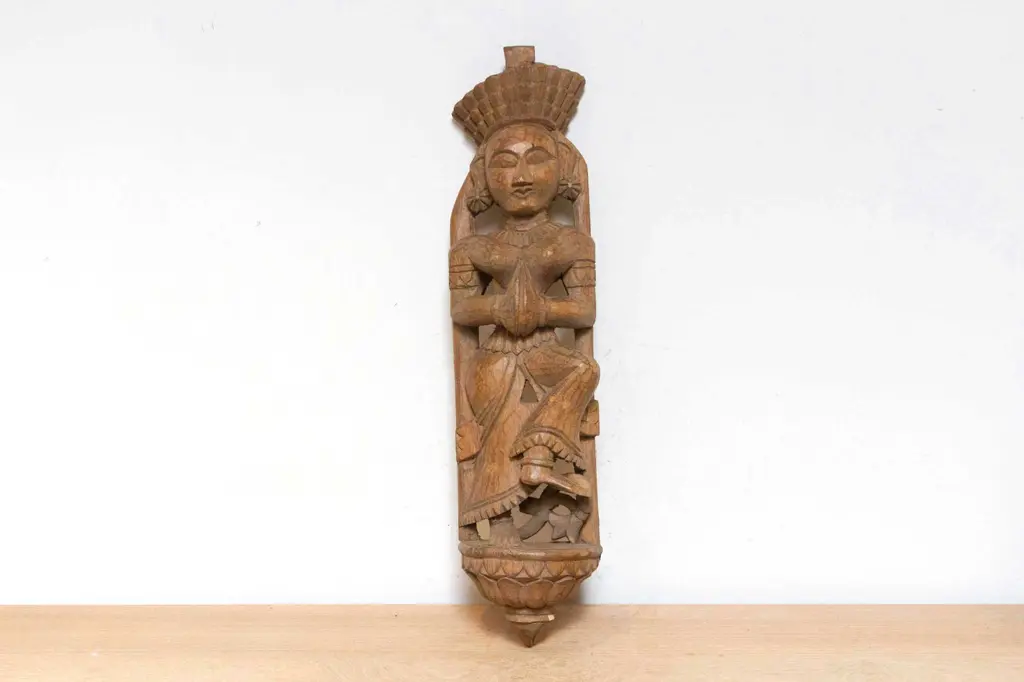 Finely carved, this vintage Indian statue portrays a mythical dancing angel adorned with carved intricate details all around. The figure delicately exudes artistry and charm. With an aged brown hand-painted finish, this statue adds a touch of elegance to any space. This remarkable piece can be hung on the wall and features a small bracket on the back for easy mounting