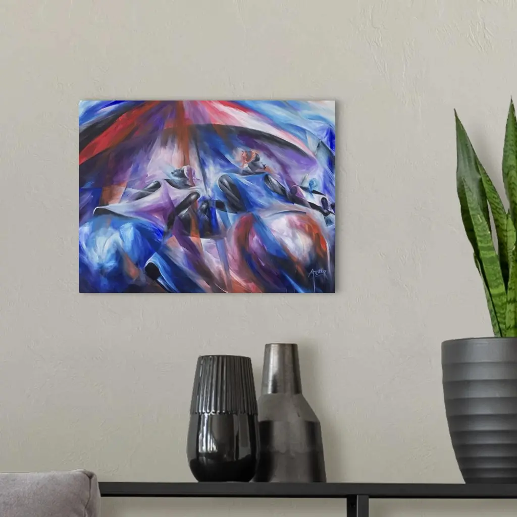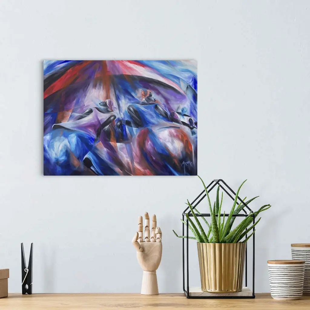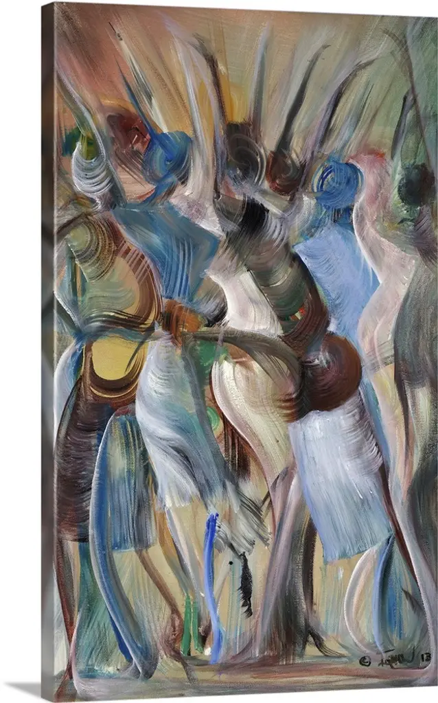 Three women wearing headscarves cluster in the shade of a big red parasol. They are going shopping at the famous Mankessim market, artist Prince Asher explains. It serves the region of Central Ghana and you can find anything you need there. He selects a favorite palette of blues, violets and reds for this handsome portrait.