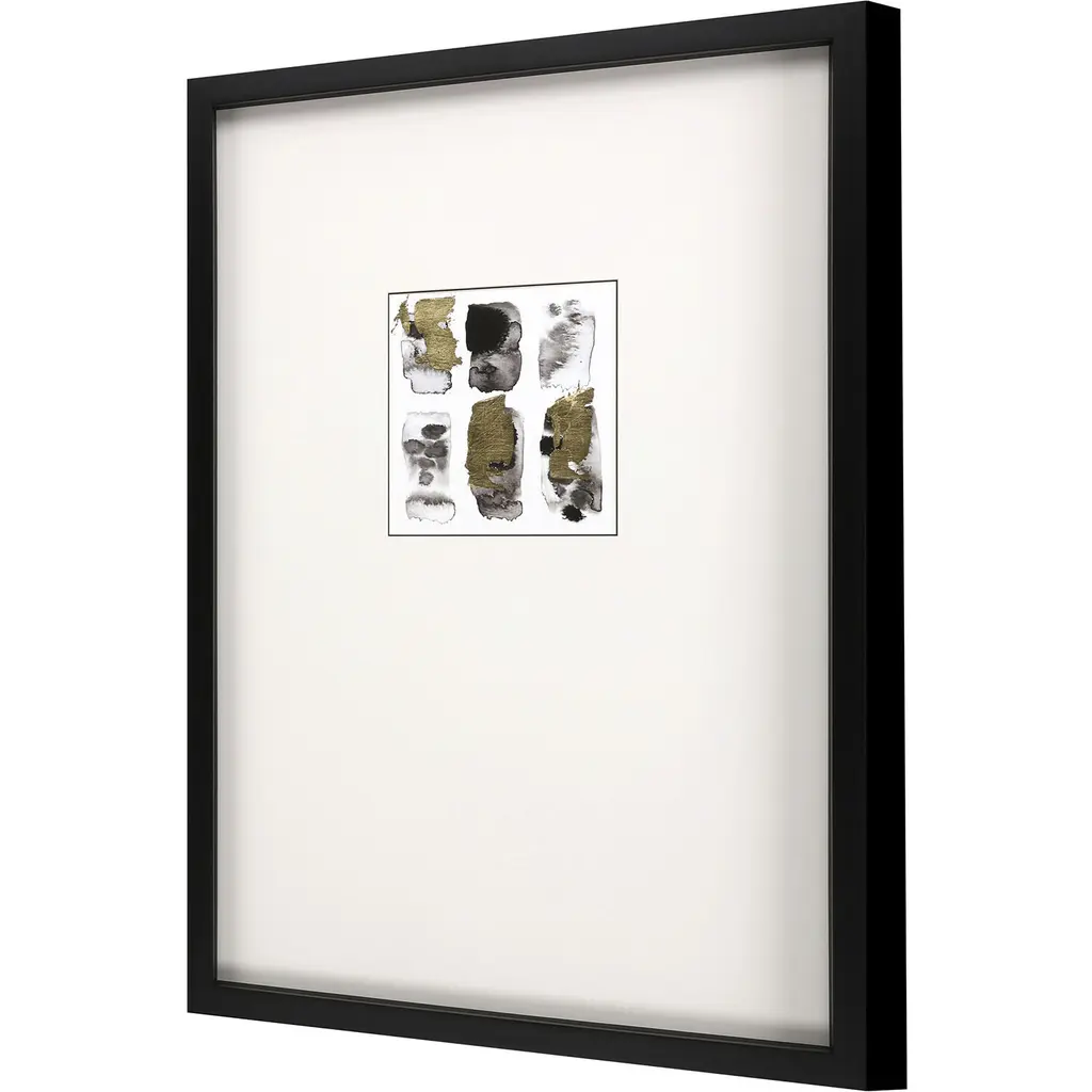 Exclusive hand embellished giclee with gold leaf. Framed in a black matte wood shadow box style moulding