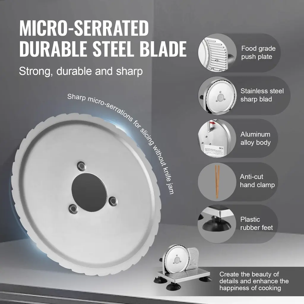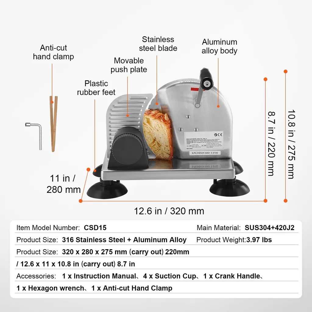 Customizable Slice Thickness: It can customize slices from 0 to 6" thick, catering to your preference for different slice thicknesses. Easy Bread Slicing: Simply rotate the handle to slice cheese effortlessly. The sharp cutting blades are tough and sharp enough for quick cheese cutting. Durable Materials: Our cheese slicer is made from high-strength aluminum alloy, lightweight, corrosion-resistant, and rustproof. The cutting blades are made of marine-grade corrosion-resistant 316 stainless steel, enhancing durability and ensuring they do not deform or crack during use. Convenient Assembly and Disassembly: Fully assembled, simply fix the blade on the main body's shaft. When you need to replace the blade, this cheese slicer is easy to disassemble for convenient storage. Wide Application: Suitable for slicing cheese, bread, tofu, sausage, and more, meeting various consumer slicing needs. Package Content 1 x Manual Bread Slicer 4 x Suction Cup 1 x Crank Handle 1 x Hexagon wrench 1 x Anti-cut Hand Clamp 1 x Instruction Manual