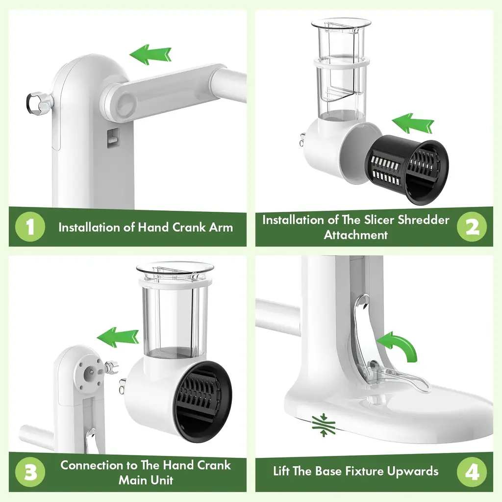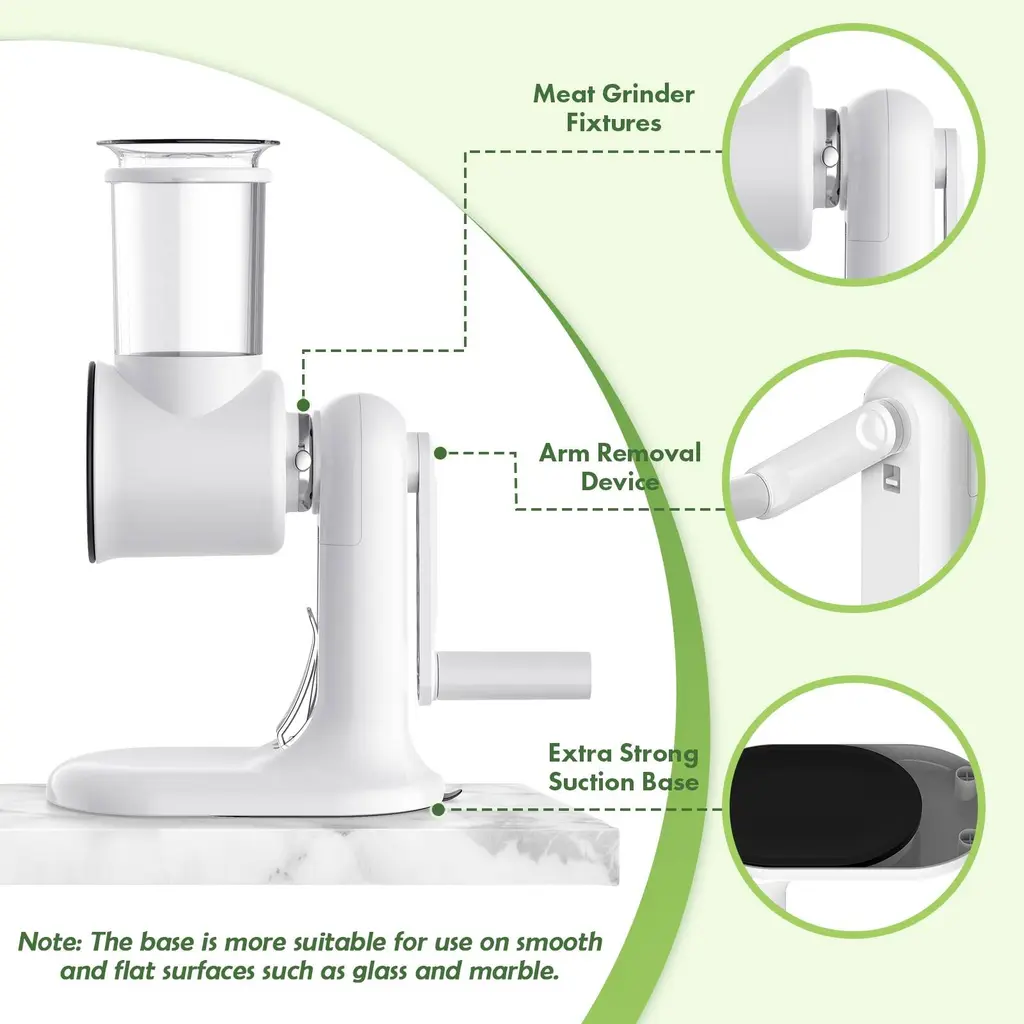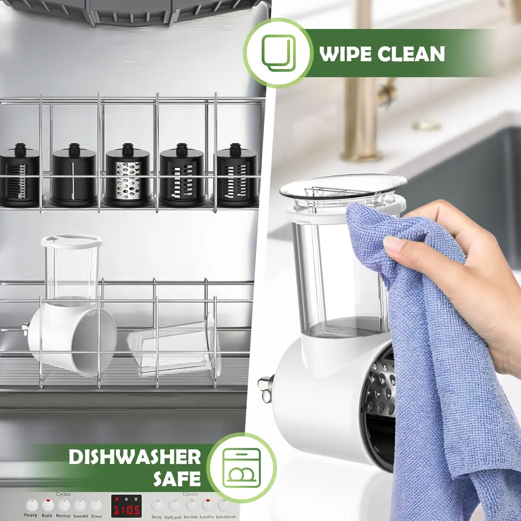 Versatile Functionality: The rotary cheese grater features three interchangeable blades for coarse and fine shredding, slicing, and julienne cutting, making it ideal for cheese, vegetables, nuts, and more. Safe and Easy to Use: The rotary cheese grater with handle is designed with a food pusher and easy-to-install blades.This cheese grater hand crank prevents direct contact with sharp edges, enhancing safety during use. Time-Efficient: With a rotary mechanism that shreds cheese 18 times faster than manual methods, this rotary cheese grater significantly reduces prep time and effort. Stable and Secure Operation: The powerful suction base of the rotary cheese grater ensures a stable grip on various smooth surfaces, preventing slips and ensuring smooth operation. Easy To Clean & Store: Our rotary cheese grater is detachable in all parts making it simple to clean, all blades are dishwasher safe for hassle-free cleaning. The base, handle and cheese grater machine can be quickly wiped clean, but not dishwasher safe.