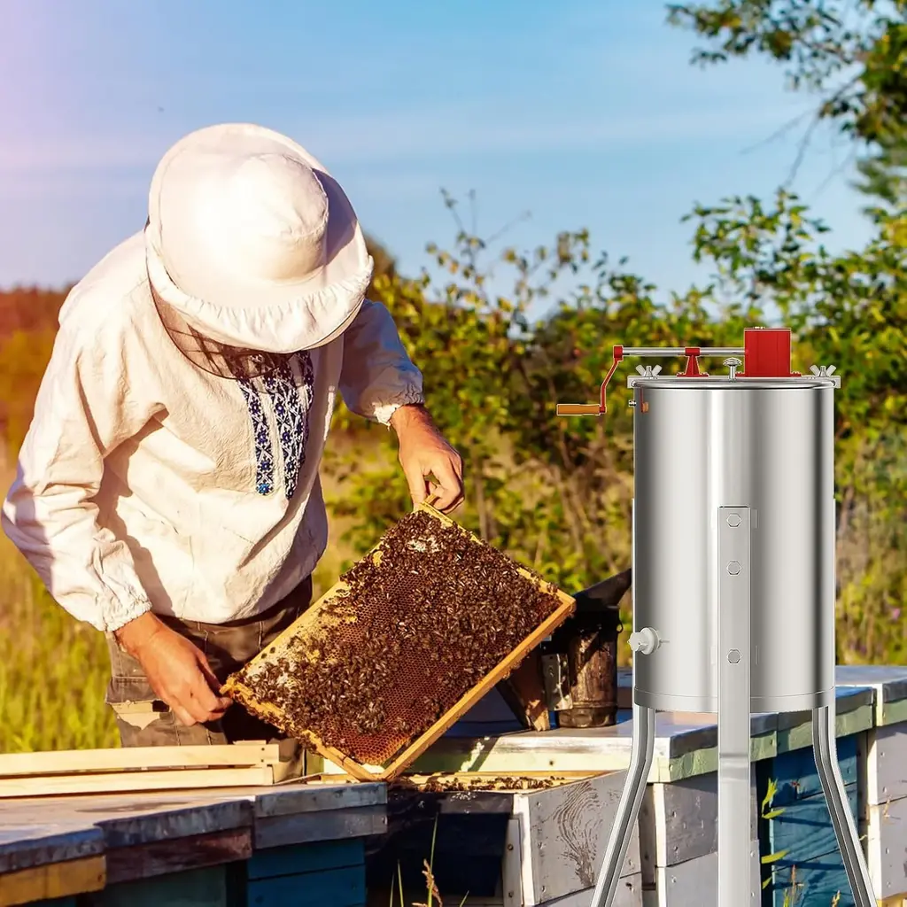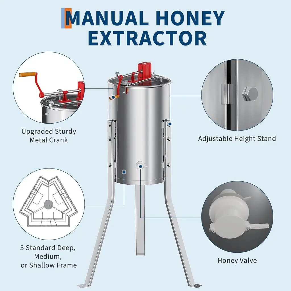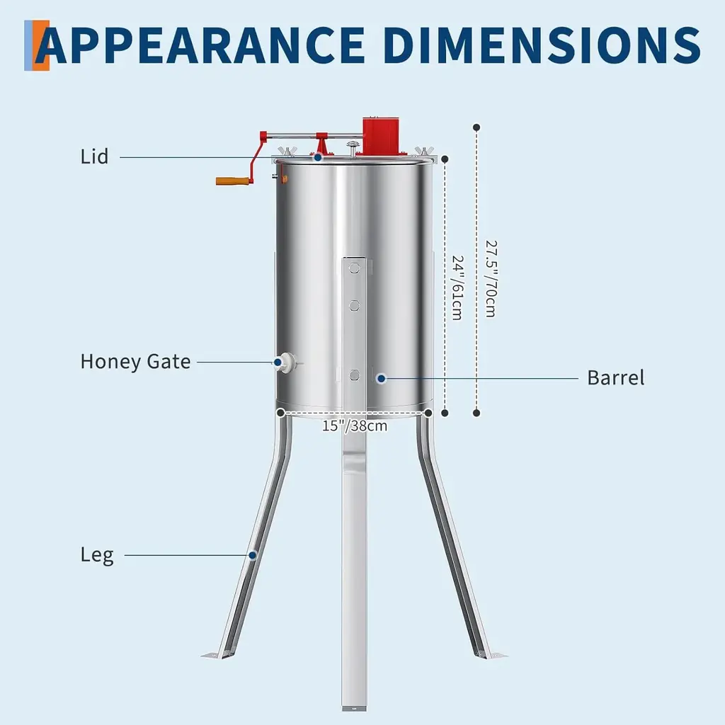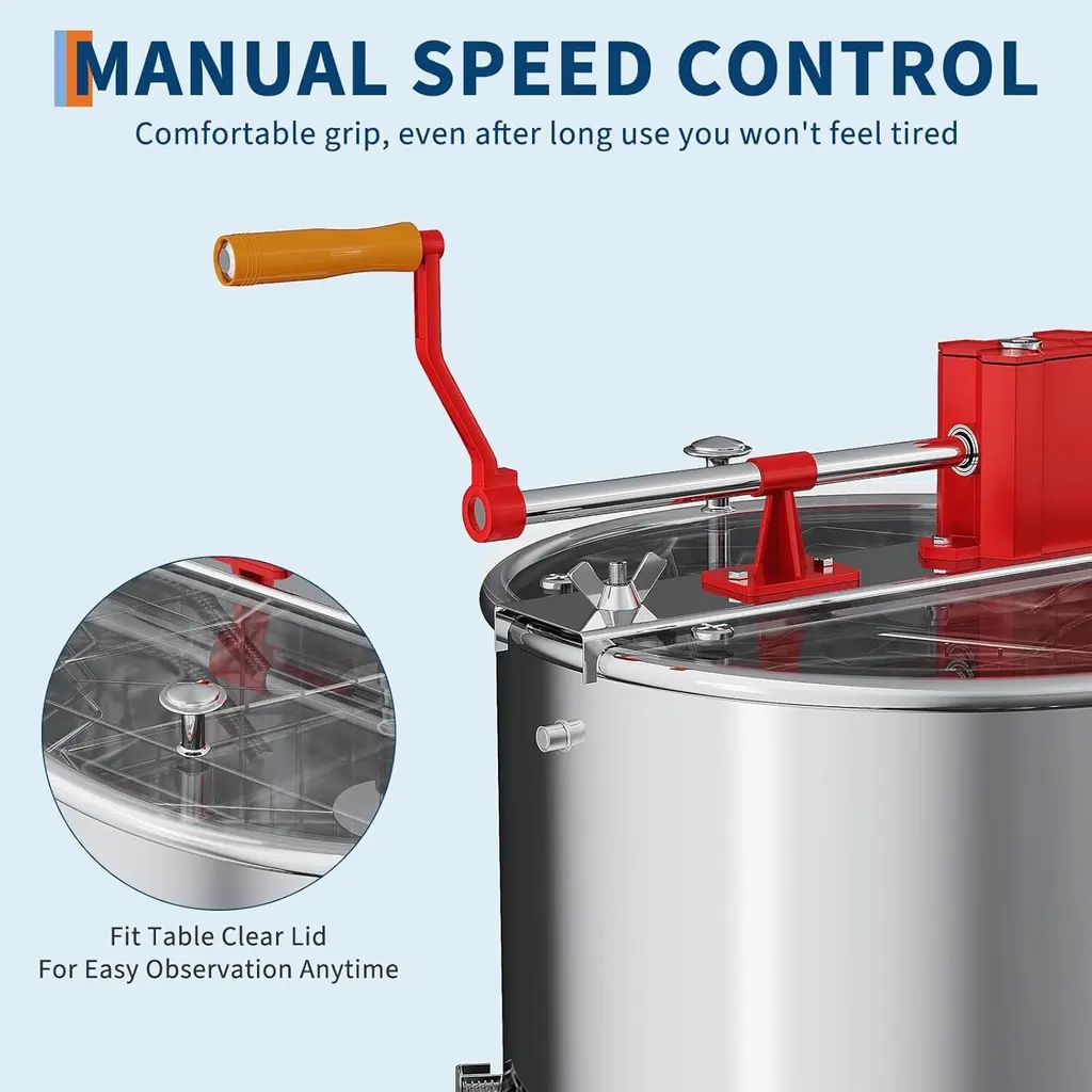 Efficient 4 Frame Honey Extraction – This manual honey extractor holds up to 4 shallow/medium frames or 4 deep frames, making it ideal for small-scale beekeepers. Enjoy smooth, mess-free honey spinning. Ergonomic Hand Crank for Easy Use – Designed for effortless operation, the smooth-turning crank minimizes strain while extracting honey. Perfect for hobbyist beekeepers looking for precise honeycomb processing. Premium Stainless Steel Build – Made from rust-resistant, food-grade stainless steel, this honey extractor is durable, easy to clean, and built for long-term beekeeping use. The polished finish enhances its longevity. Stable Adjustable Stand – Adjustable height (39.3"-42.5") ensures comfortable operation. Bolt-on legs provide a firm and steady base, preventing unnecessary movement and ensuring efficient honey draining. Transparent Lid for Monitoring – The clear acrylic lid allows you to observe the honey extraction process in real time, ensuring optimal results. Keep an eye on your honey without stopping operation.