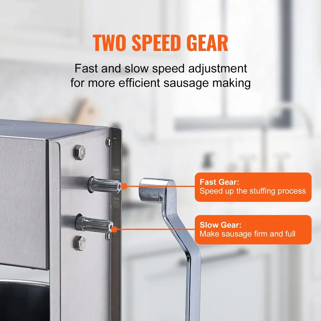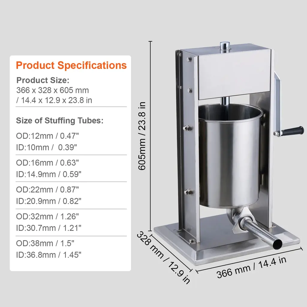 Double Air Release Valve: when pressing, more air can be released, you don't need to poke many holes in the casing to eliminate air bubbles, and also no need to worry about the failure of enema caused by casing rupture. Includes 4/3 Filling Tubes: This vertical sausage stuffer comes with four stainless steel stuffing tubes (Φ15 mm, Φ21 mm, Φ30 mm, Φ37 mm) and fried dough sticks, meeting different size requirements to make thin Italian fine sausages, flavored salami, or thicker meat sausages. Exquisite Construction: The short elbow design on this sausage stuffer can reduce meat waste, and the large suction cup effectively avoids the machine from shaking. The parts in direct contact with food meet food hygiene standards, ensuring peace of mind in every bite. Fast/Slow Speeds: Two speeds are available: fast speed for filling sausage and slow speed for filling casing. And guess what! It even features an ergonomic and comfortable handle for easy and efficient operation. Large Capacity & Easy to Clean: Are you tired of running out of room? The 1.3 Gal / 0.8 Gal/0.4 Gal/15 lbs/5lbs/22 lbs capacity ensures that more sausages can be made at a time, saving you a lot of efforts. The detachable design is perfect for easy cleaning. Package Content 1 x Sausage Stuffer 1 x Cleaning Brush 1 x Piston 1 x Discharge Tube Set 2 x Sealing Ring 4 x Bottom Suction Cup 1 x Doughnut Accessories 1 x Manual (1 x Sausage Stuffer 1 x Handle 1 x Plastic Discharge Tube Set 1 x Handle Fixing Screw 1 x Gasket 1 x Manual) for 3 Filling Tubes option