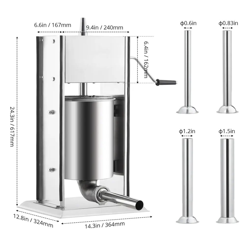 The Manual Sausage Stuffer features a generous 3/5/7/10/15L capacity, perfect for making large batches of sausages for gatherings. With a stylish silver finish, it includes a total of 5 stuffing tubes for versatility, easy operation, and durable construction, making it suitable for both home cooks and small-scale commercial use. Key Features: