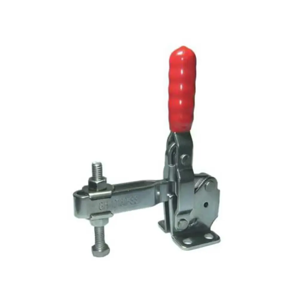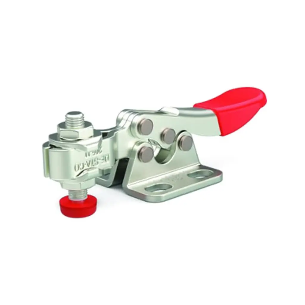 Toggle Clamp, Base Mounting Style Flange, Handle Orientation Vertical, Holding Capacity - Maximum 250 lbf, Arm Style U-Bar, Tip Material Stainless Steel, Clamp Arm Opening Angle 95 Degrees , Arm Length 1.33 in, Height Under Arm 0.89 in, Includes Locking Handle No, Accommodates Workpiece Variation No, Application Metalworking, Welding, Body Material Stainless Steel, Clamping Force 200 lb, Fastener Thread Size 1/4 in, Handle Color Red, Handle Material Plastic