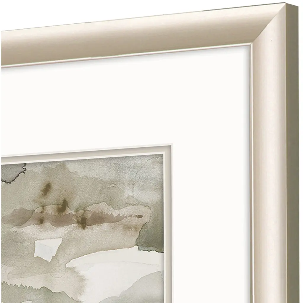 An abstract in an array of flowing neutral earth tones is matted in white. Framed in an angled profile champagne gold finish moulding.