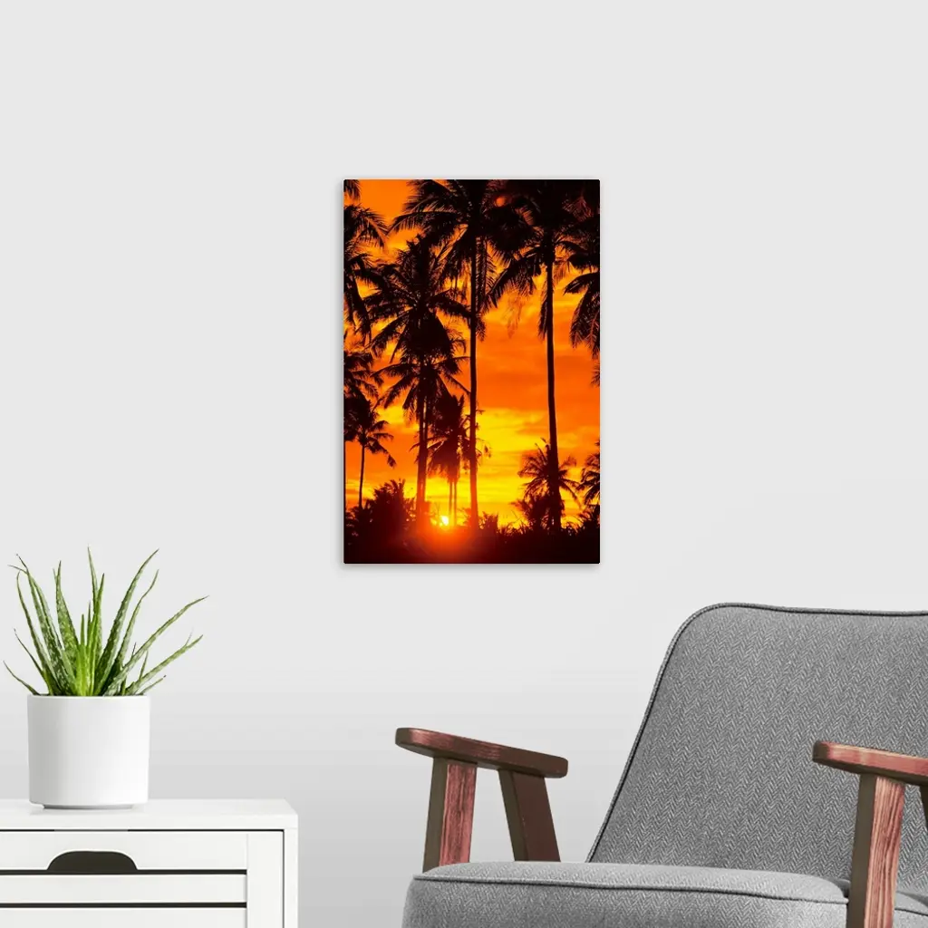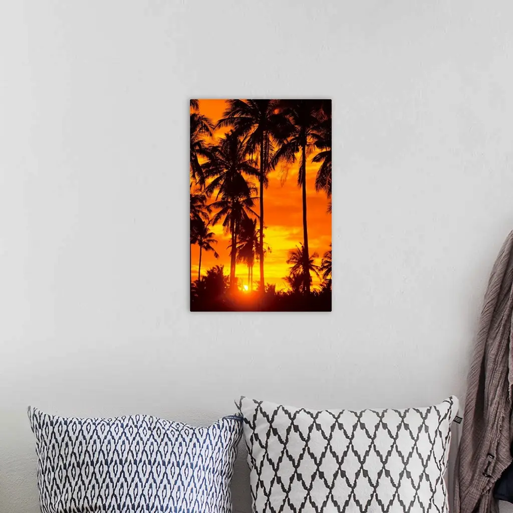 Many Palms Silhouetted In Vibrant Orange Sunset Sky wall art for home and office decor. Discover canvas art prints, photos, mural, big canvas art and framed wall art in GreatBigCanvas.com's varied collections.
