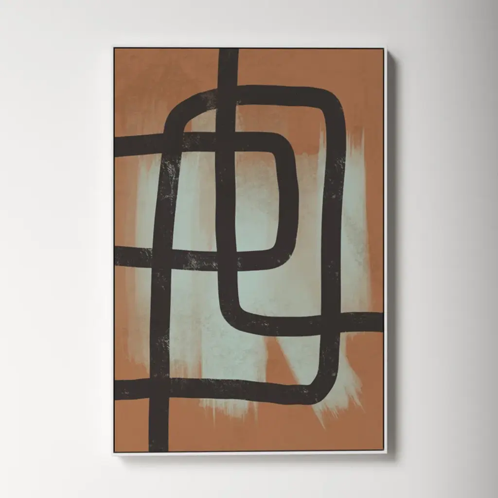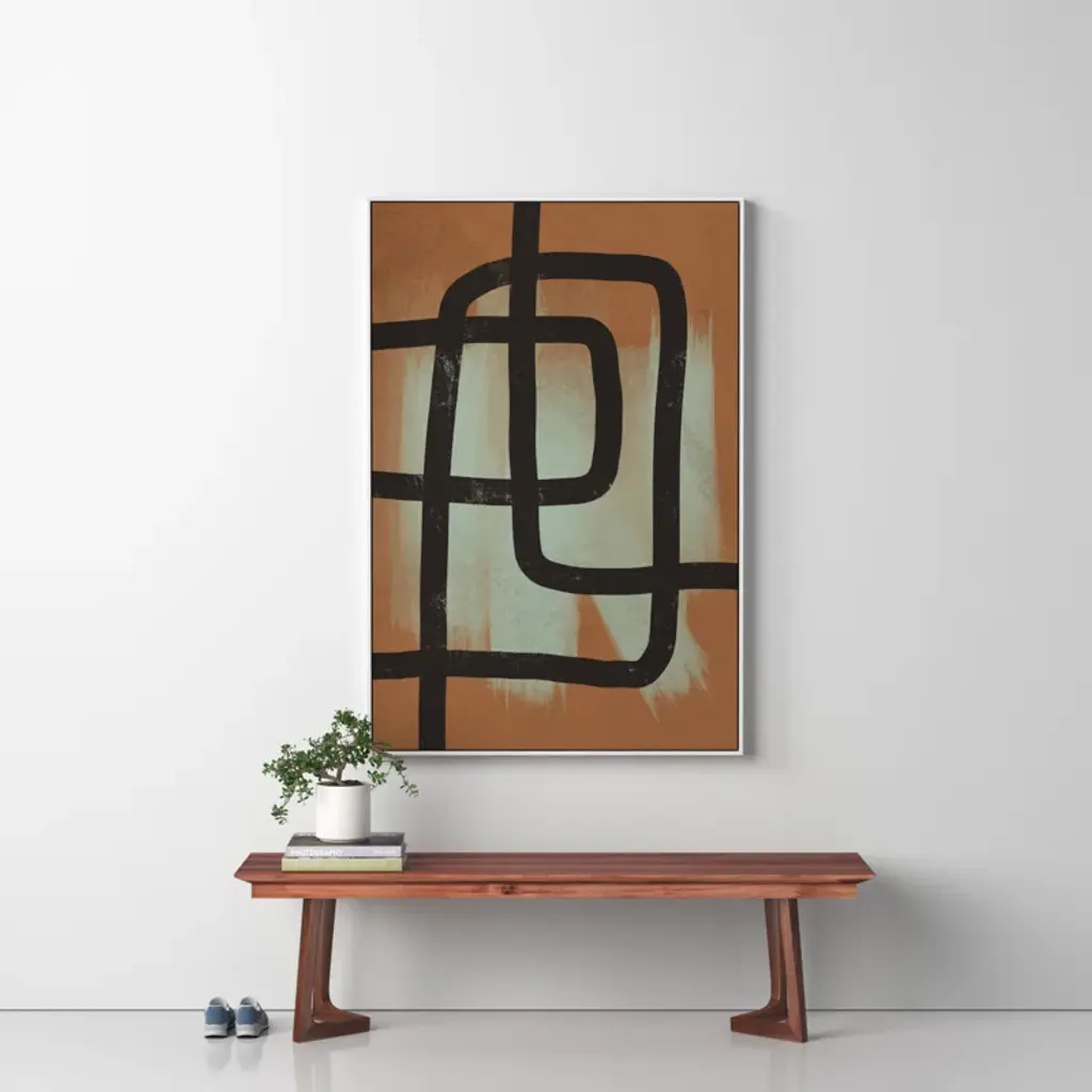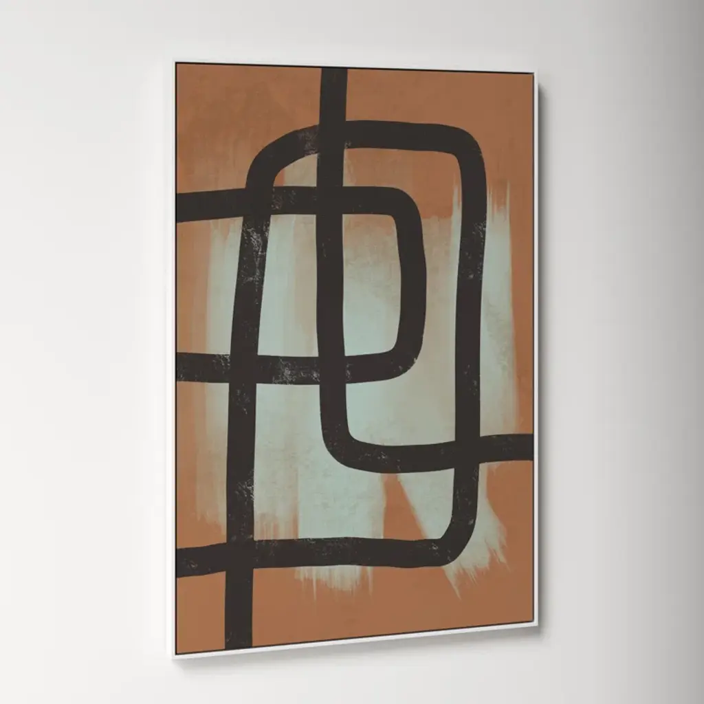 This abstract print showcases a composition of overlapping road-like lines, highlighted by painterly gray strokes against a brown background. It’s giclee printed on hand-stretched canvas using fade-resistant inks, and arrives in a wooden floated frame with included hanging hardware.