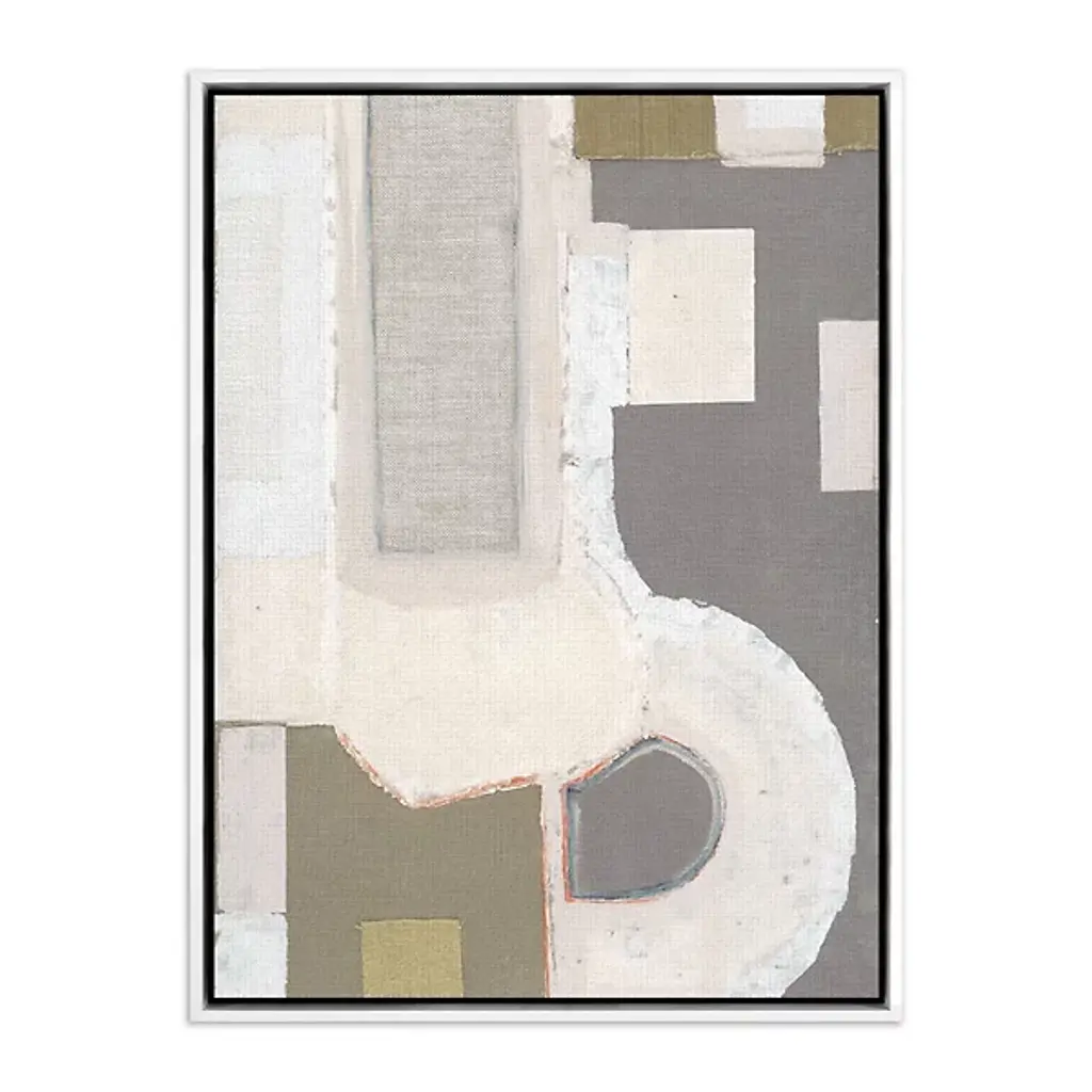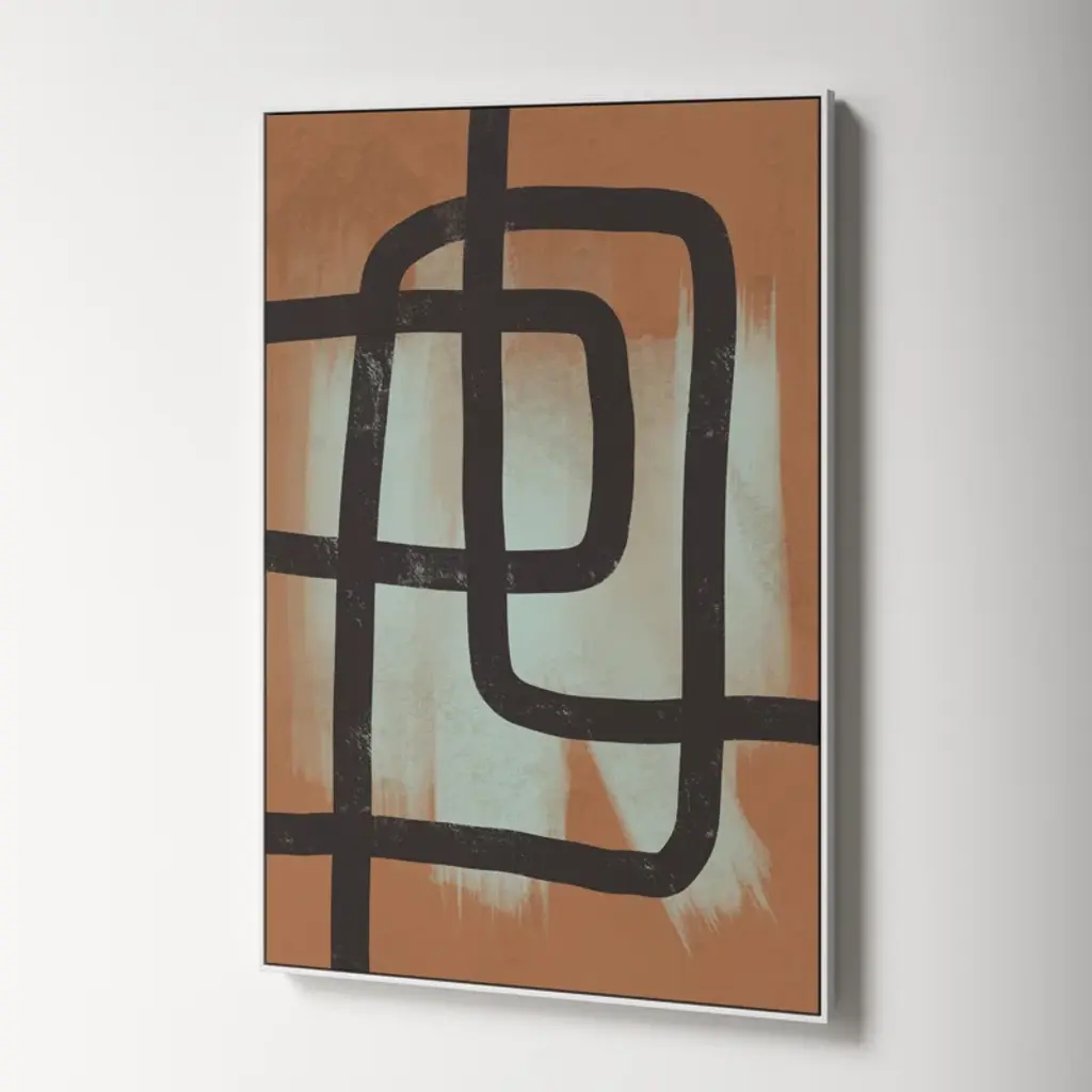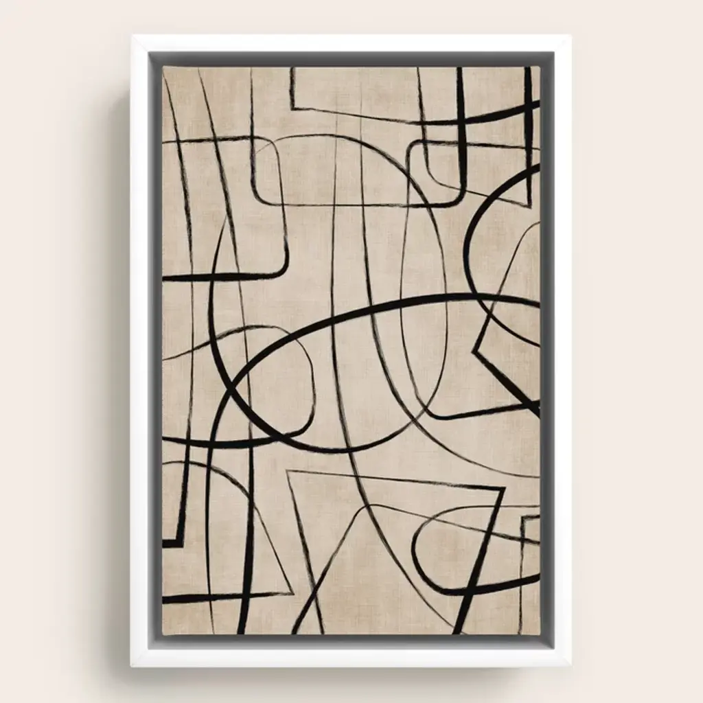 This abstract print showcases a composition of overlapping road-like lines, highlighted by painterly gray strokes against a brown background. It’s giclee printed on hand-stretched canvas using fade-resistant inks, and arrives in a wooden floated frame with included hanging hardware.