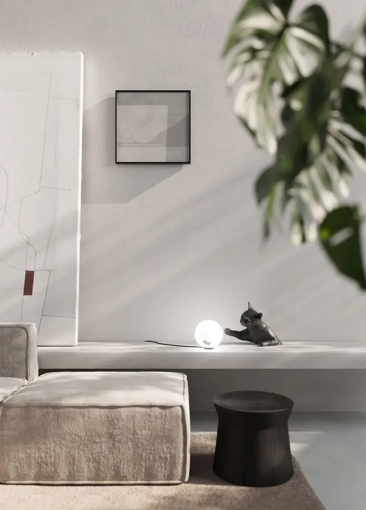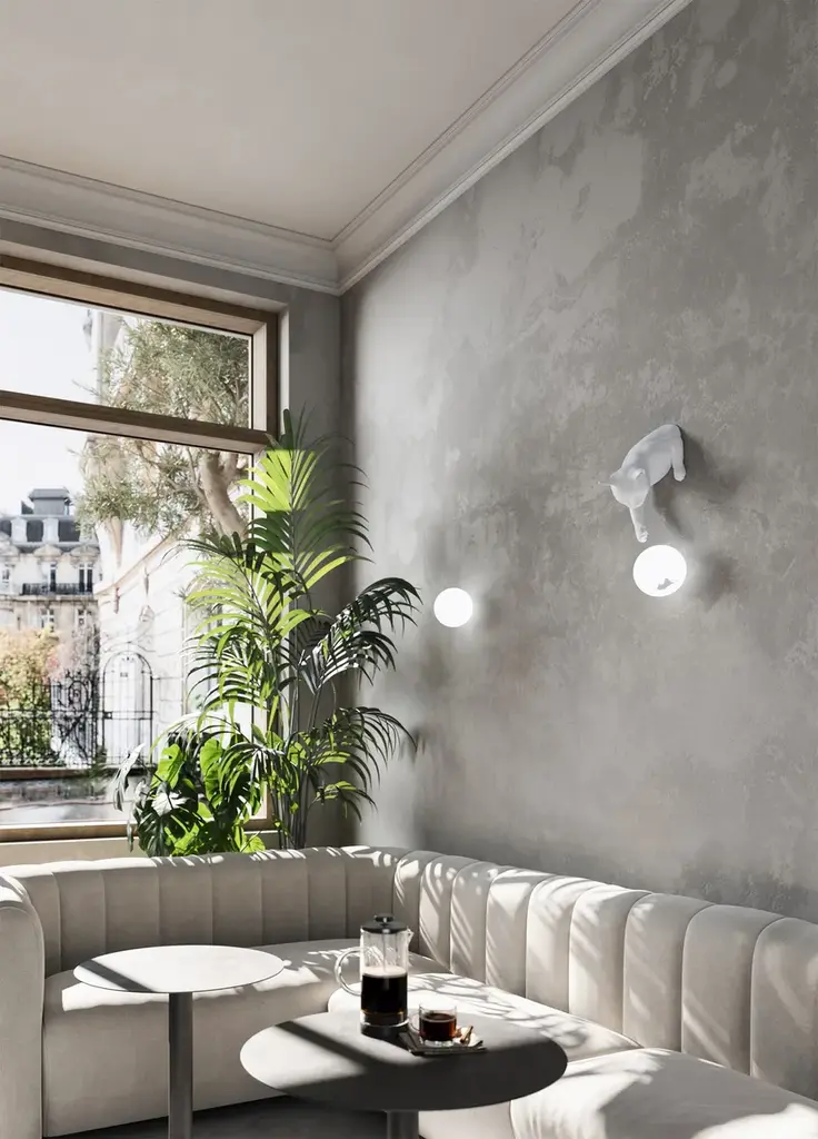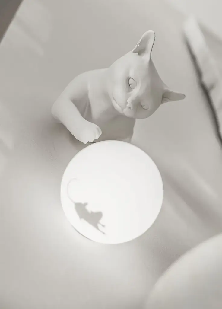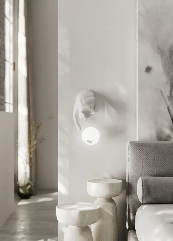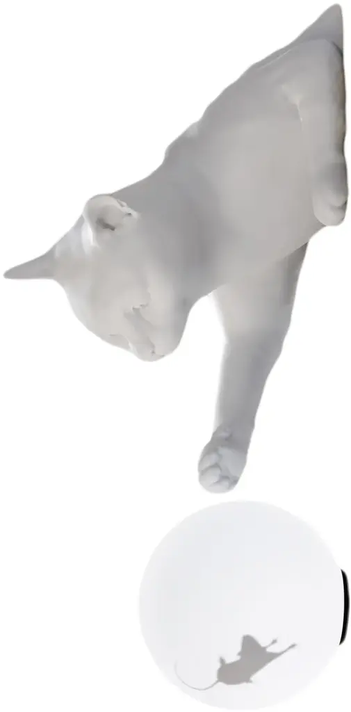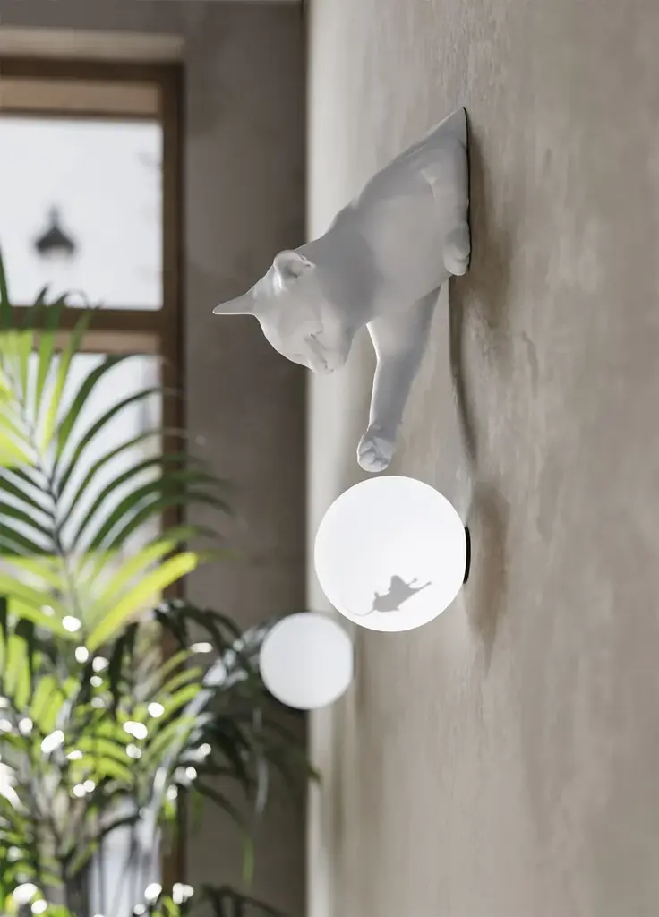 Maoo is a LED table or wall lamp for indoor use. Matte white or black ceramic body, etched glass diffuser.Light source: LED, G9, 1x max 5W, IP20Bulb not provided 700GThe cat appears to jump out of the wall or from the table, and playfully tease the mouse with its paws inside the luminous sphere.Composed of two elements, a cat body made of matt white ceramic and charcoal black ceramic a glass sphere with mouse-shaped inner sticker, MAOO can be hung on a wall or placed on a desk, bedside table, or table top.MAOO joins Karman Zoo, the famous collection of ceramic lamps designed by Matteo Ugolini and inspired by the animal world.