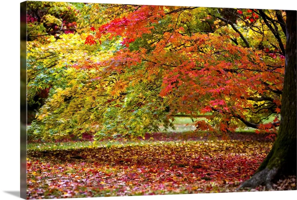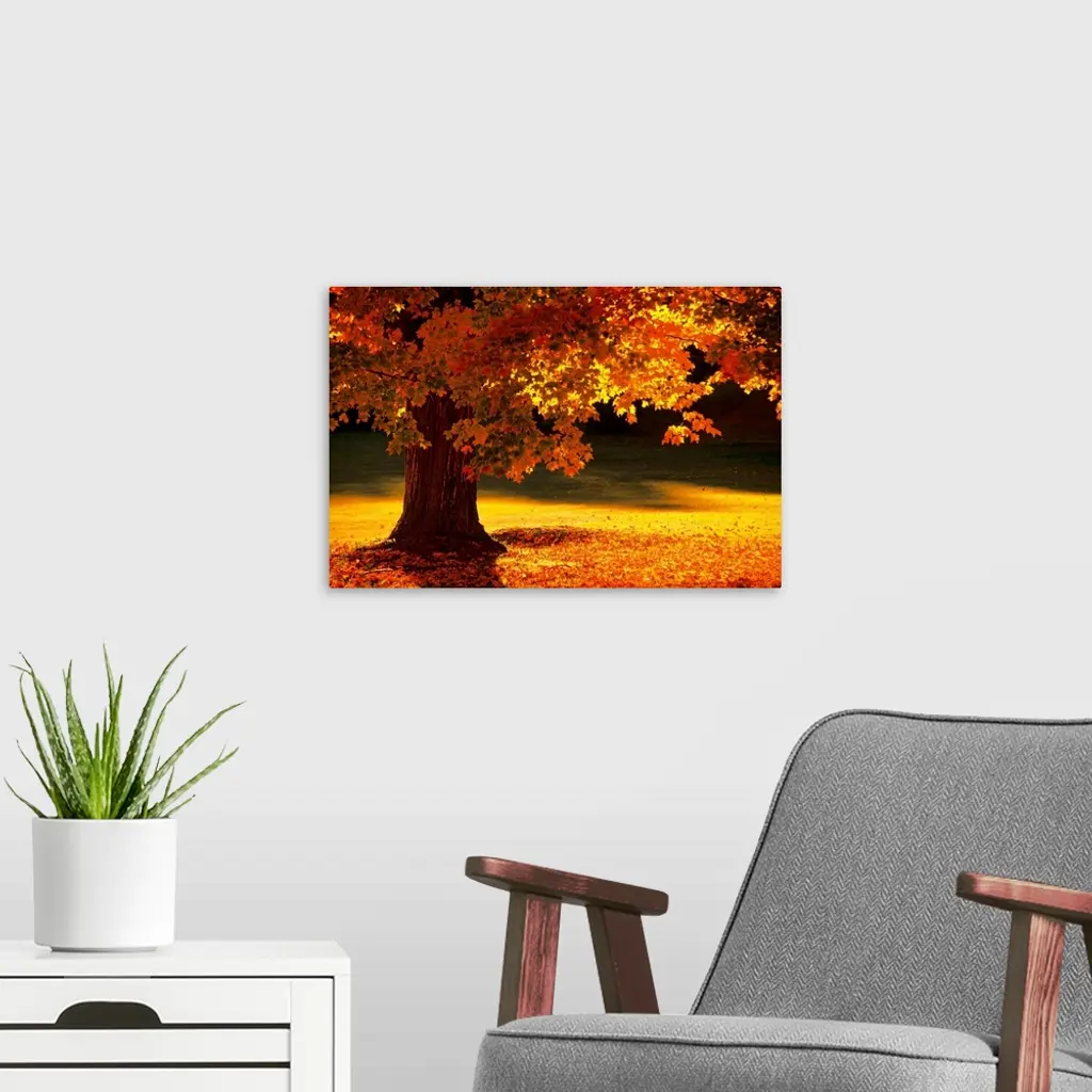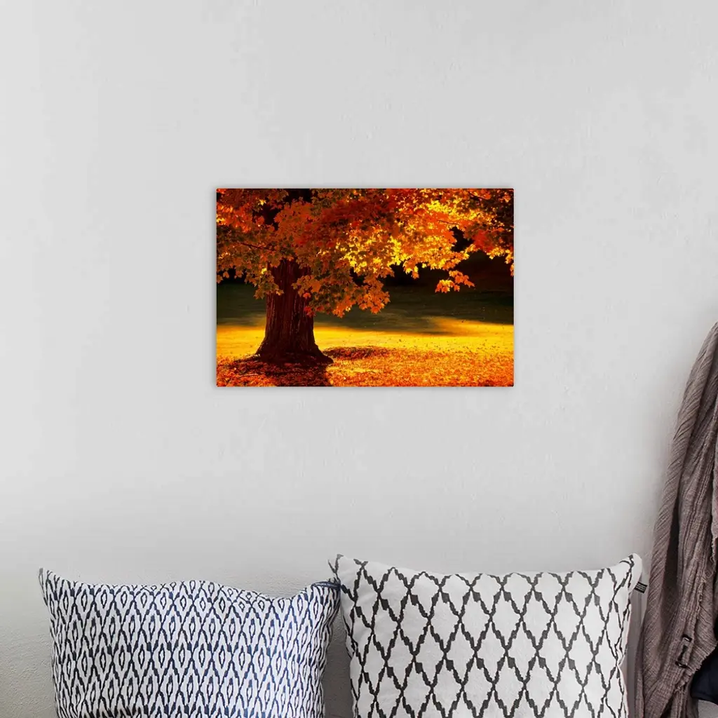 This landscape photograph shows a New England tree in autumn with leaves that have begun to fall and collect in fire colored piles at its base.