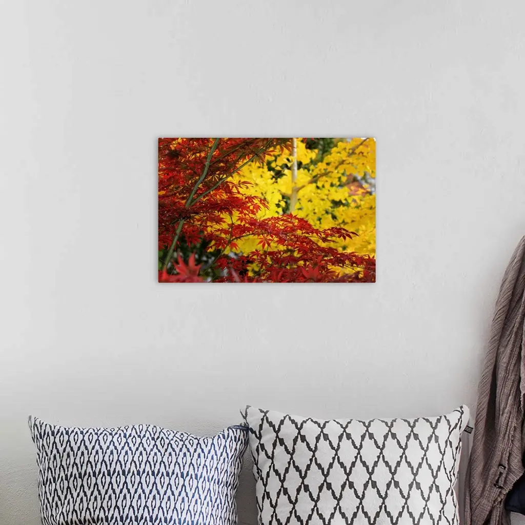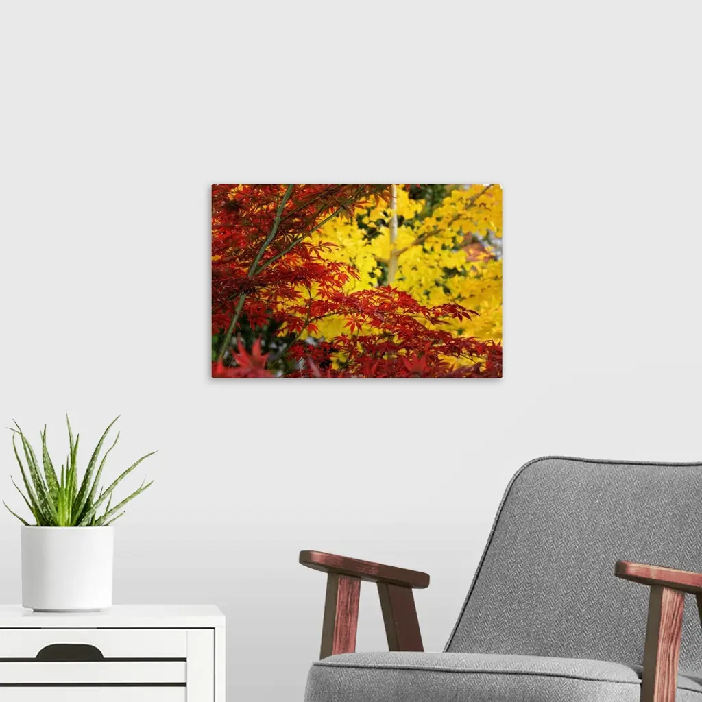 Red maple in front of a yellow ginkgo