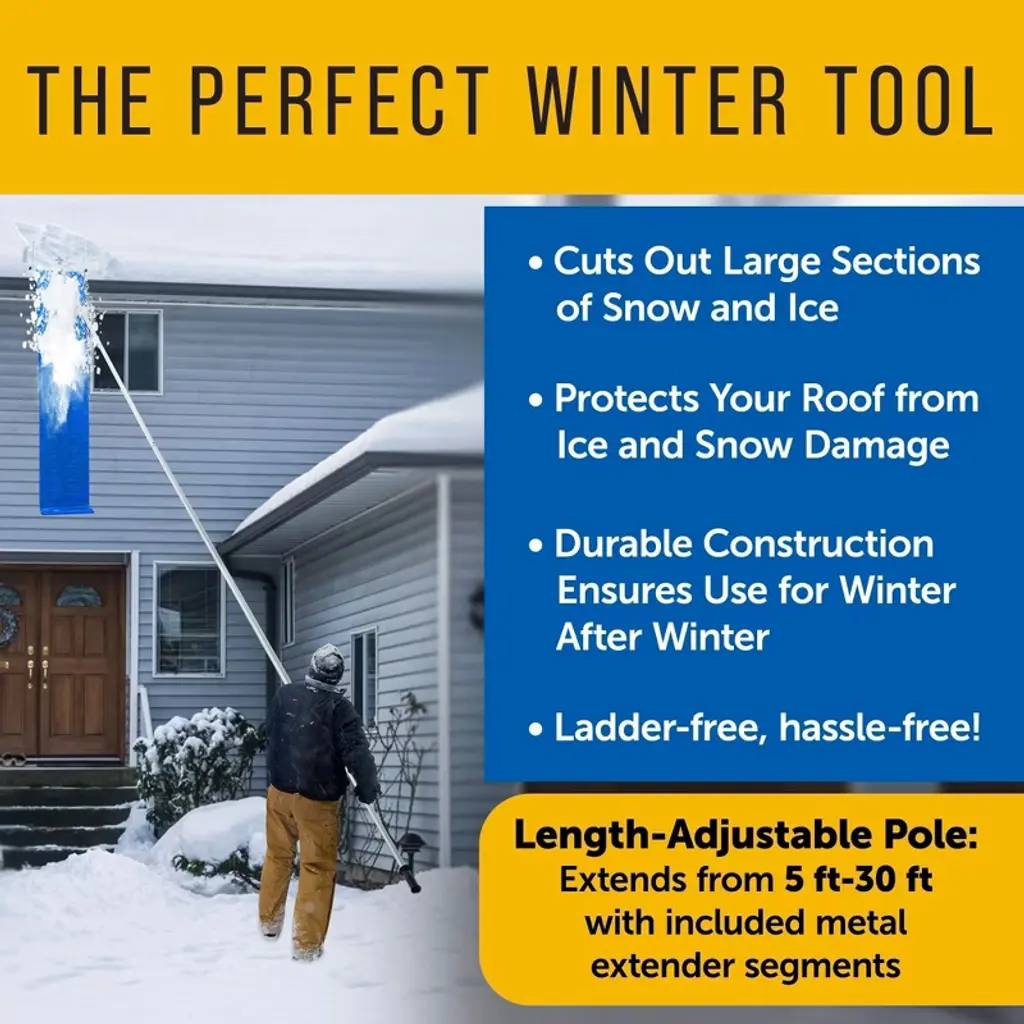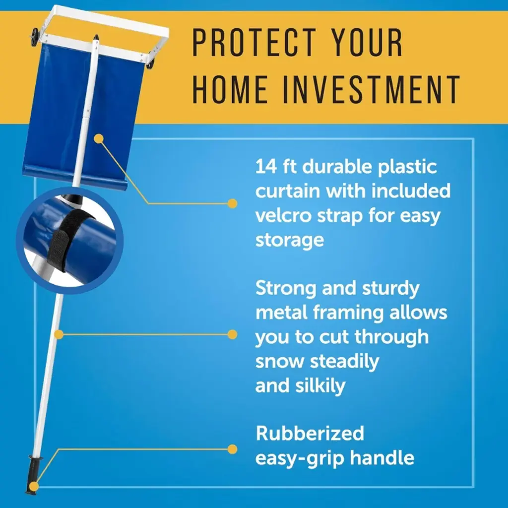 Every winter, as the snowflakes fall, you dread spending hours outside in the cold shoveling. If you live in an area that gets hit with heavy snowfall every winter, then you know the importance of keeping your roof clear. With traditional snow removal equipment or a snow broom for roofs, you must prop the ladder against your house and climb onto your slippery rooftop. Thanks to Maplefield’s Heavy Snow Remover Roof Rake, you can keep both feet on the ground, making your shoveling time much safer and more efficient. This snow remover for roofs is built with a robust metal frame so that it won't bend easily after many uses. Each roof rake blade section (17.5" wide x 9.5" high) is made from sturdy aluminum. Effortlessly cut through compact snow while being confident enough that you won't get cut in the process. The rubberized handle of the snow rake for roofs ensures a firm grip when dealing with slippery conditions. Instructions for Use: 1. Position your roof rake and slide it at the base of the roof. Avoid standing directly beneath the snow peeler roof rake, as snow will fall there. 2. Push firmly in line with the incline of your roof to begin cutting into the snow. 3. The snow will give way and slide down the 14ft PVC curtain to the ground. 4. Add the included 5ft roof rake aluminum extension poles to your telescoping snow shovel if more height is needed to reach the top of your roof.