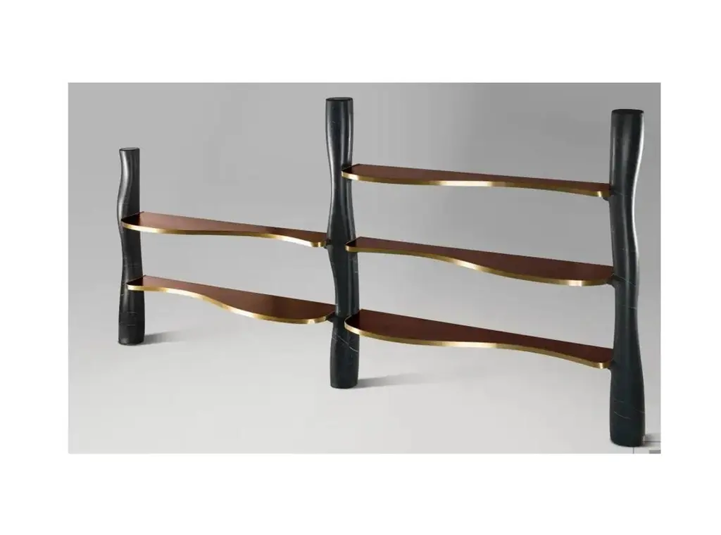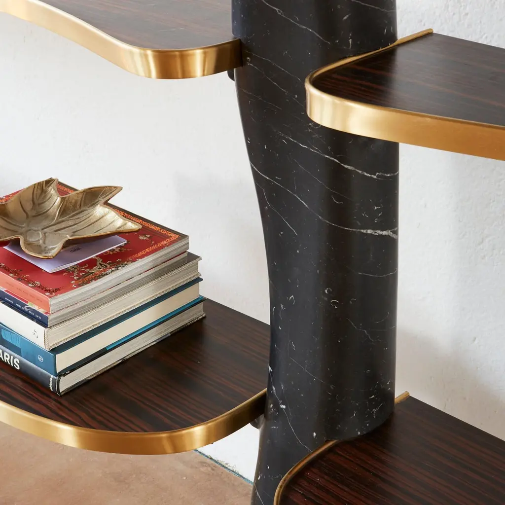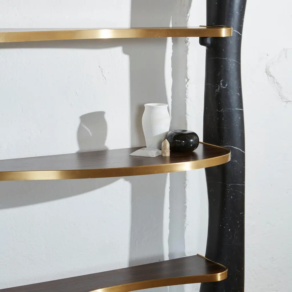 Marble And Ebony Natura Sculptural Library by Atelier TerraiDimensions: D 35 x W 360 x H 175 cm.Materials: Marble and ebony.A celebration of the sinuous shapes found in nature, this sculptural library is composed of three harmonious tree trunks made of black Marquina marble, arising from the floor to sustain large leaf-like curvy wooden shelves crafted of Macassar ebony wood with brass borders.Atelier Terrai was founded in 2019 from the partnership between Simone Raimondi of O&G Raimondi Marmi and Matteo Terragni of Matlight Milano, merging over 60 years of experience in stonework into a new, exceptional furniture and lighting brand.First presented at Maison & Objet in Paris, our brand revolutionizes the traditional use of marble, crafting sculptural pieces that combine art with design, high-quality craftsmanship, and innovative technologies to interpret natural shapes in refined ways.Sixty years experience in the processing of natural stone blocks form the basis of unique and exclusive pieces, characterized by high-level Italian design, extreme attention to detail in the finishes and rigorous selection of materials.