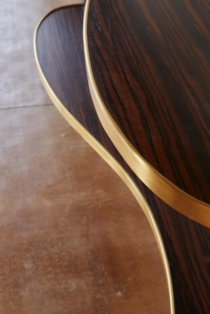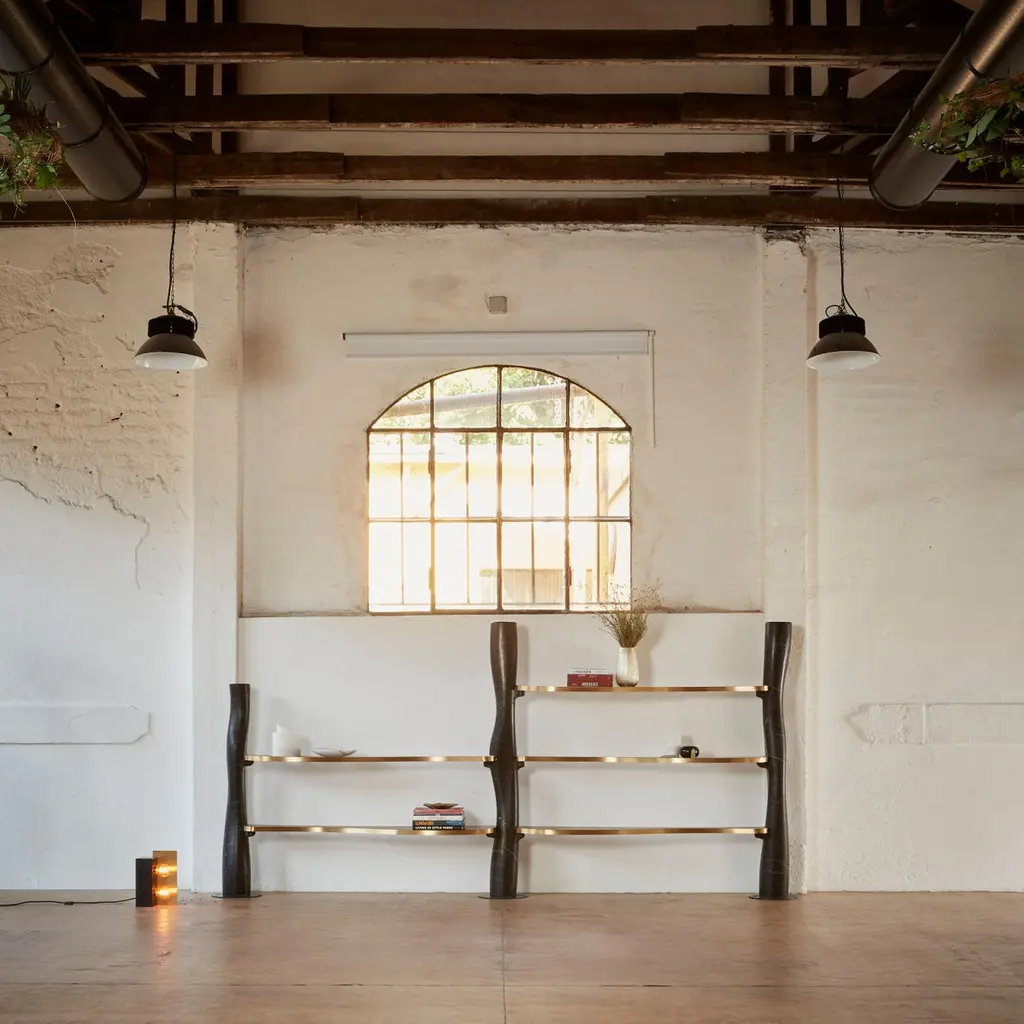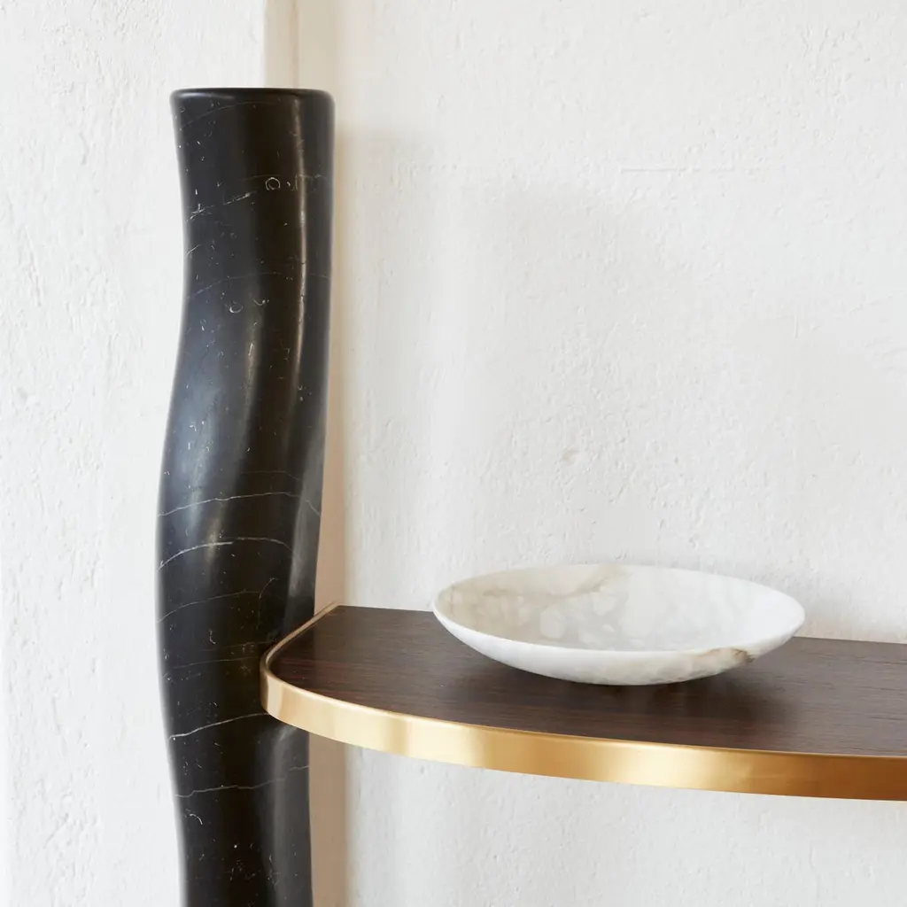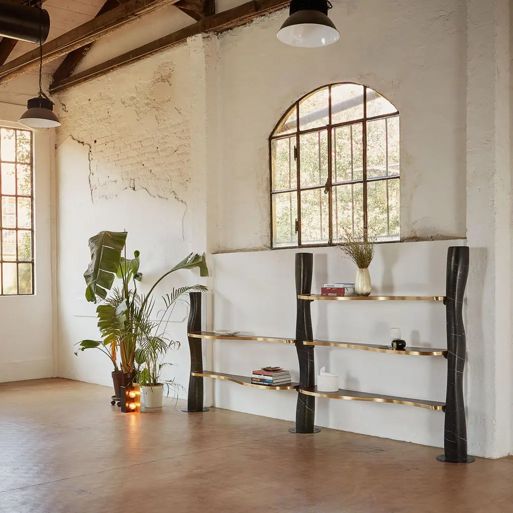 Marble And Ebony Natura Sculptural Library by Atelier TerraiDimensions: D 35 x W 360 x H 175 cm.Materials: Marble and ebony.A celebration of the sinuous shapes found in nature, this sculptural library is composed of three harmonious tree trunks made of black Marquina marble, arising from the floor to sustain large leaf-like curvy wooden shelves crafted of Macassar ebony wood with brass borders.Atelier Terrai was founded in 2019 from the partnership between Simone Raimondi of O&G Raimondi Marmi and Matteo Terragni of Matlight Milano, merging over 60 years of experience in stonework into a new, exceptional furniture and lighting brand.First presented at Maison & Objet in Paris, our brand revolutionizes the traditional use of marble, crafting sculptural pieces that combine art with design, high-quality craftsmanship, and innovative technologies to interpret natural shapes in refined ways.Sixty years experience in the processing of natural stone blocks form the basis of unique and exclusive pieces, characterized by high-level Italian design, extreme attention to detail in the finishes and rigorous selection of materials.
