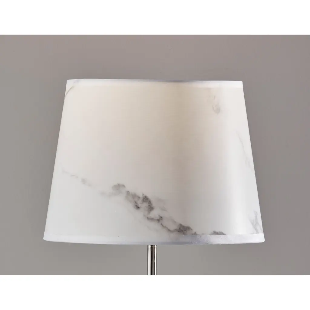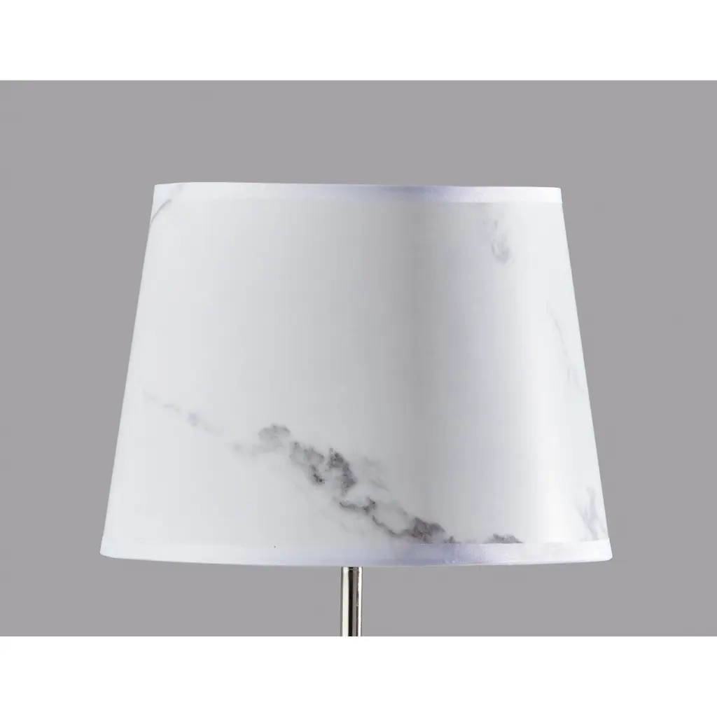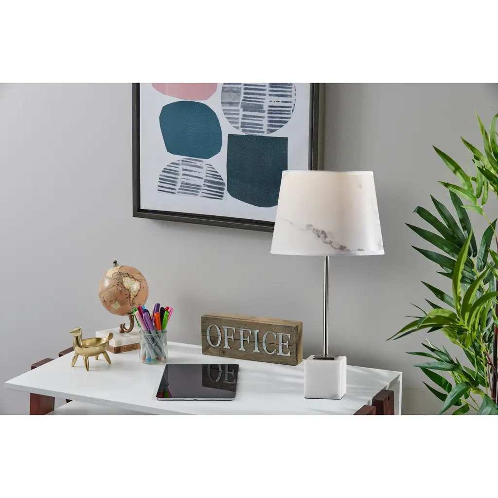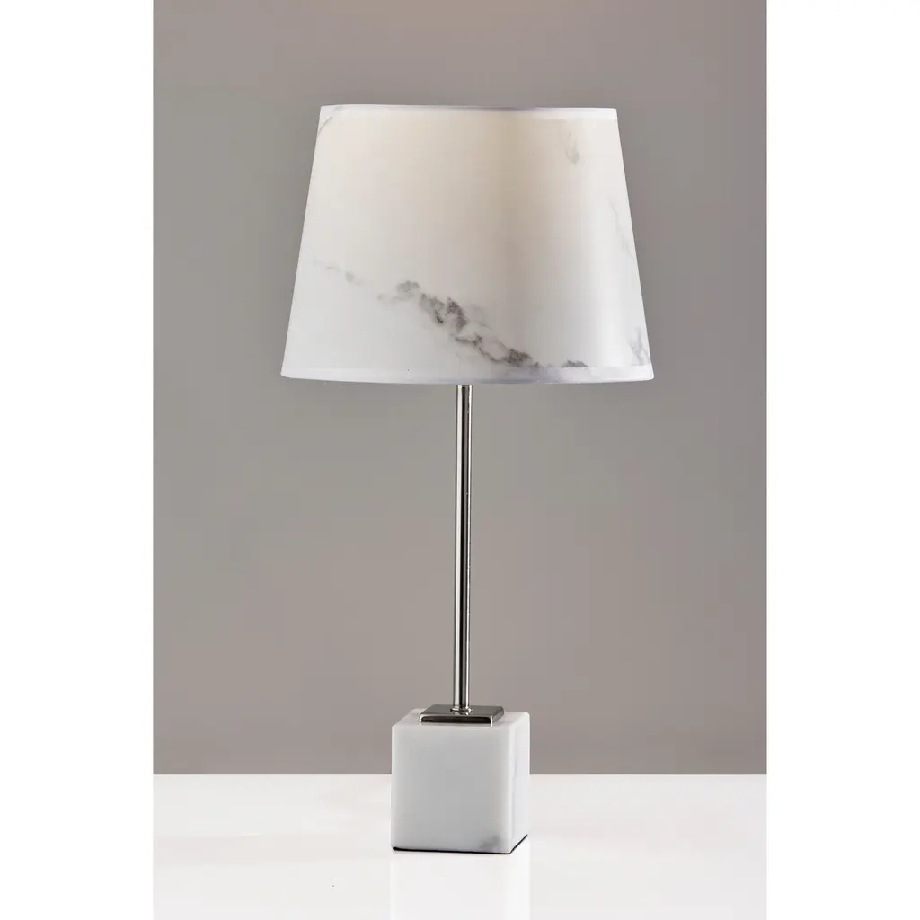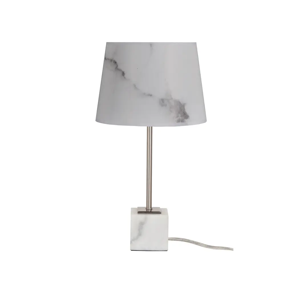 A simple silhouette is updated with high quality materials in this stick table lamp. A chunky square, white marble base keeps the lamp sturdy and strong while adding elegance to the look. A brushed steel finish is softened with a white faux marble paper shade that reveals its beautiful effect when lit.