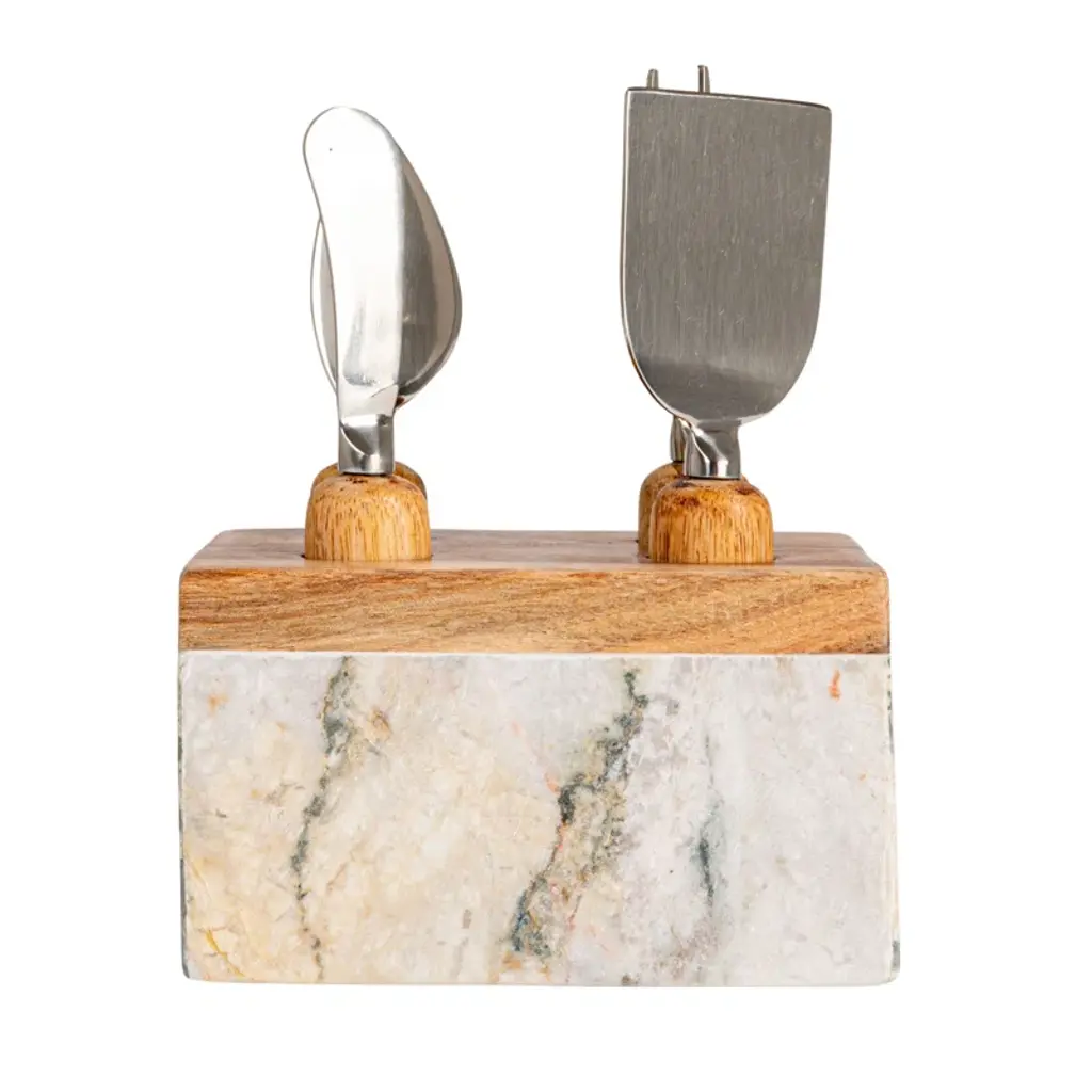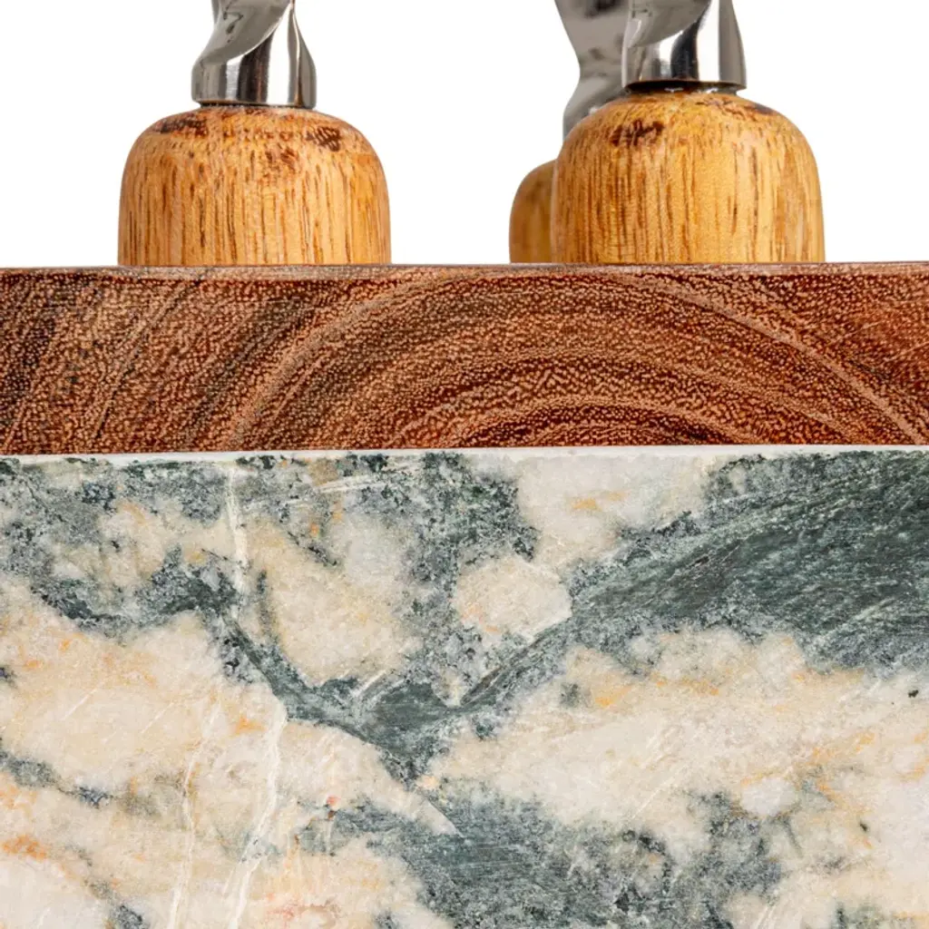 This Marble Majesty Cheese Server Set is a harmonious blend of elegance and practicality. Each utensil, from the chisel knife to the fork, is crafted from the finest marble and designed to handle a variety of cheeses, from soft to hard. The mango wood stand is not just a base; it's a statement piece that enhances the overall presentation. With dimensions that make it perfect for any gathering, this set is sure to be a conversation starter and a testament to impeccable taste in serveware. Whether the home style is Scandinavian, farmhouse, or cottage, these cheese servers will add a touch of sophistication to every entertaining essential. With their sleek design and versatile functionality, these cheese servers are a must-have for any host.