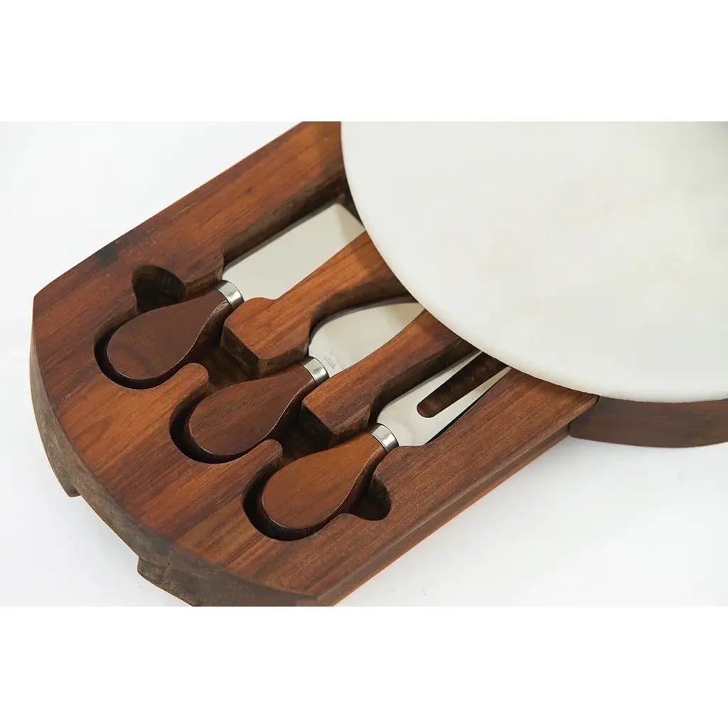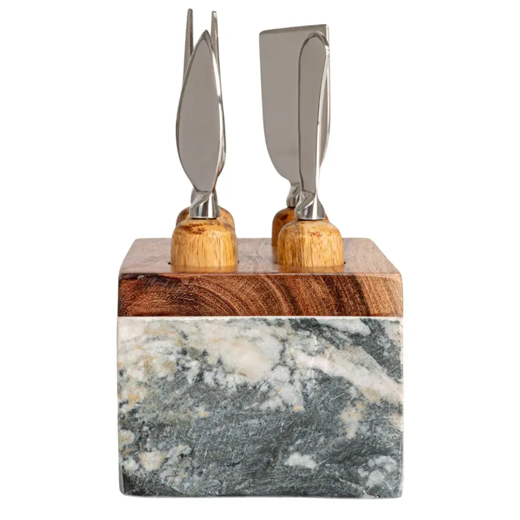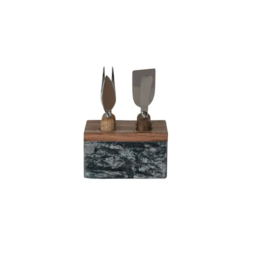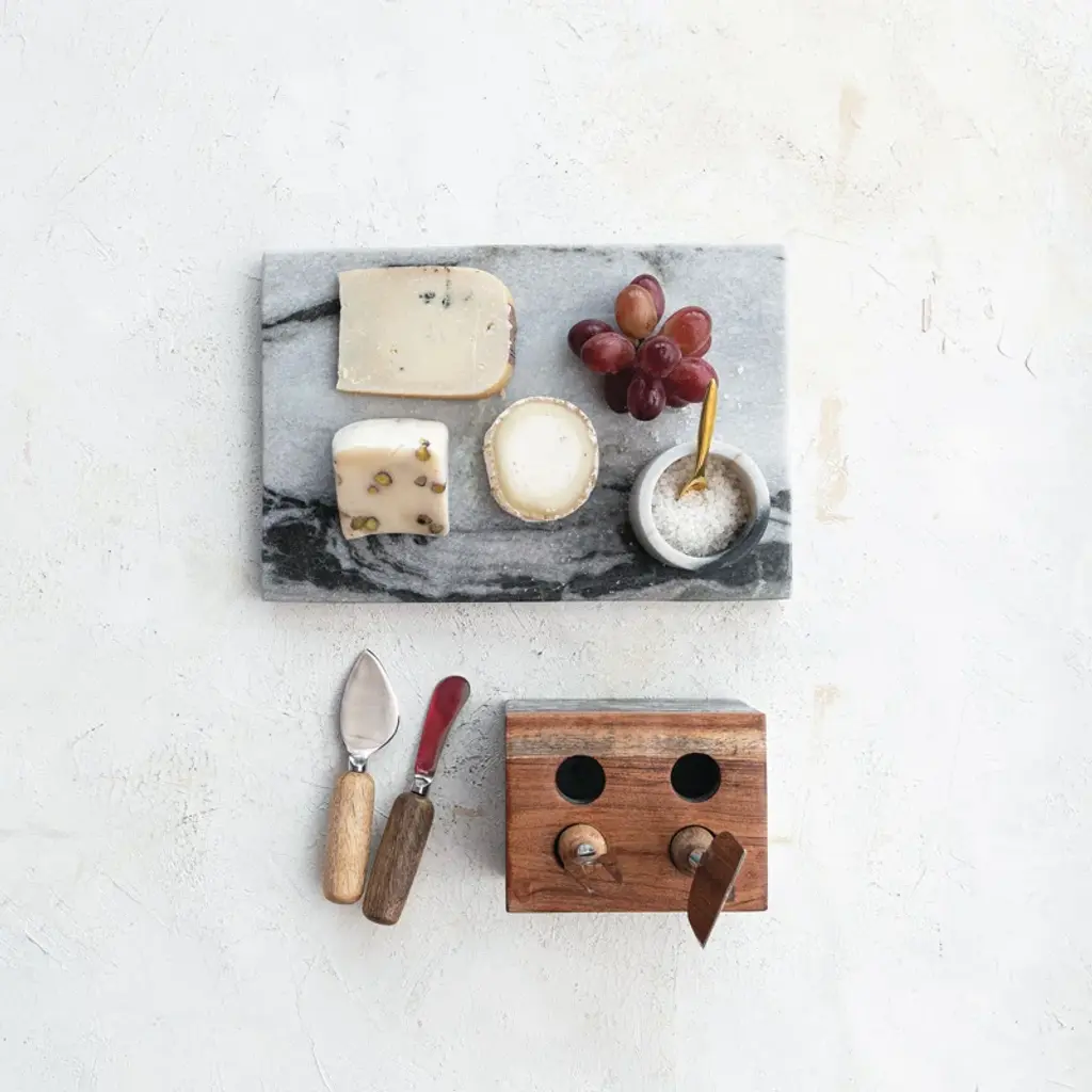 Marble Cheese Server Set With Mango Wood Stand, Black, Set Of 4
