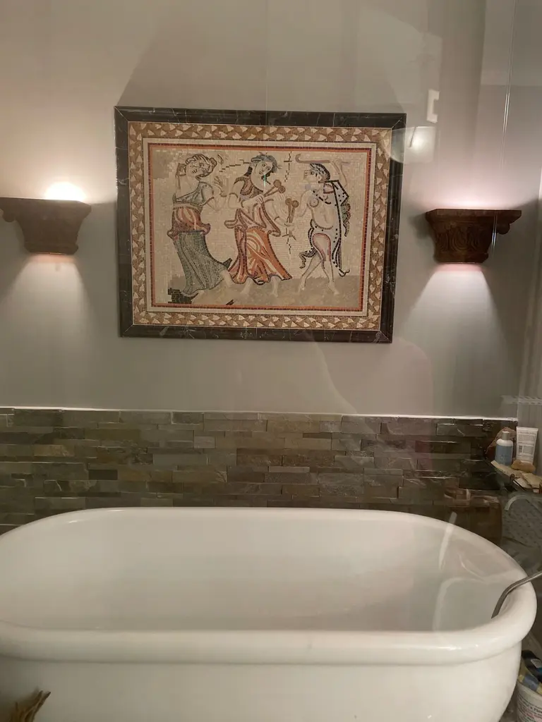 Introducing the exquisite "Marble Mosaic Reproduction - Dionysian Dance," a breathtaking piece of art that brings to life the timeless celebration of revelry and joy in honor of the god of wine, Dionysus. This masterpiece features a stunning depiction of three maenads, spirited figures from Greek mythology, captured in a moment of ecstatic dance, surrounded by the vibrant hues of natural marble tiles. Each tile is meticulously hand-selected and crafted by skilled artisans, ensuring that every mosaic is not just a decoration, but a unique work of art. The intricate details and vibrant colors resonate with the energy of the Dionysian spirit, making this mosaic a perfect focal point for any room, whether it be in a modern apartment, a classical home, or a chic studio.The "Dionysian Dance" mosaic is available in both standard and custom sizes, allowing you to find the perfect fit for your space. Whether you're looking to create a stunning accent wall, a tasteful addition to your living room, or a unique piece for an entryway, this mosaic effortlessly elevates any decor.Bring a touch of history and culture into your home with this exceptional reproduction. It not only honors the ancient traditions of artistry but also serves as a conversation starter and an embodiment of joy and celebration. Transform your living space into a sanctuary of aesthetic beauty and timeless elegance with the "Marble Mosaic Reproduction - Dionysian Dance."