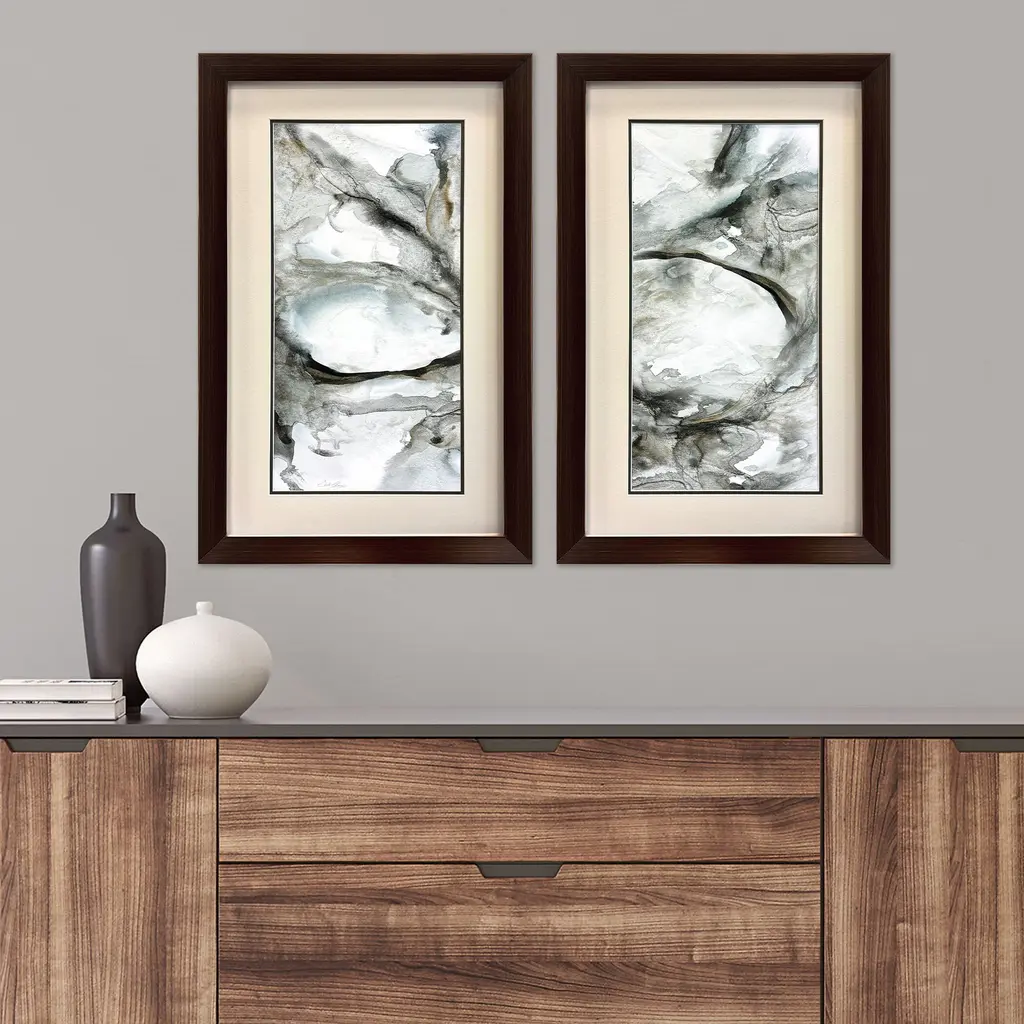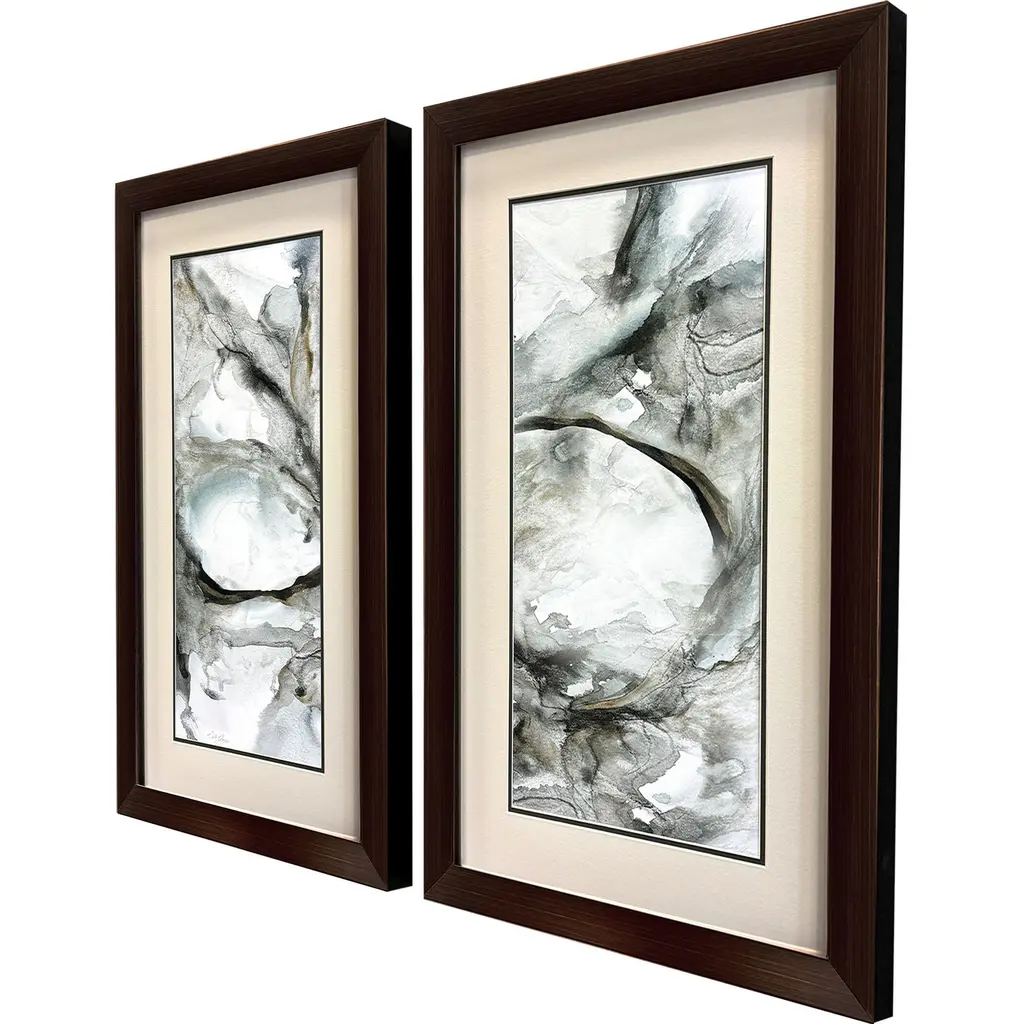Swirling marbleized designs are double matted in oyster and espresso. Framed in a block profile molding in a dark wood finish with a silver lip.