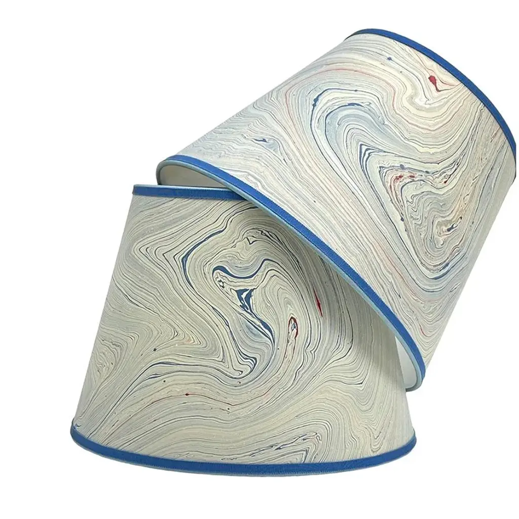 Marbled paper with wonderful blue swirl and bits of red and silver, trimmed with two tones of blue grosgrain. Available in 3 sizes: 8” x 12” x 8.75” 9” x 16” x 11” 12” x 18” x 12” Pictured in 8” x 12” x 8.75” Please note that larged sizes use multiple sheets of paper. There are extra seems in the back of the shades. All shades are made to order, by hand and are not returnable Please be sure to double check sizing before ordering. Shades sold individually.