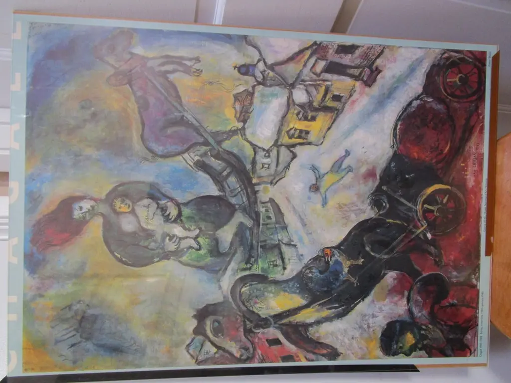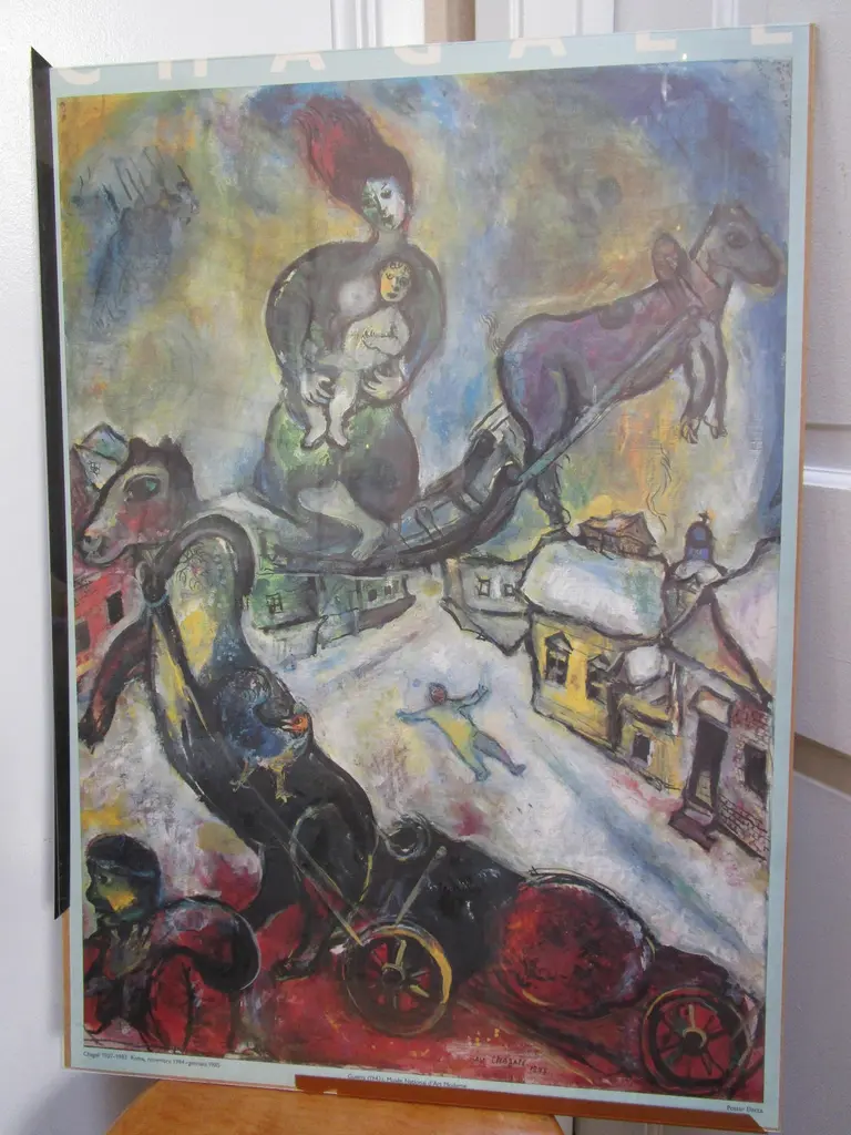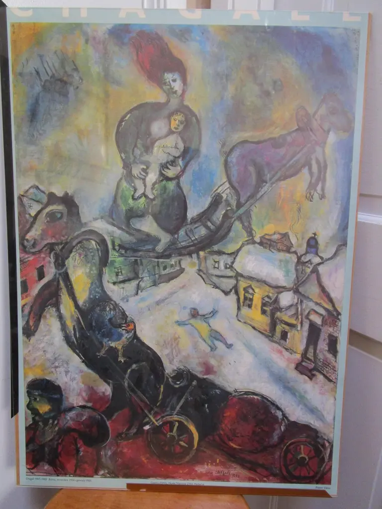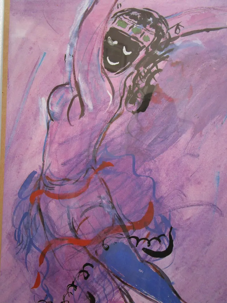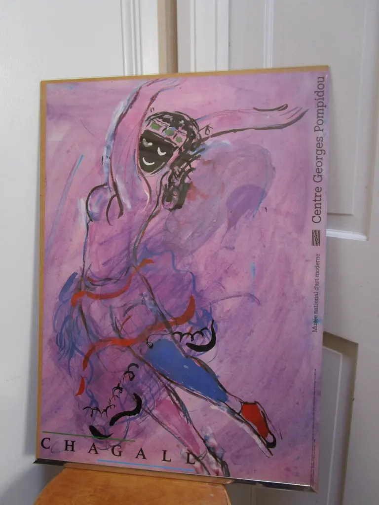 This is a special pair. Celebrate the dreamlike world of Marc Chagall with this striking pair of unused exhibition posters, preserved flat and in excellent condition. This duo includes a 1983 Rome showpiece featuring Chagall’s folkloric village and horse imagery — evoking his Eastern European hometown of Vitebsk — alongside a vivid Centre Georges Pompidou lithograph of a dancer in joyful motion, rendered in bold purples and reds. Both posters are offset lithographs produced under museum auspices and measure 28 x 20 inches. Never rolled or mounted, their vibrant colors and rich symbolism reflect Chagall’s iconic blend of memory, fantasy, and spiritual longing. This ready-to-frame pair makes an ideal statement for collectors, designers, or anyone drawn to modernist storytelling. Sold together for impact, this set bridges Chagall’s theatrical and deeply personal artistic worlds. 1985, the year the "Dancer" was exhibited was the year of the artist's death.