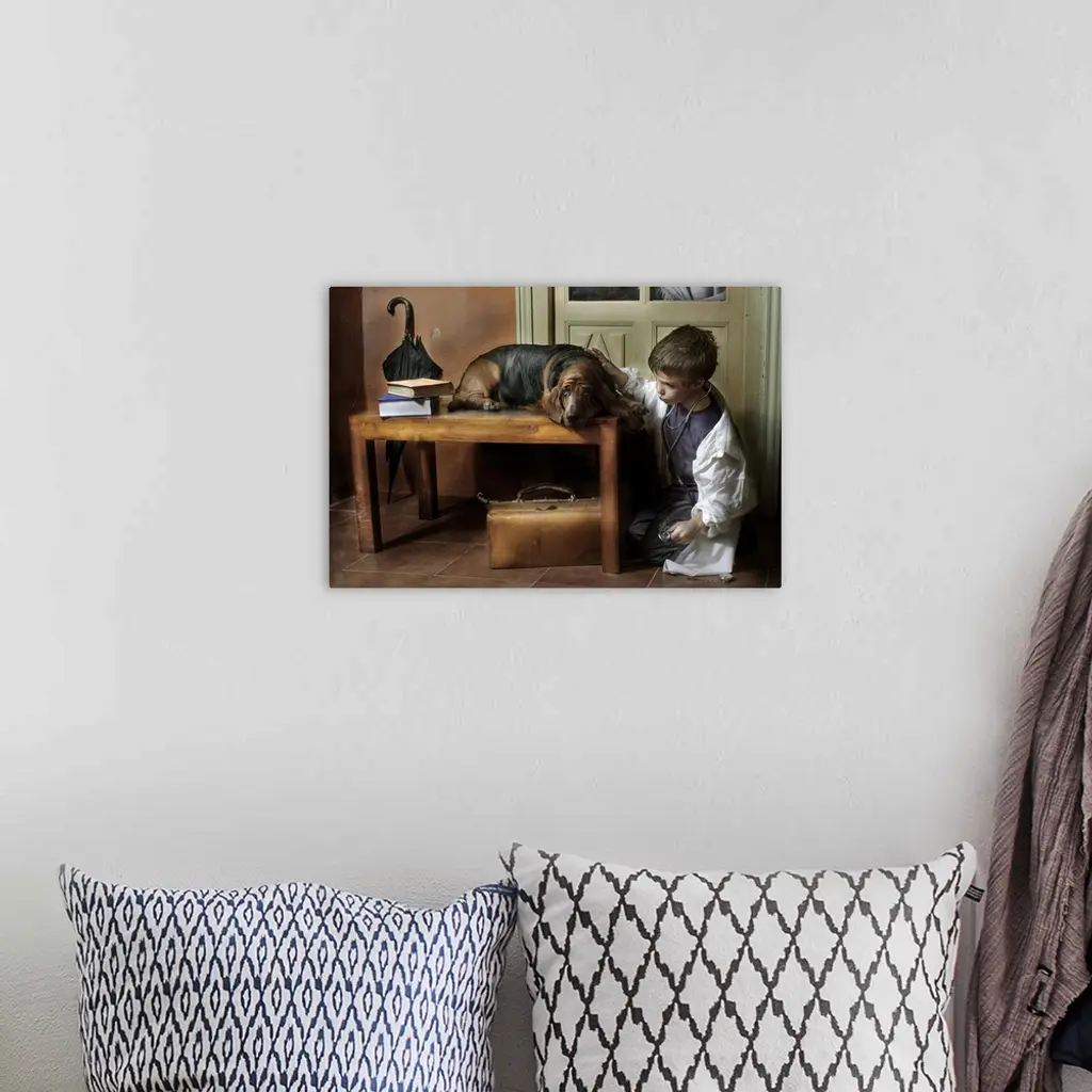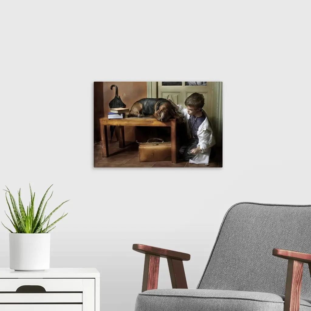 A young boy wearing a stethoscope plays veterinarian with his Basset hound.