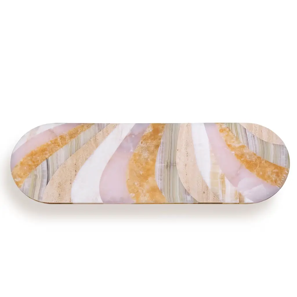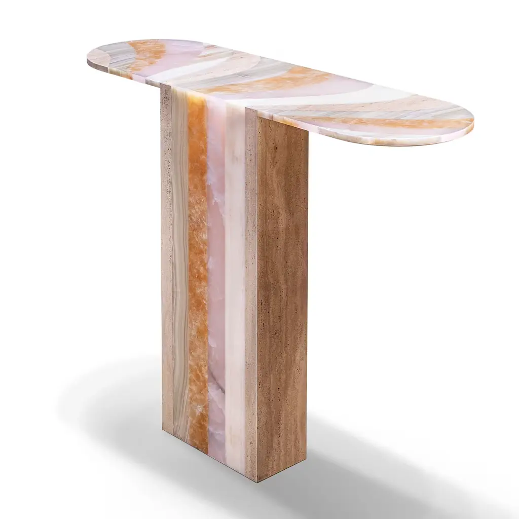 An expression of femininity, this console daringly juxtaposes prized stones to reveal a rainbow-like look of exceptional visual impact. The combination of Classic Roman Travertine, pink onyx, honey onyx, ivory onyx, and Afghan onyx gives birth to a striped design that can be admired troughout the structure, from the monolithic leg to the oblong top.