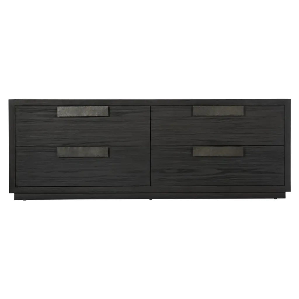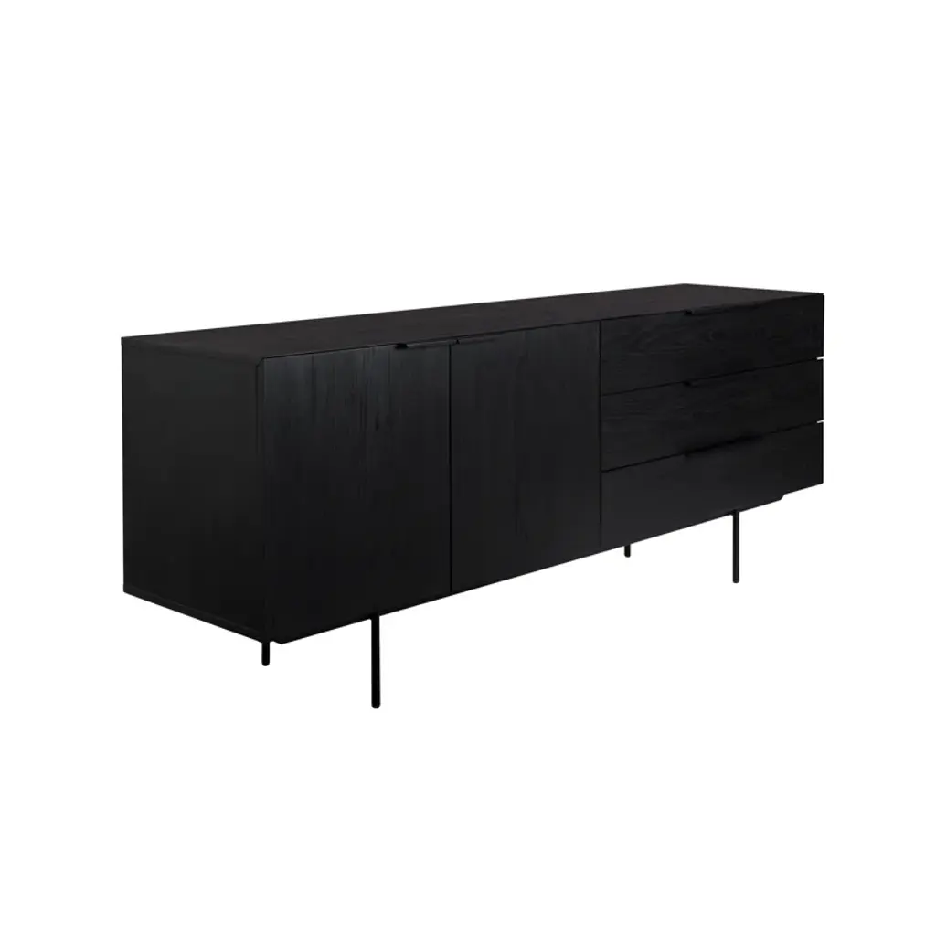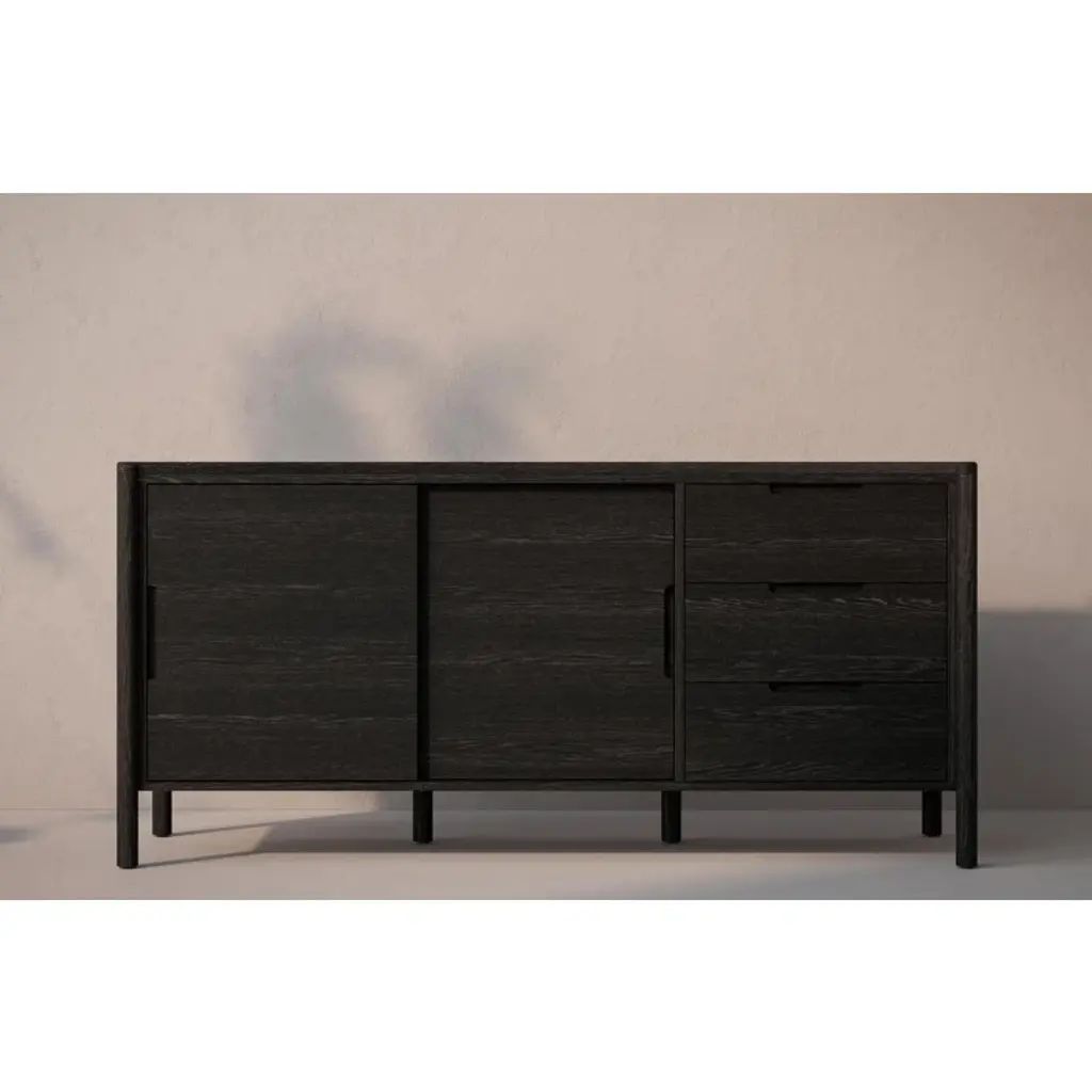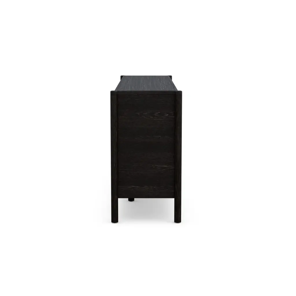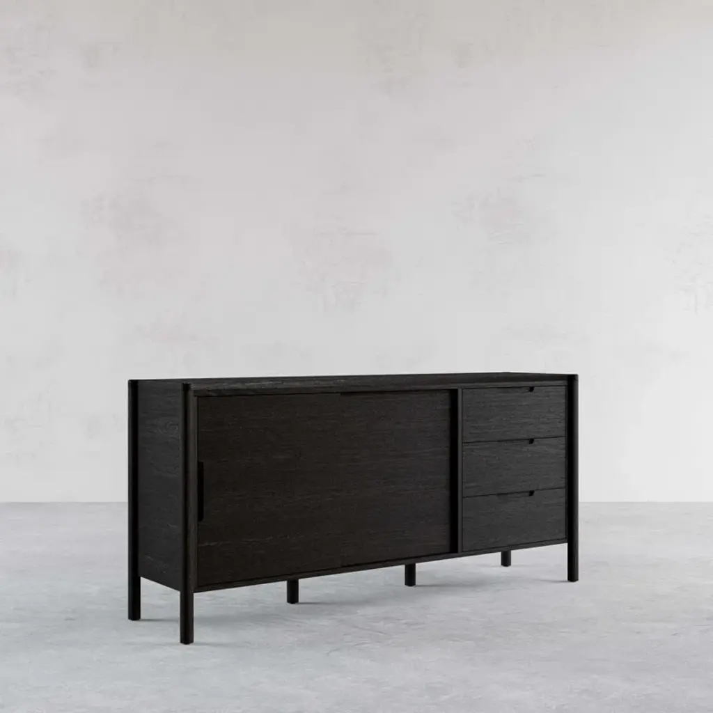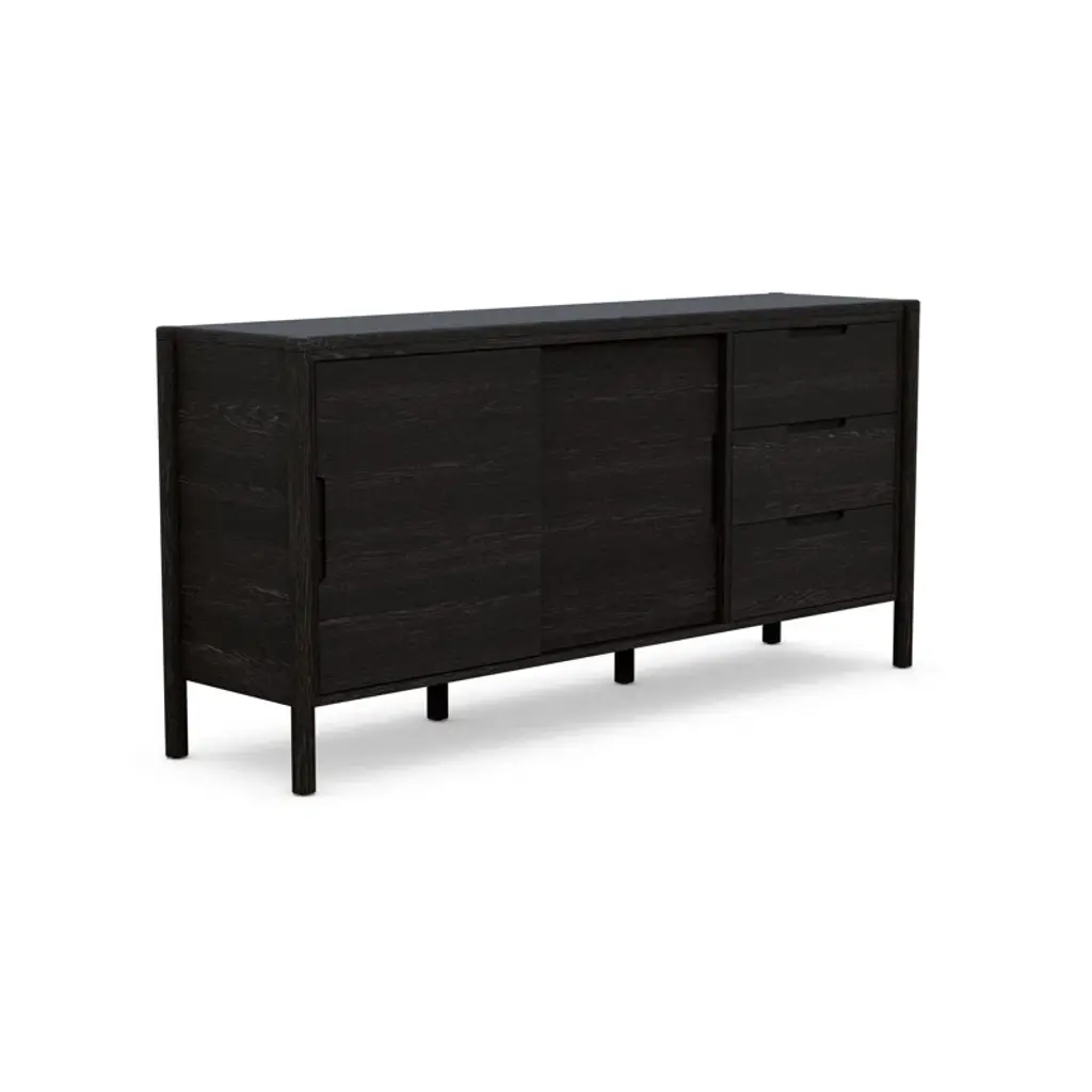 An artfully asymmetric design in an espresso-hued French oak finish, the dresser has a trio of deep drawers with inset pulls and a generous cabinet with shelving.