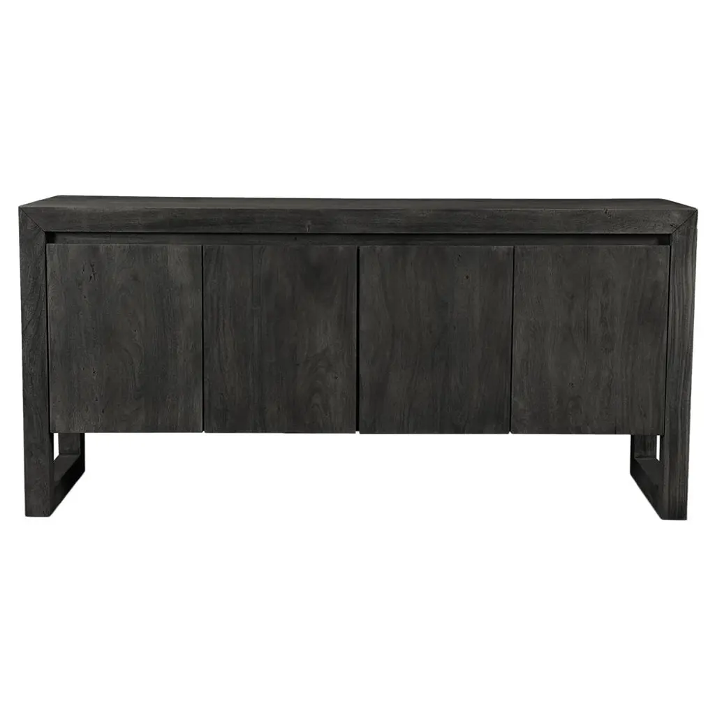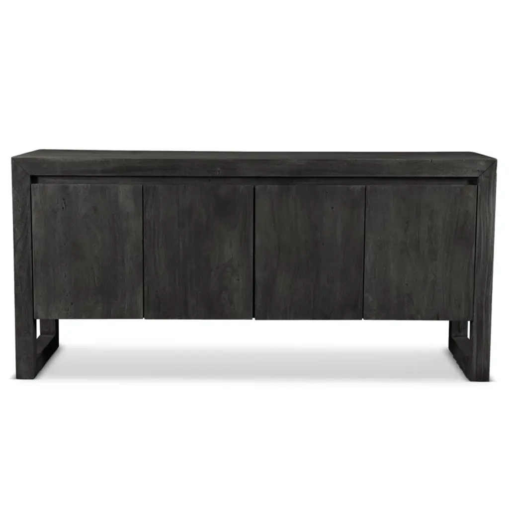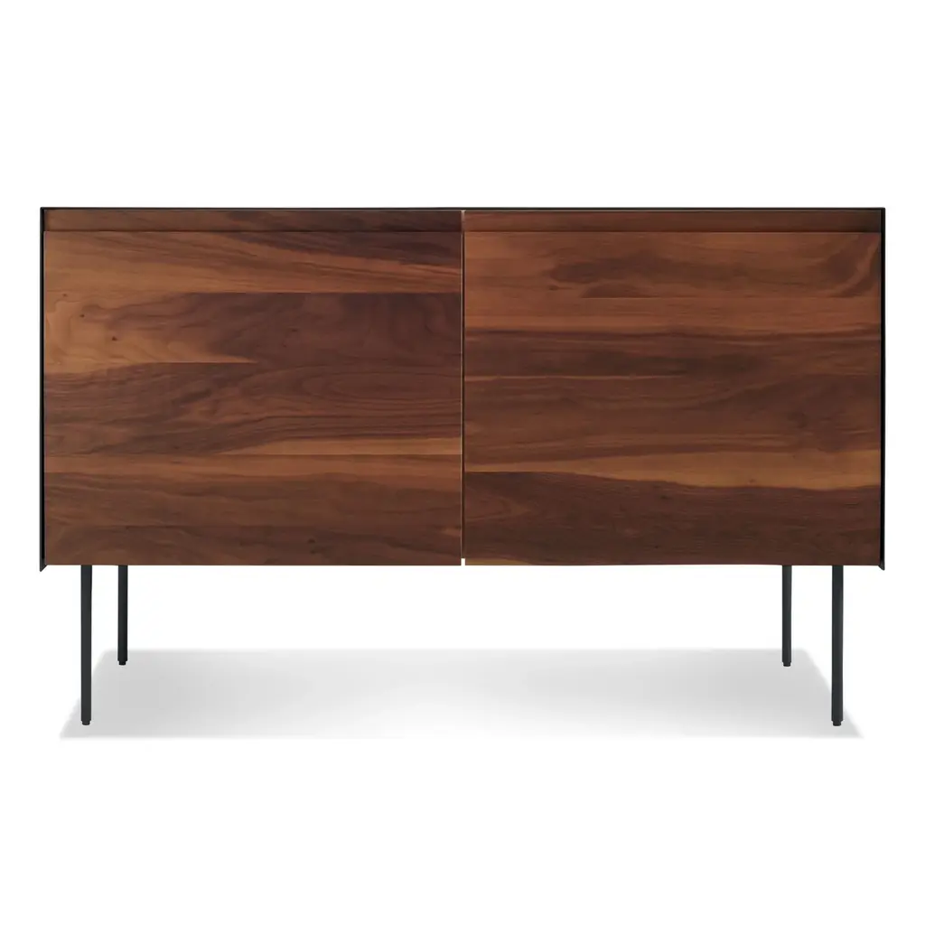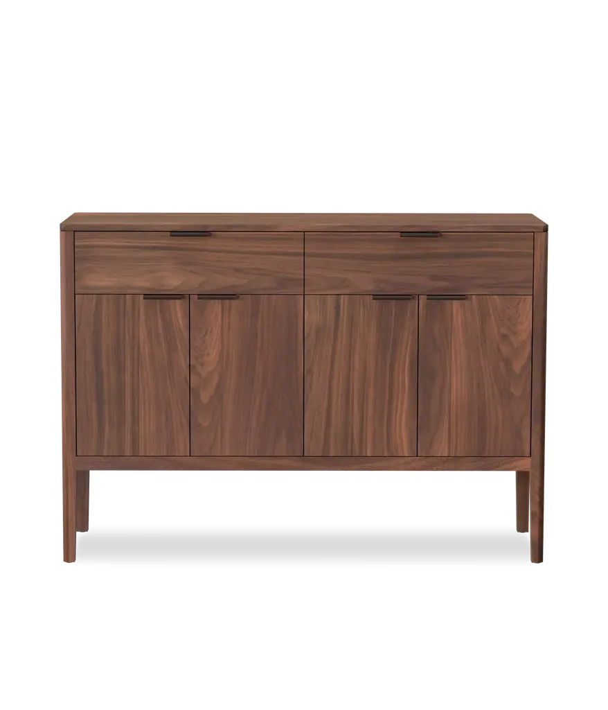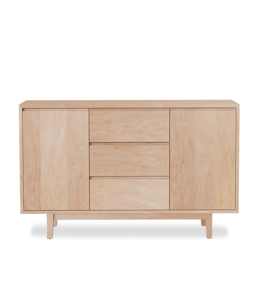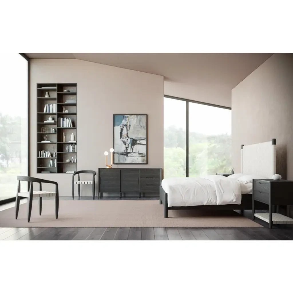 An artfully asymmetric design in an espresso-hued French oak finish, the dresser has a trio of deep drawers with inset pulls and a generous cabinet with shelving.