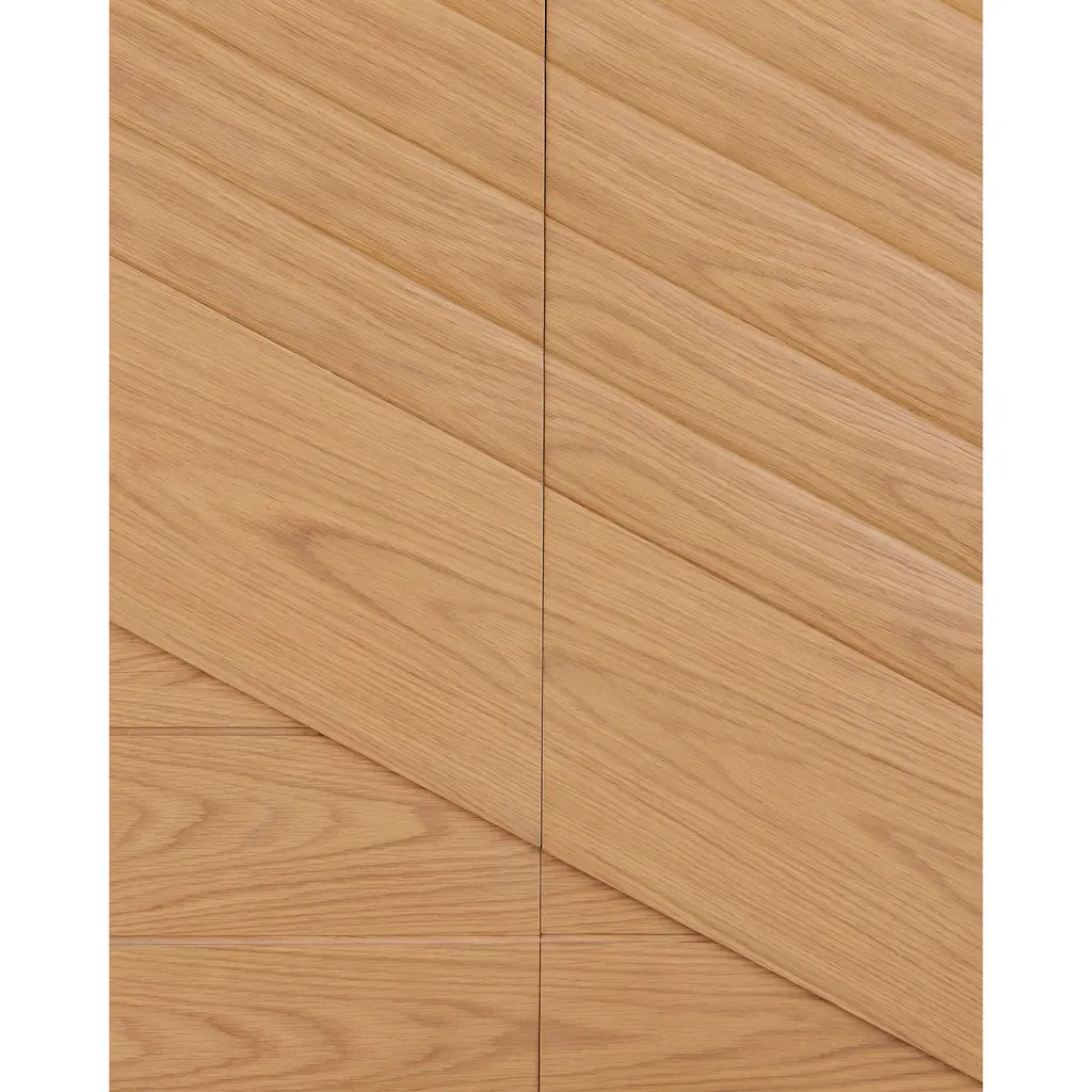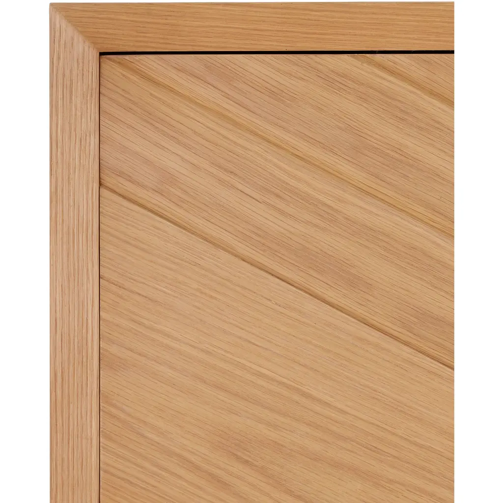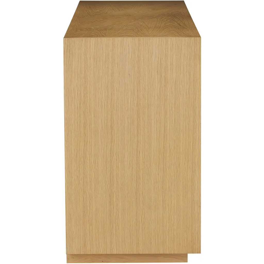 Made of white-oak solids and veneers in a light oak finish, the Margot Natural Oak Credenza was inspired by the casual style of Californias coastal communities. A number of outstanding features include a full chamfered profile edge on the face frame, and a multi-dimensional angled pattern on the doors created with white oak crown veneers. There are generous-sized drawers with beige velvet liners, and the drawers are push to open and close.