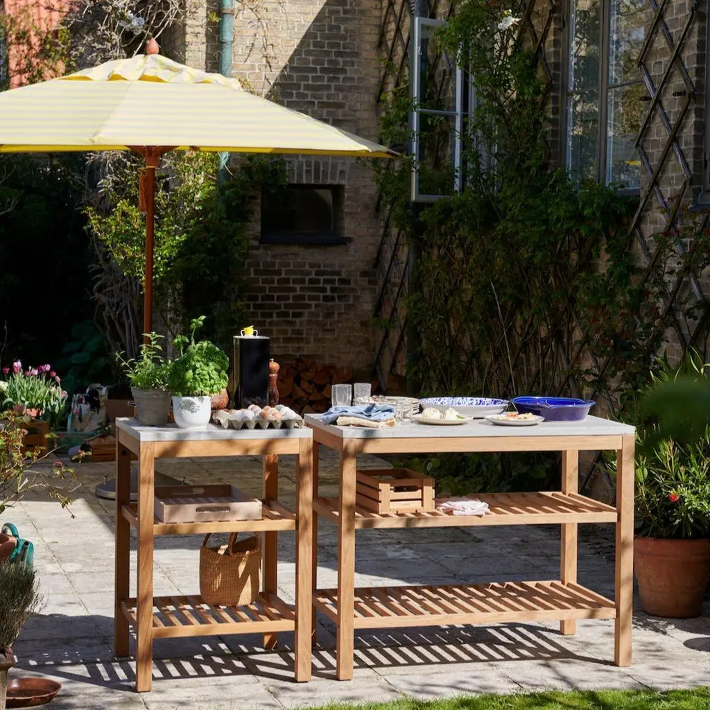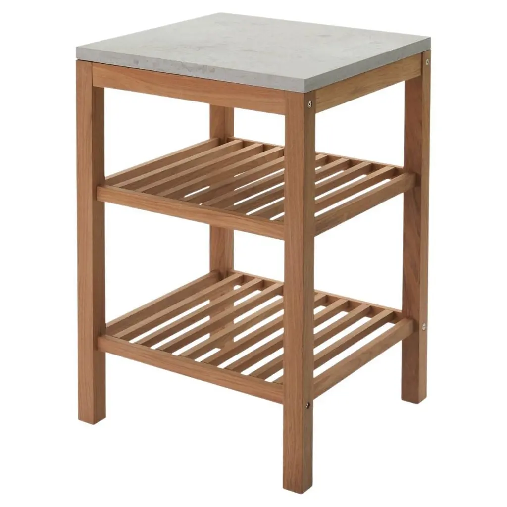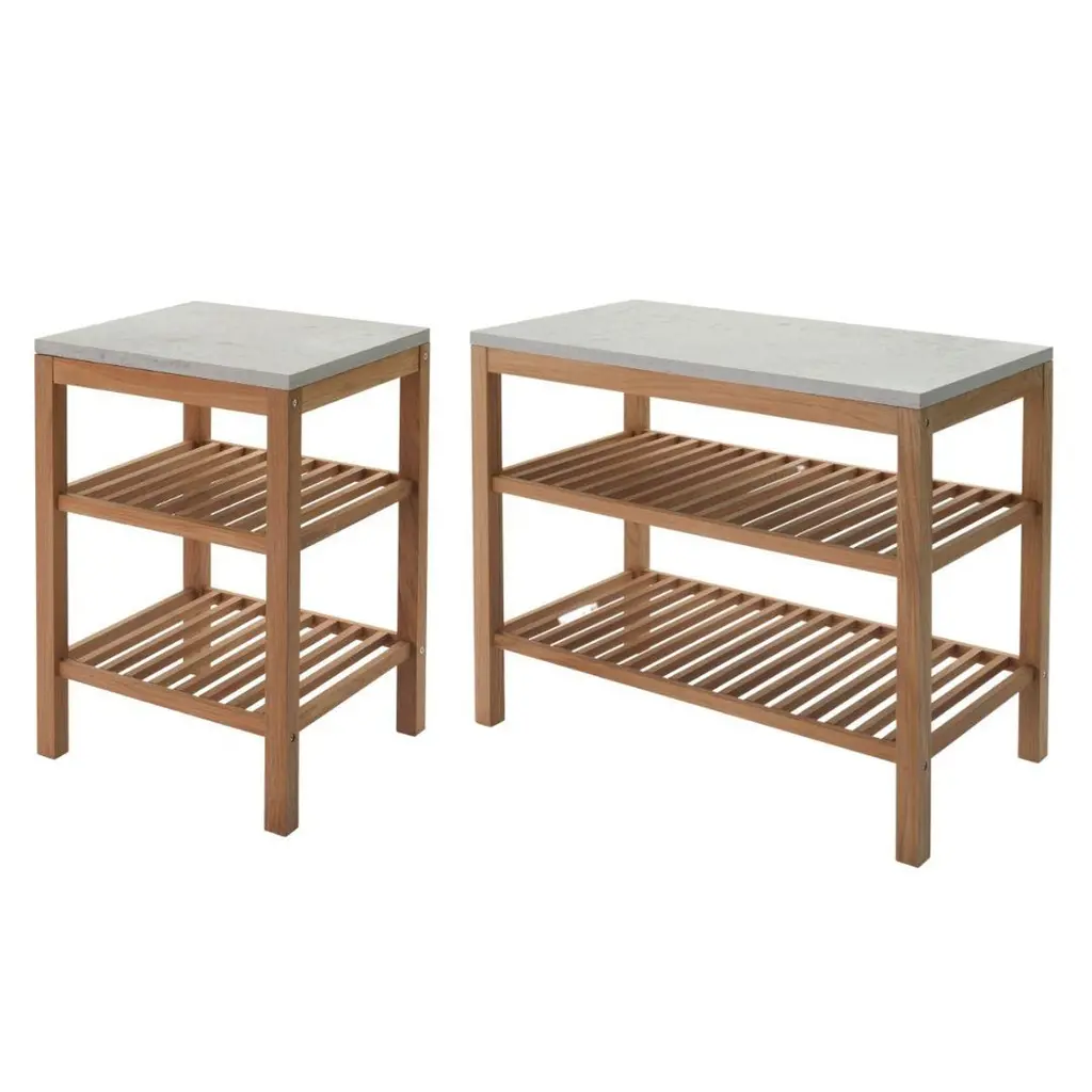 Maria Zachariae outdoor 'Pantry Module 2' in limestone and teak for Skagerak Skagerak was founded in 1976 by Jesper and Vibeke Panduro, who took inspiration from their love of Scandinavian design and its rich tradition. The brand emphasizes sustainability by using responsibly sourced materials and production methods that minimize waste and reduce environmental impact. Each piece of handcrafted furniture is designed to age with grace and last for generations.The 'Pantry Module' was designed to be a versatile work station, both indoors and out. Built with two shelves to store utensils, crafting tools or your pots & soil, the Pantry Module is capped with a limestone top that is sanded smooth to accentuate the beautiful matte surface - perfect to hold your favorite outdoor portable lantern. The result is a delightful and practical addition of a workspace. Executed in FSC Certified teak and natural Swedish limestone to the exacting standards of Skagerak.Price per item. Available to order in unlimited quantities and in two sizes as the Pantry Module 1 and Pantry Module 2 - please see our separate listing. This listing is for the Pantry Module 2 in teak and limestone. In stock lead time 2-3 weeks. Out of stock lead time can be an additional 3-4 weeks, or longer. Lead times and stock availability are subject to change at any time and without notice. Please inquire for current lead times prior to placing time sensitive orders.Please note that only one representative example of each item is shown in the images. Limestone varies from item to item due to the organic and handmade nature of their fabrication. The limestone used is untreated and has a light sand grey color with warm nuances. Since the material has a porous and open surface structure it is receptive to grease, stains and acid. Over time, and with use, it will eventually embrace a beautiful patina adding to the uniqueness of each piece.Made to order.All sales final.