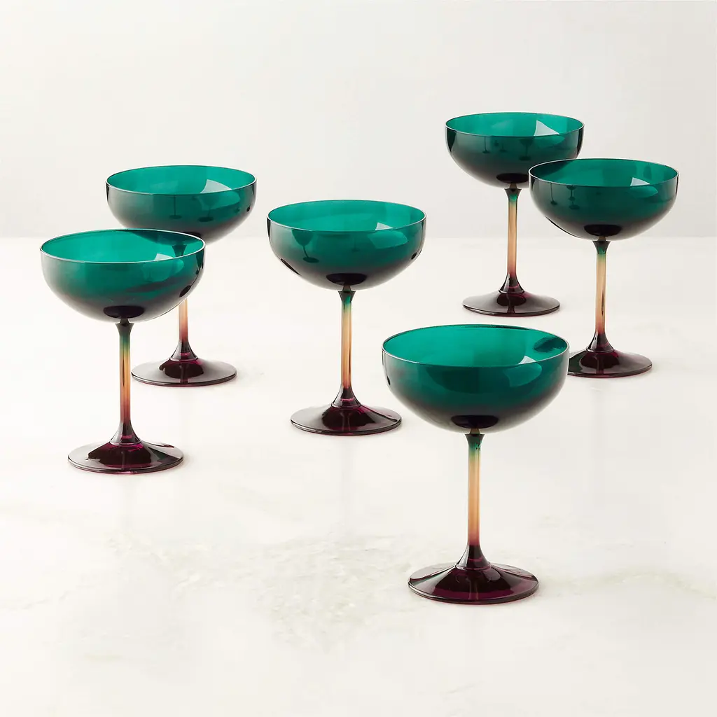 Delicate proportions and an ultra-saturated colorstory raise a glass to retro design in this colorful update by Chicago-based fashion designer Azeeza. Taking shape with a broad forest green bowl and shorter, more casual stem, this vibrant take on the classic coupe cocktail glass is inspired by the core hues in Azeeza's garment collections. CB2 exclusive.