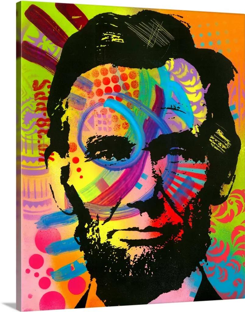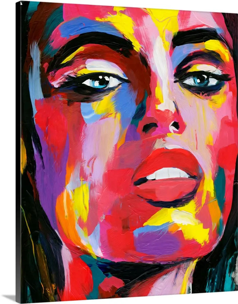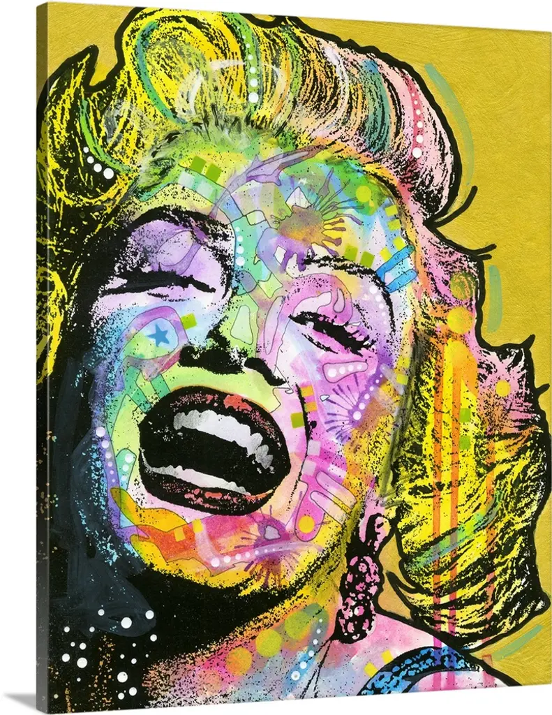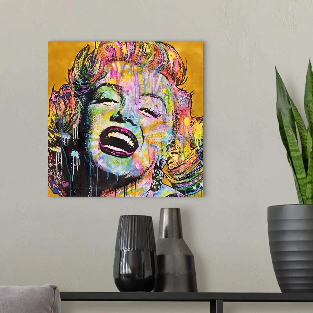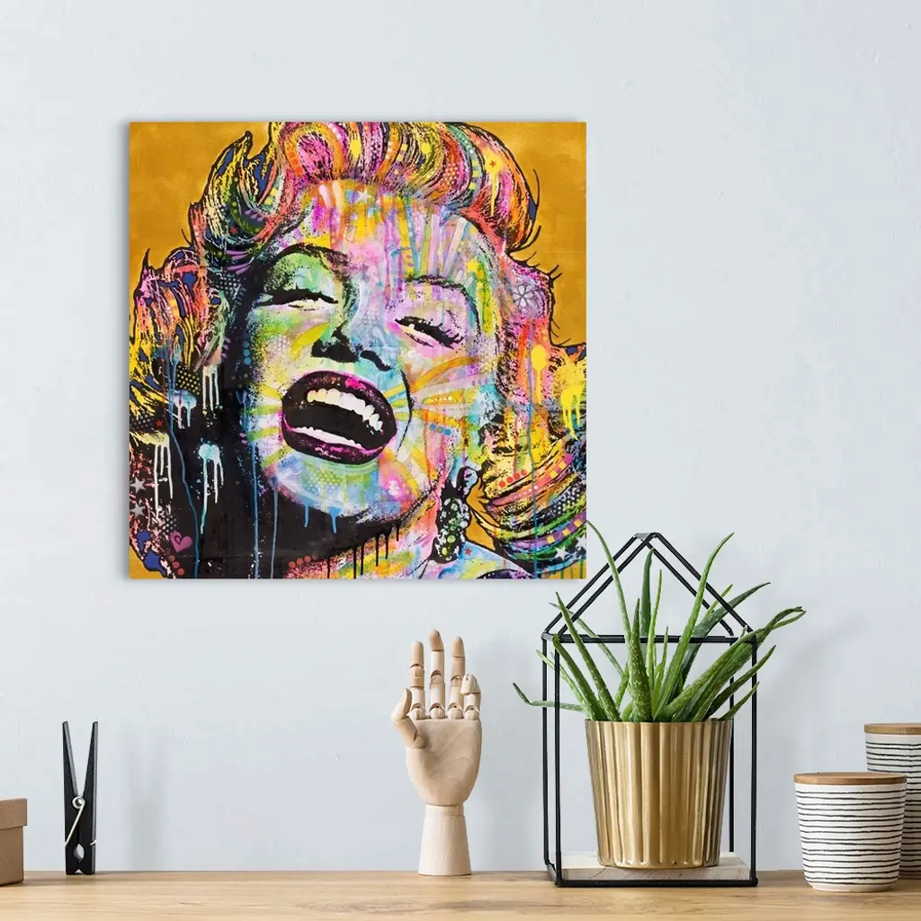Square illustration of Marilyn Monroe laughing and full of color with paint drips running down to the bottom on a gold background.