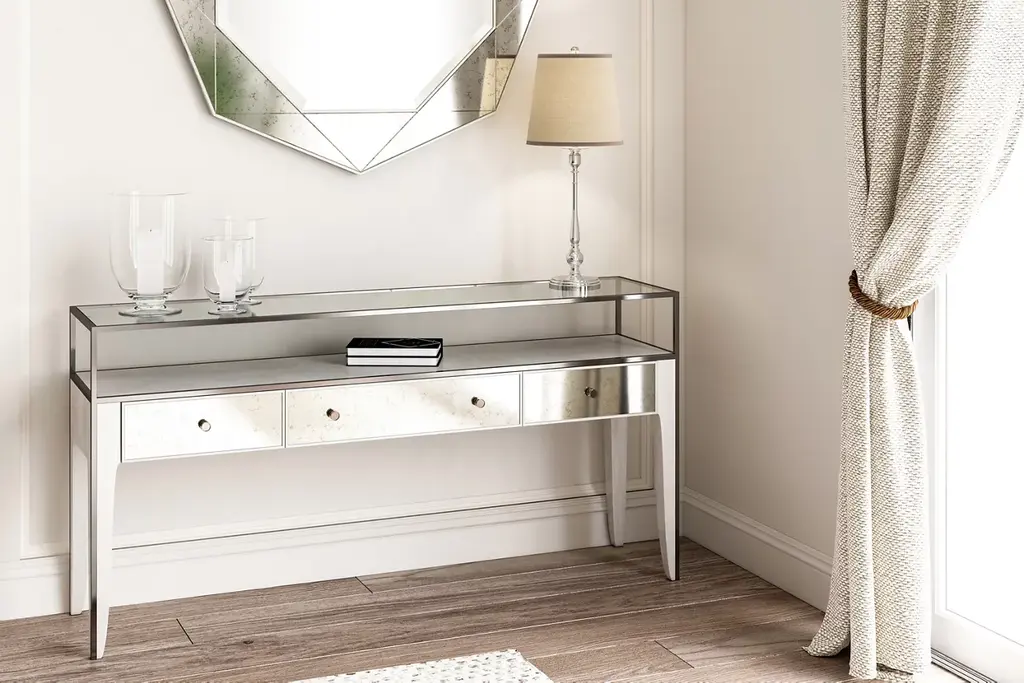 Our Marilyn console combines minimalist and modern design to create a stylish and sleek silhouette. With its three smooth-finished drawers and tempered glass shelf, this piece is expertly crafted to give your space stylish storage.