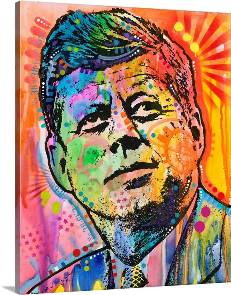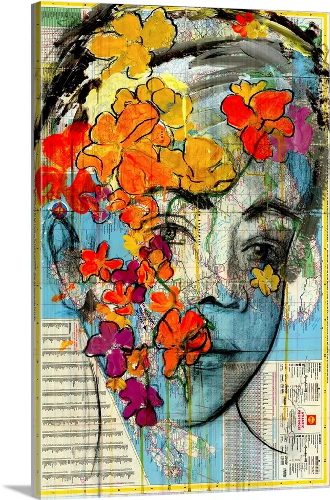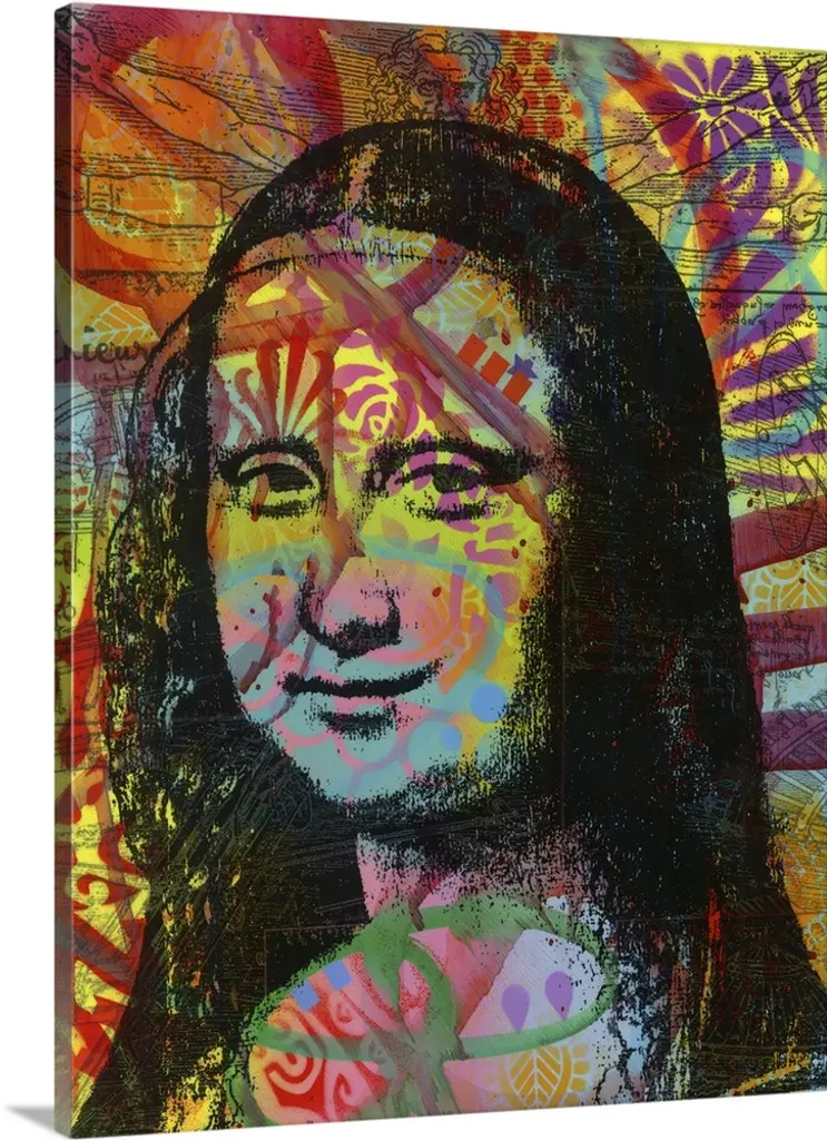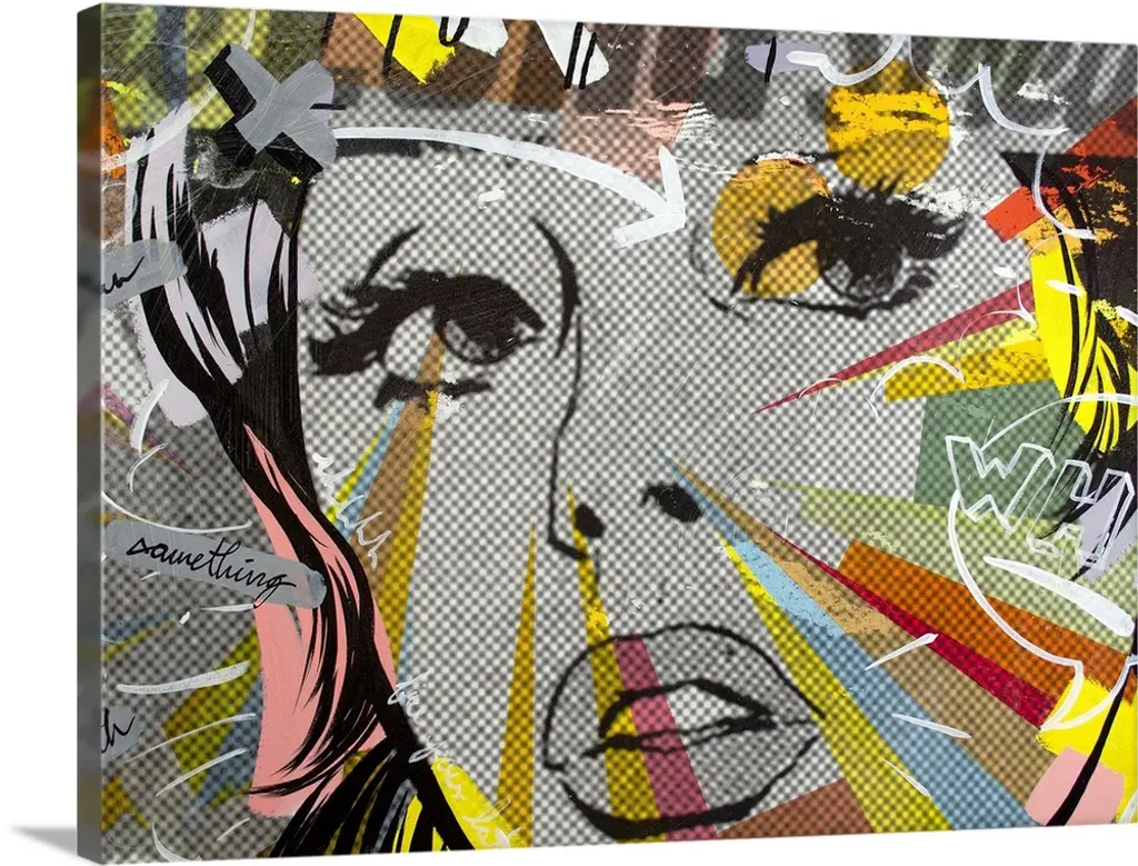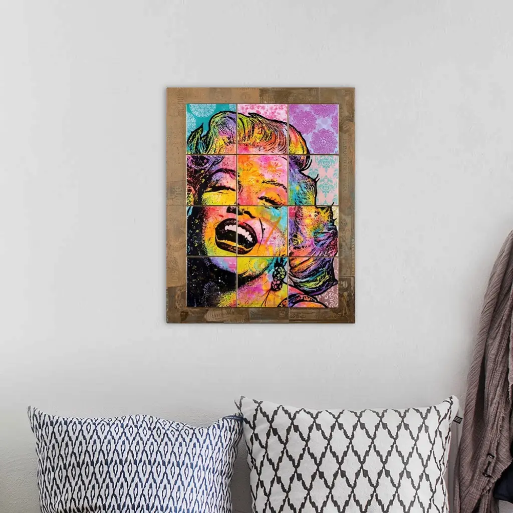 12 colorful tiles placed together to create Marilyn Monroe's face on top of a brown background with faded money illustrations.