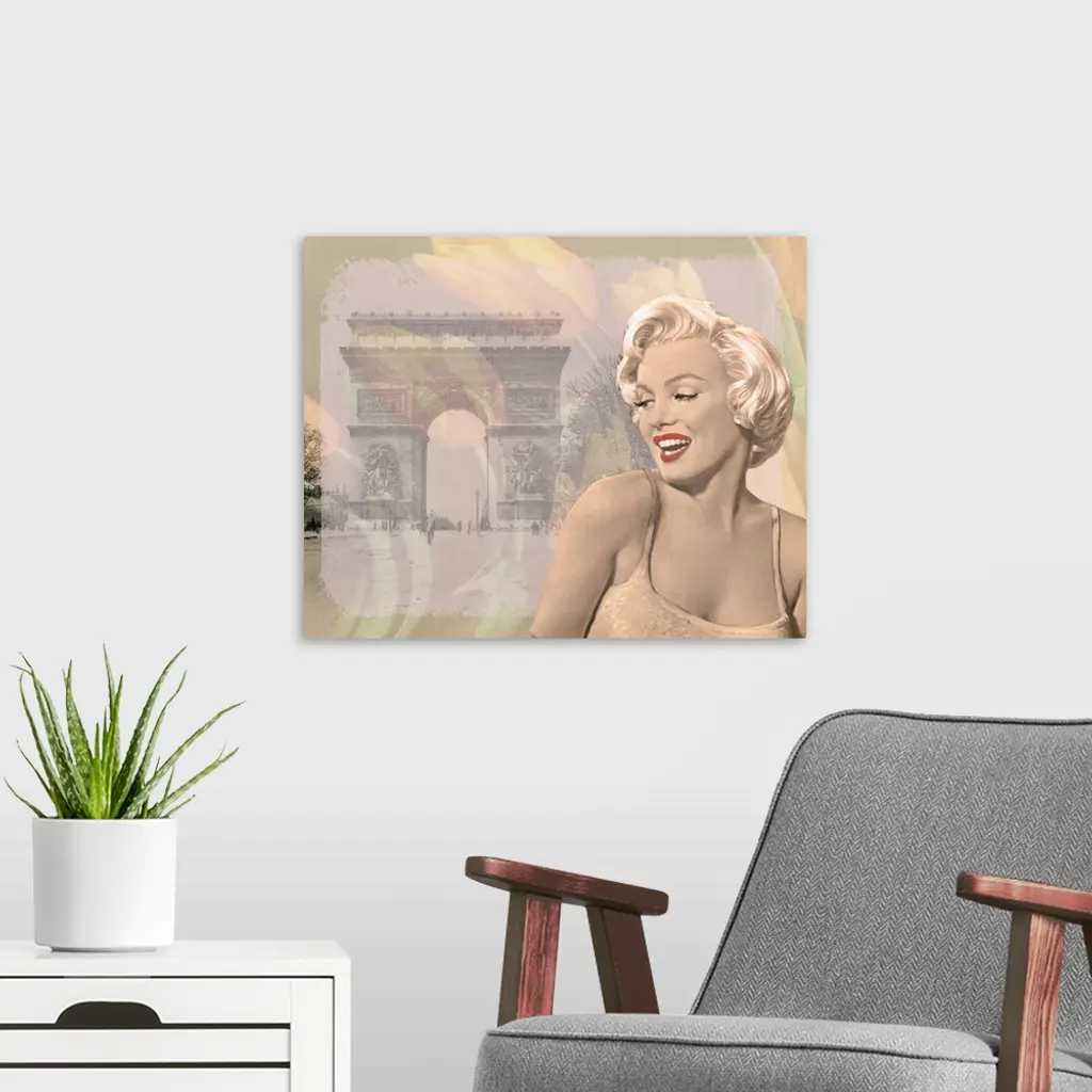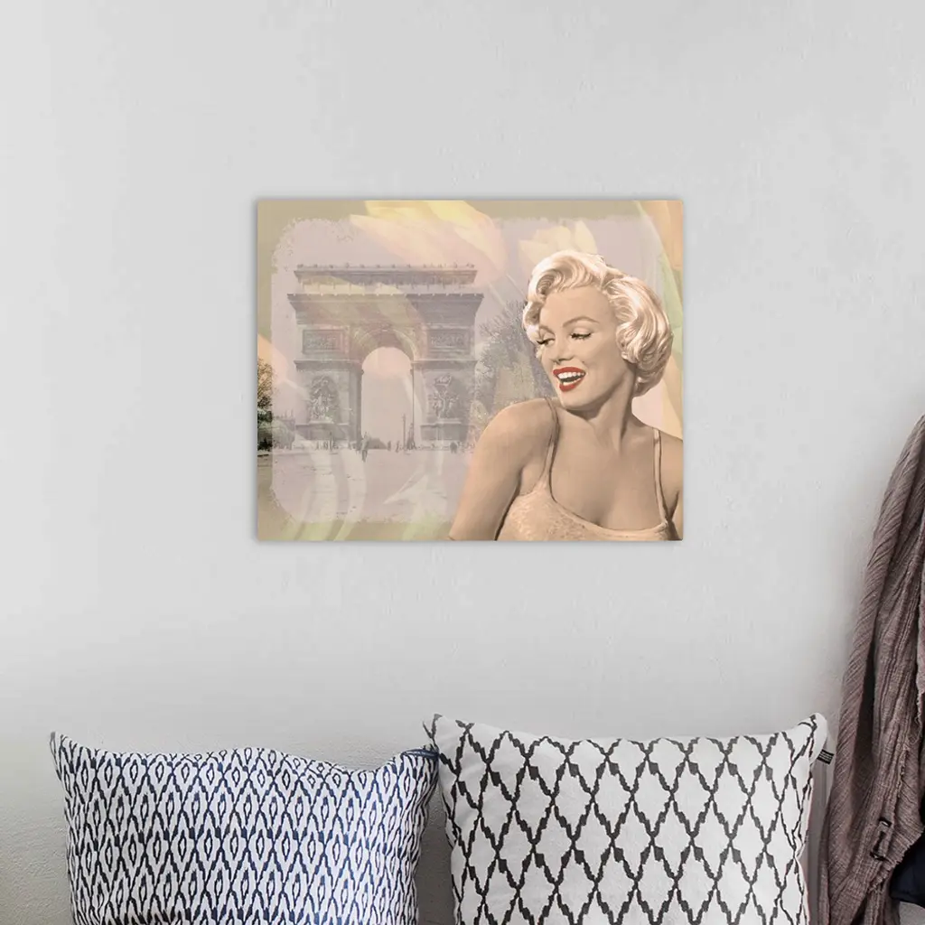 Inspired by the movie, Seven Year Itch, Marilyn Monroe looks elegantly over her shoulder with the Arc de Triomphe in the background.