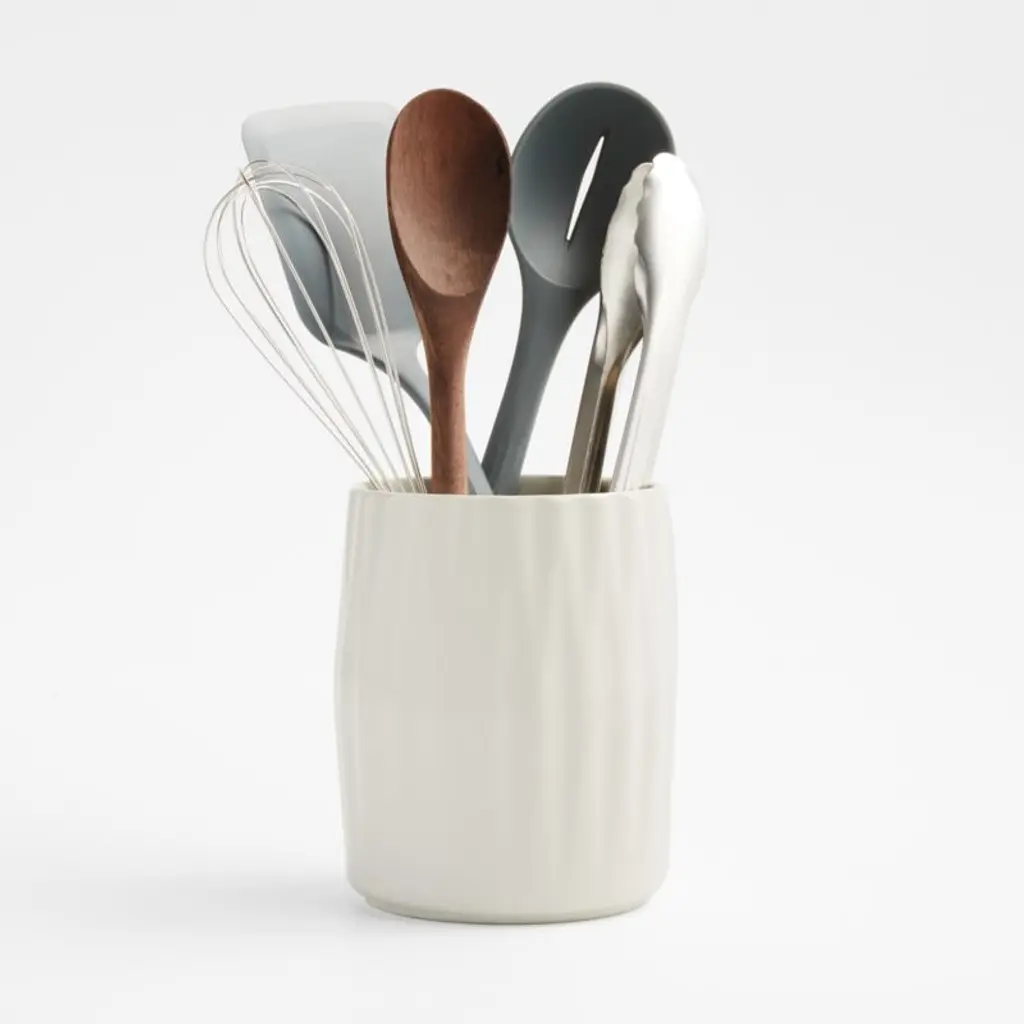 Made to complement our coveted Marin collection, this charming utensil holder exhibits the same artisanal, organic lines. The display-worthy stoneware vessel glazed glossy white holds essential cooking tools on the countertop or next to the stove and cleans up easily in the dishwasher. To complete the look, pair with our coordinating Marin storage canisters, dinnerware and serving pieces.