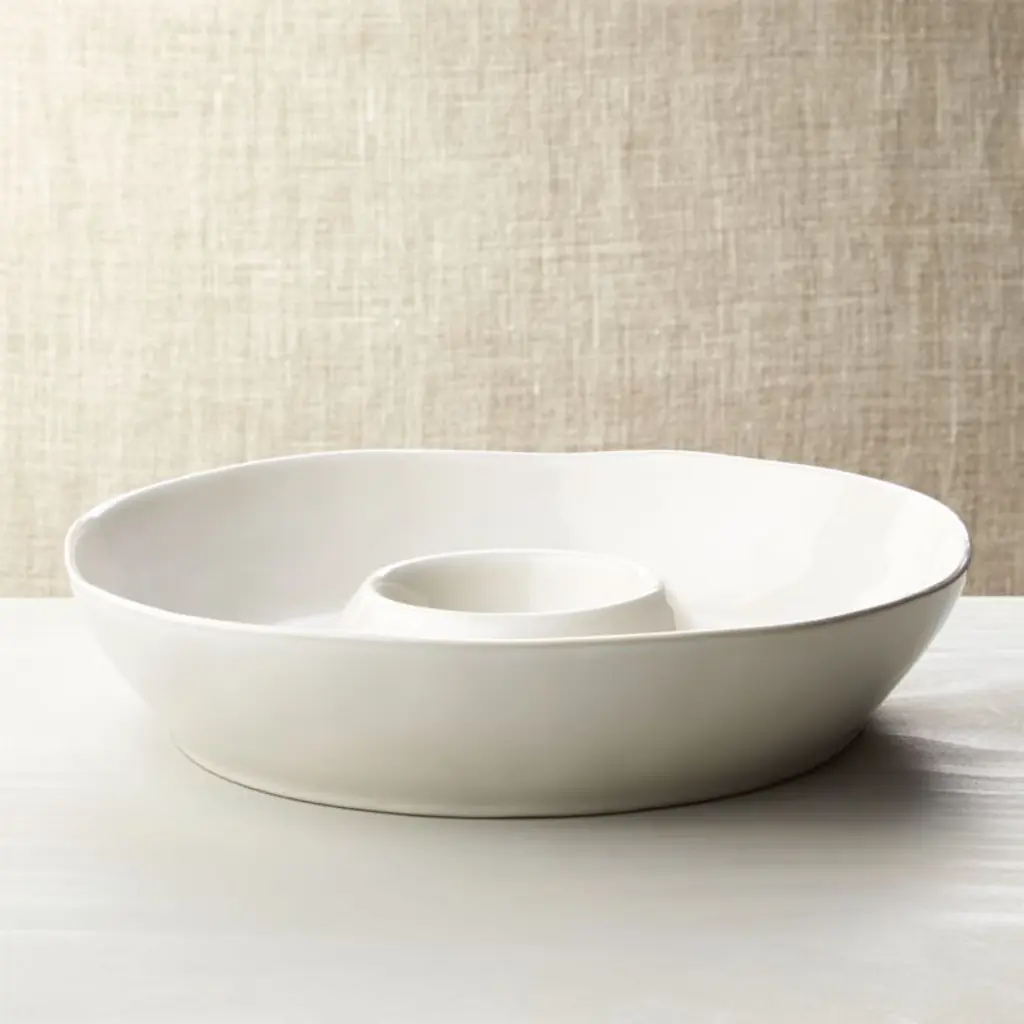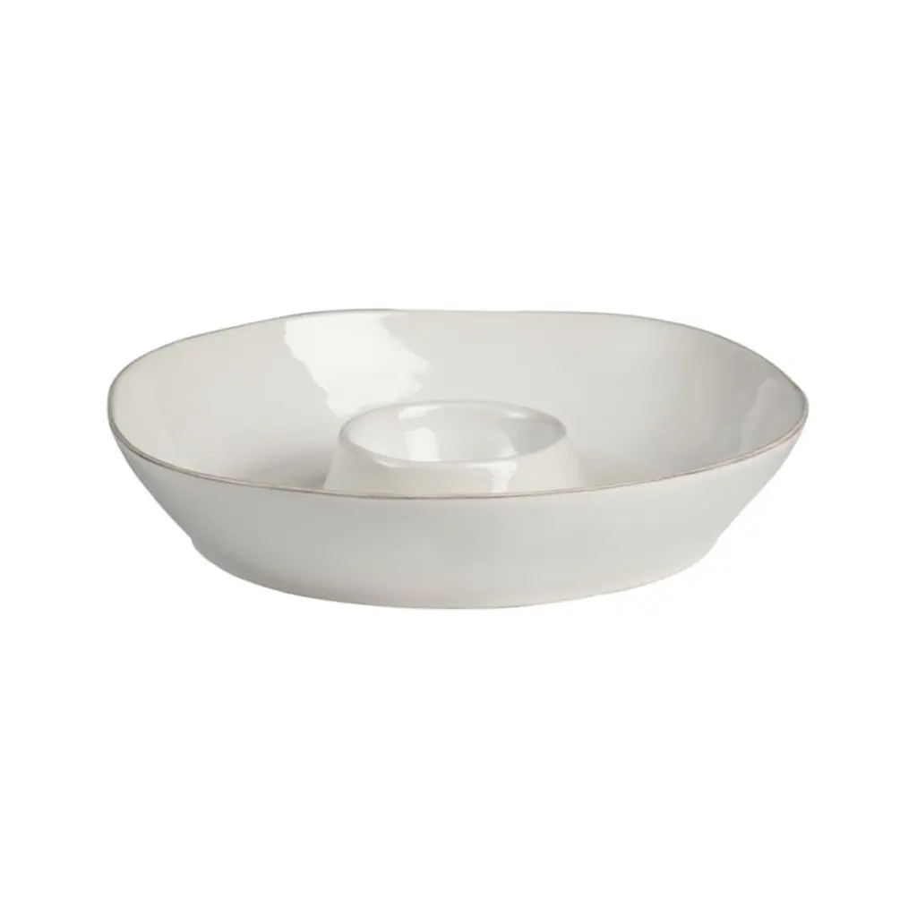 Artisanal ceramic chip and dip is glazed a soft white with subtle hand-antiquing on the freeform rims. Crafted by talented artisans, the oven-safe serving piece serves up chips and guacamole, pretzels and cheddar-beer dip or fruit and whipped cream cheese. Our exclusive chip and dip pairs perfectly with the rest of our coveted Marin dinnerware and serving collection.